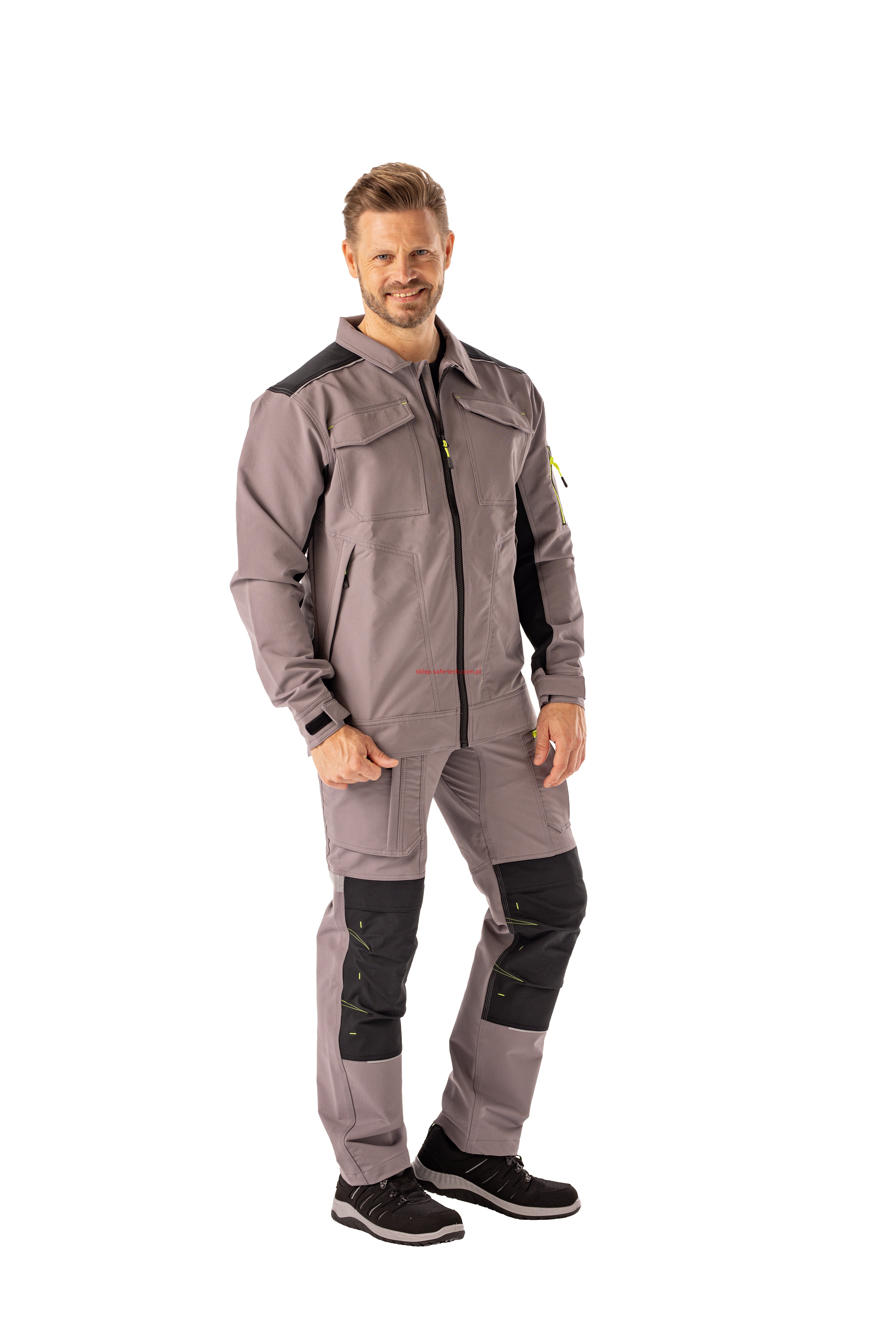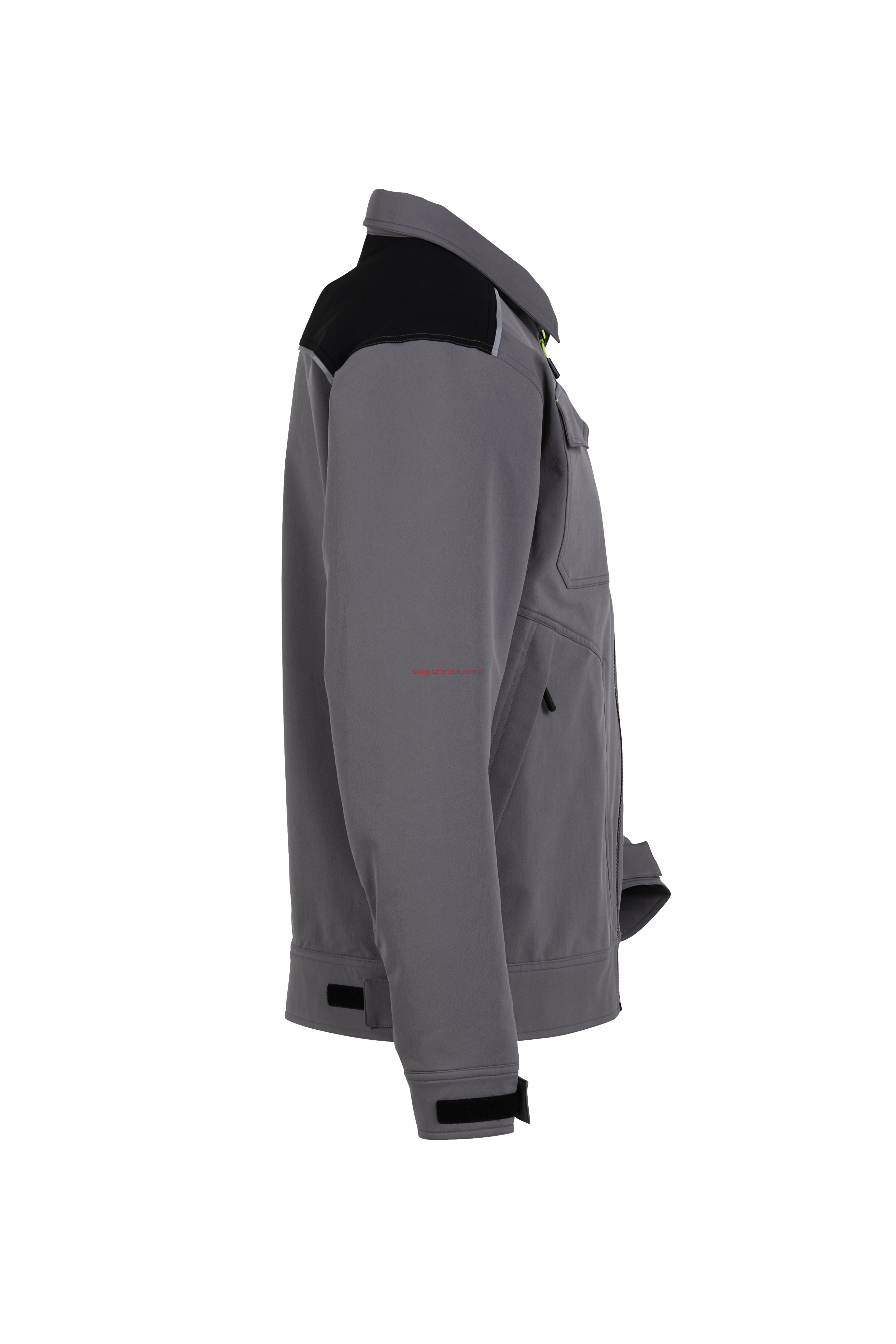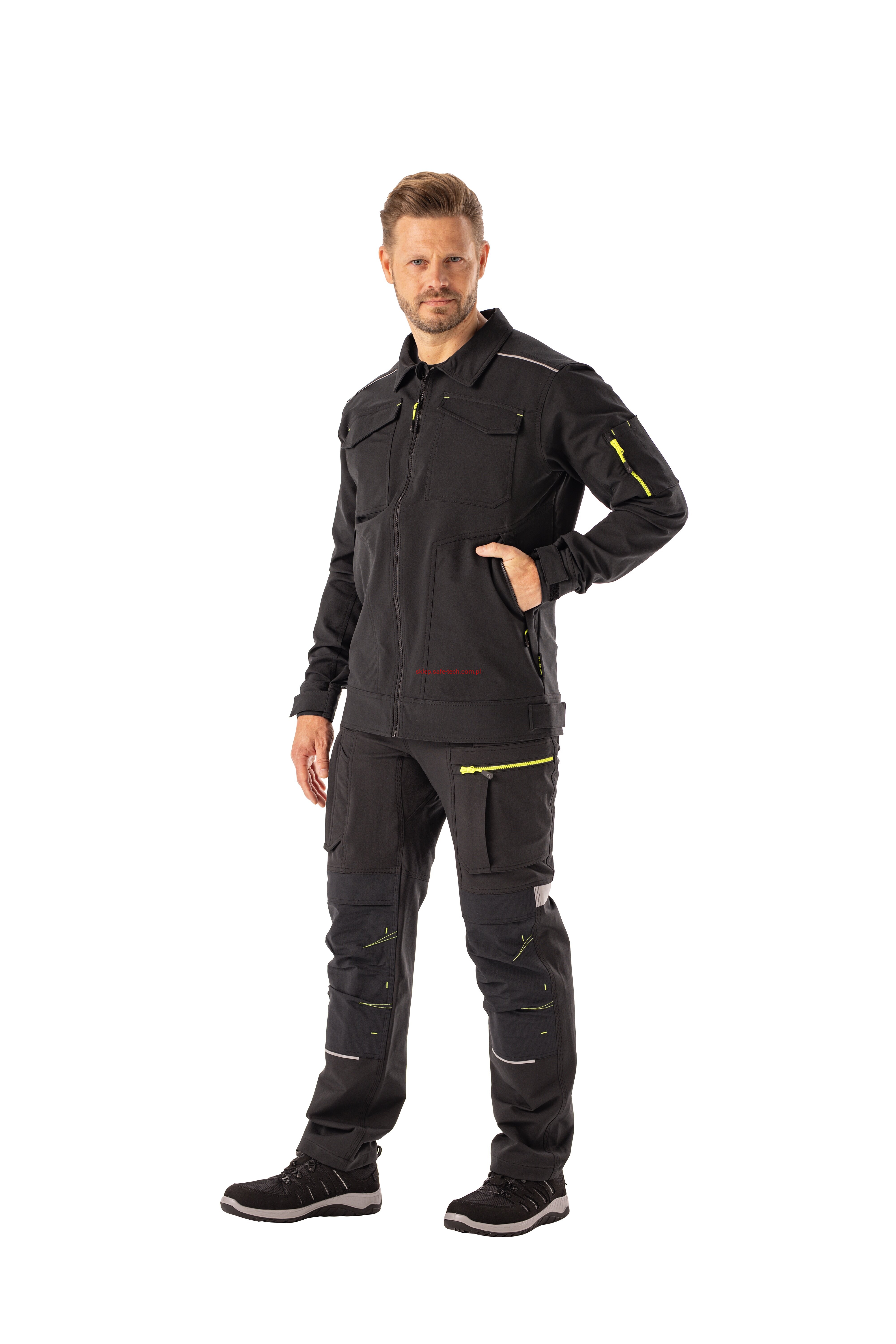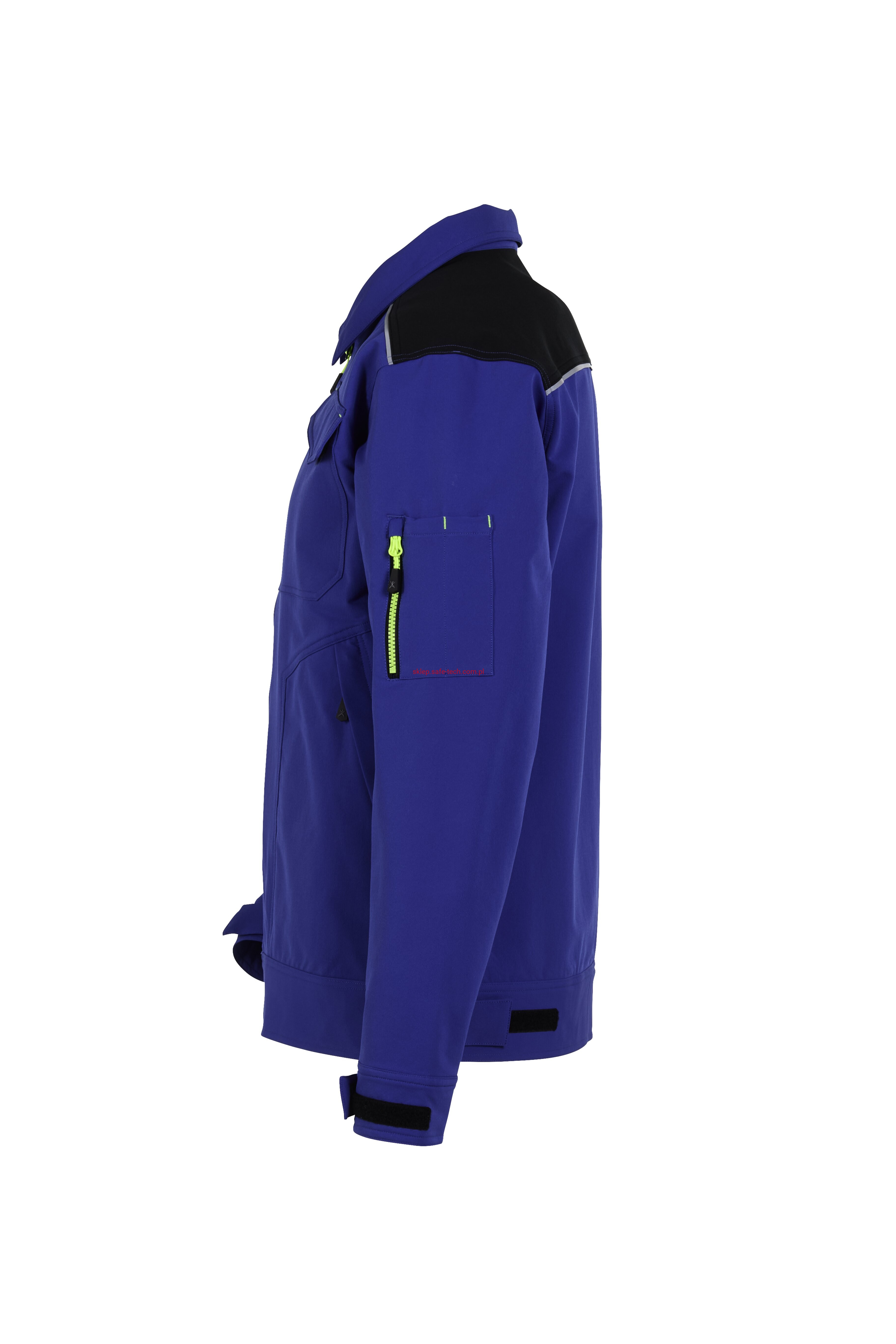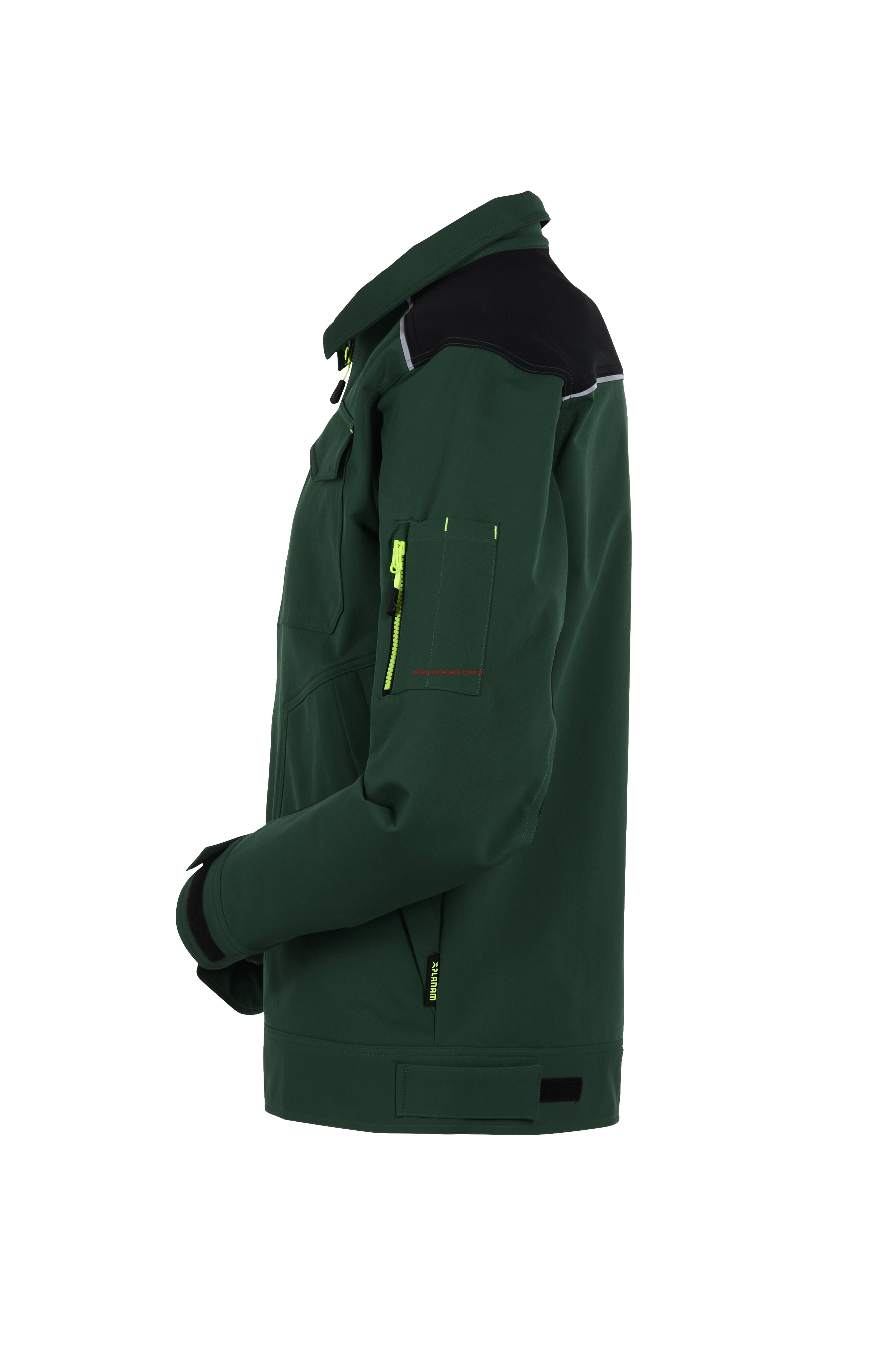 - z przodu kryty zamek błyskawiczny, 2 kieszenie na piersi z patką, 2 naszyte boczne kieszenie z zamkiem błyskawicznym, odblaskowe lamówki na ramionach i plecach, kieszeń na lewym rękawie z zamkiem błyskawicznym i 2 przegródkami na długopisy, regulowane mankiety i pas z zapięciem na rzepy.