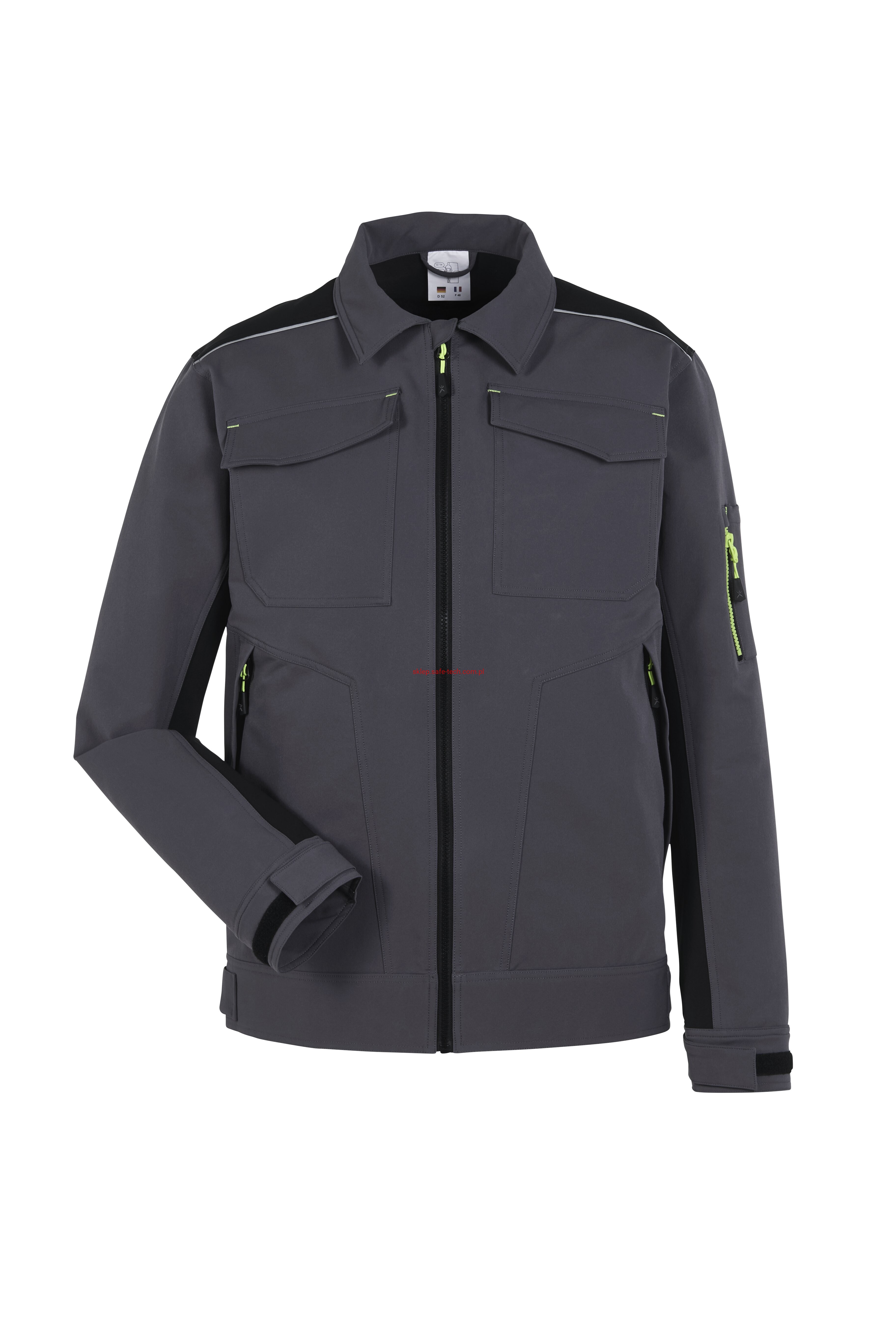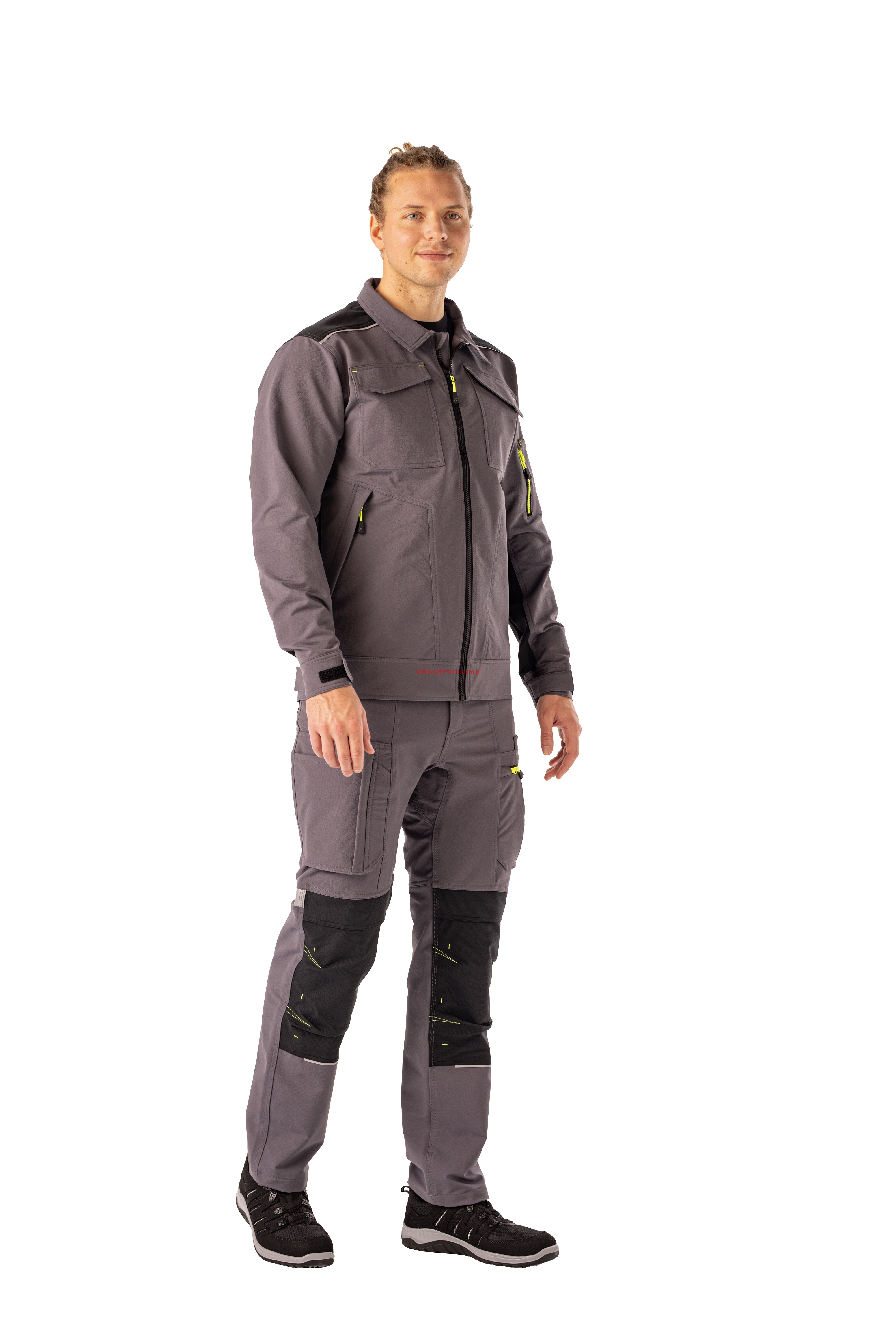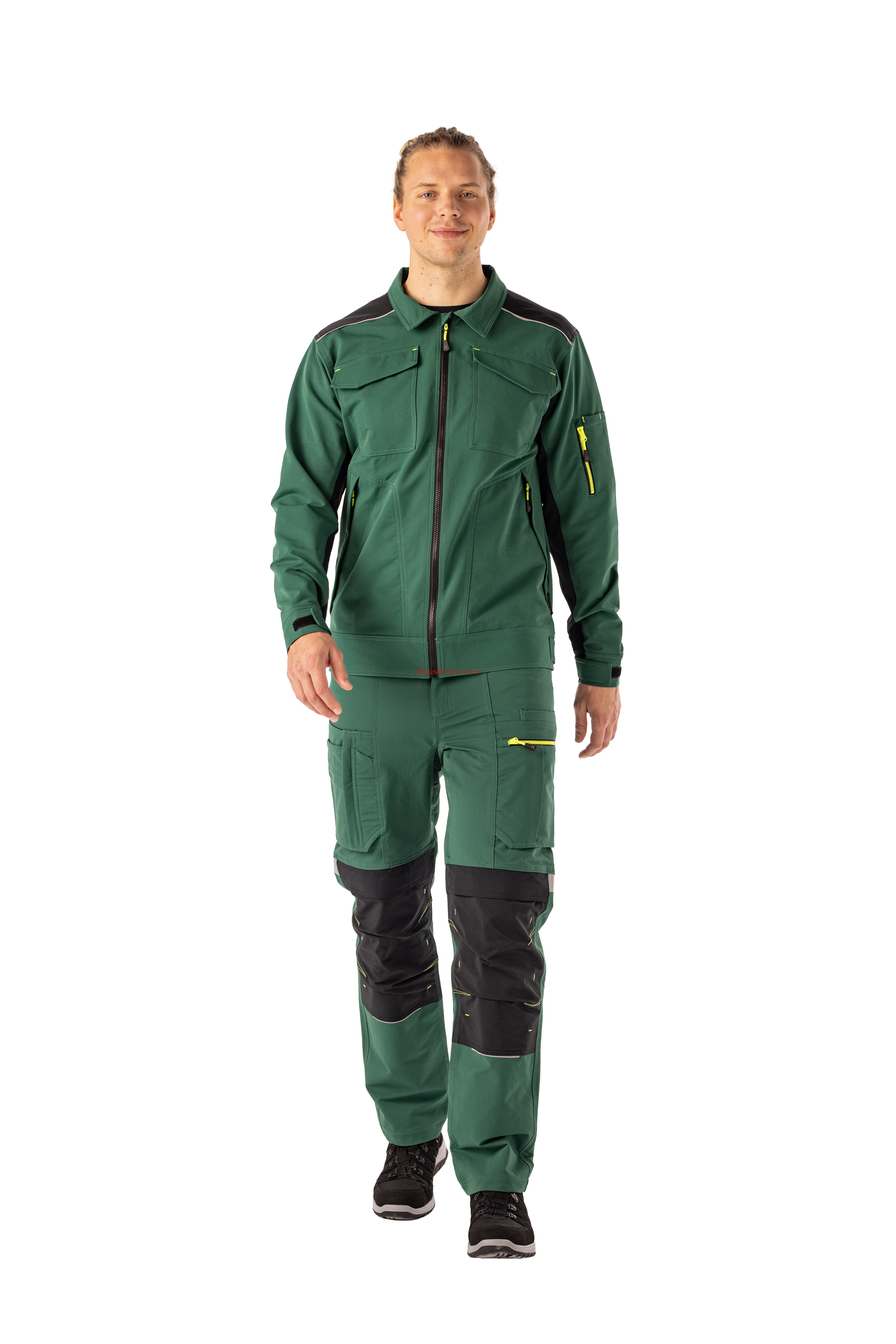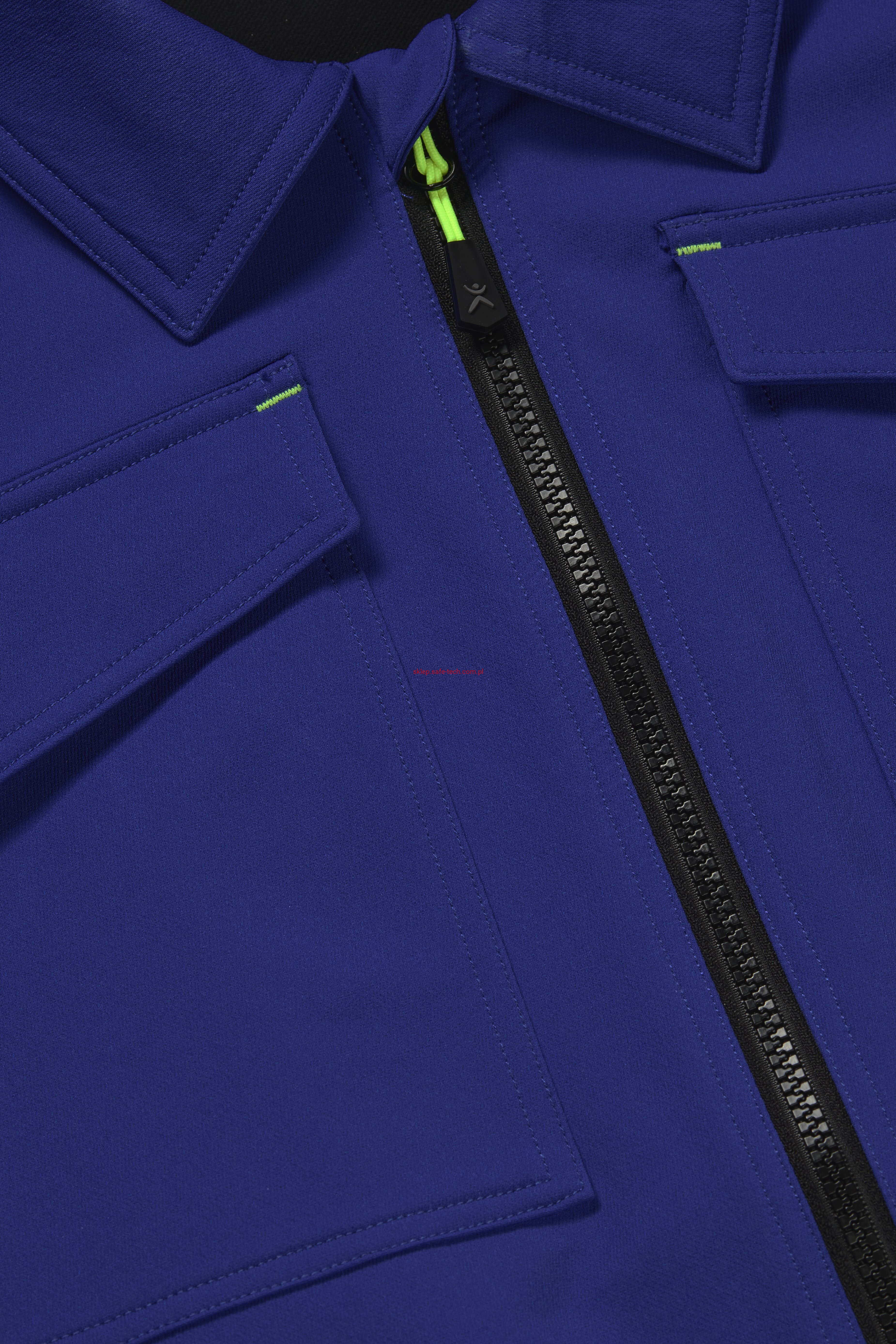 - z przodu kryty zamek błyskawiczny, 2 kieszenie na piersi z patką, 2 naszyte boczne kieszenie z zamkiem błyskawicznym, odblaskowe lamówki na ramionach i plecach, kieszeń na lewym rękawie z zamkiem błyskawicznym i 2 przegródkami na długopisy, regulowane mankiety i pas z zapięciem na rzepy.