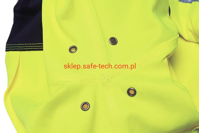 - kryty zamek z zatrzaskami do zapięcia patki, mankiety regulowane na zatrzask, poczwórne otwory wentylacyjne pod pachami, 2 kontrafałdy z tyłu, kołnierz wykładany, zawieszka na kołnierzu, zapinana w pasie, 2 naszyte boczne kieszenie, kieszeń na piersi z patką i zapięciem na rzepy, po lewej kieszeń na piersi z patką wraz z kieszenią na komórkę i przegród ką na długopis, podwójna kieszeń na lewym rękawie, 1 kieszeń wewnętrzna