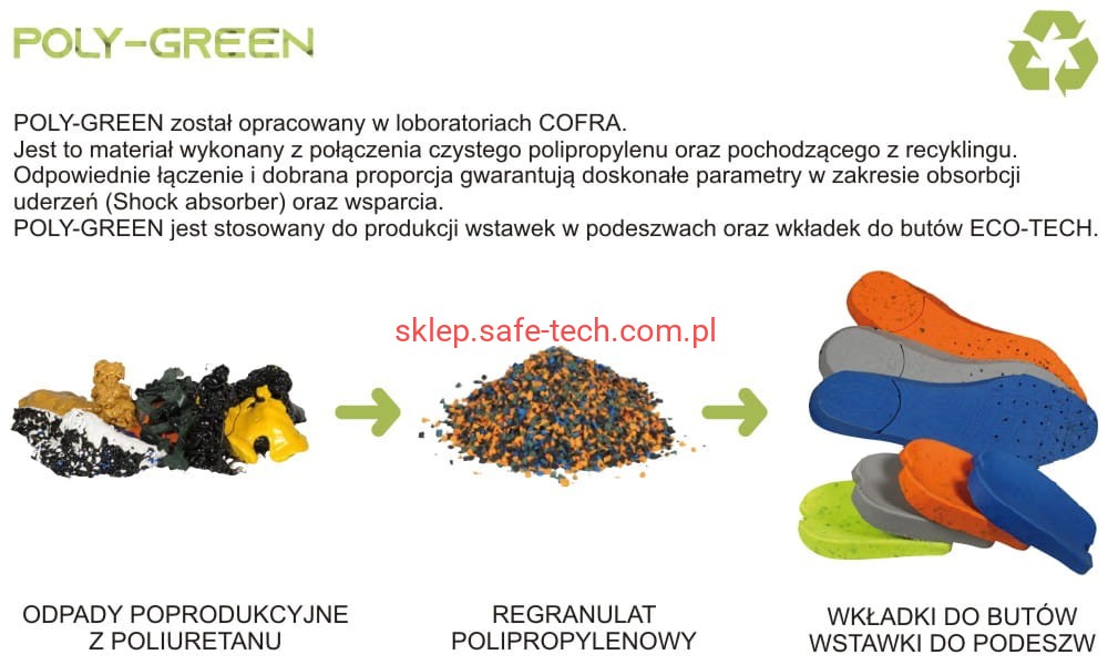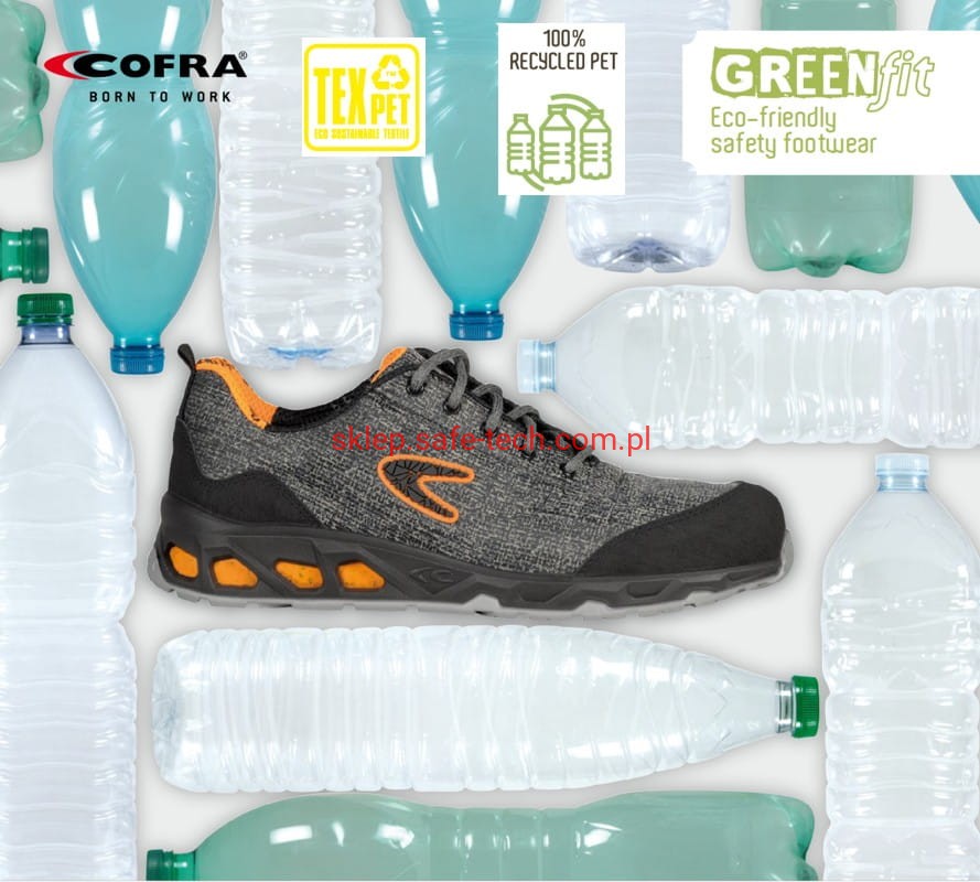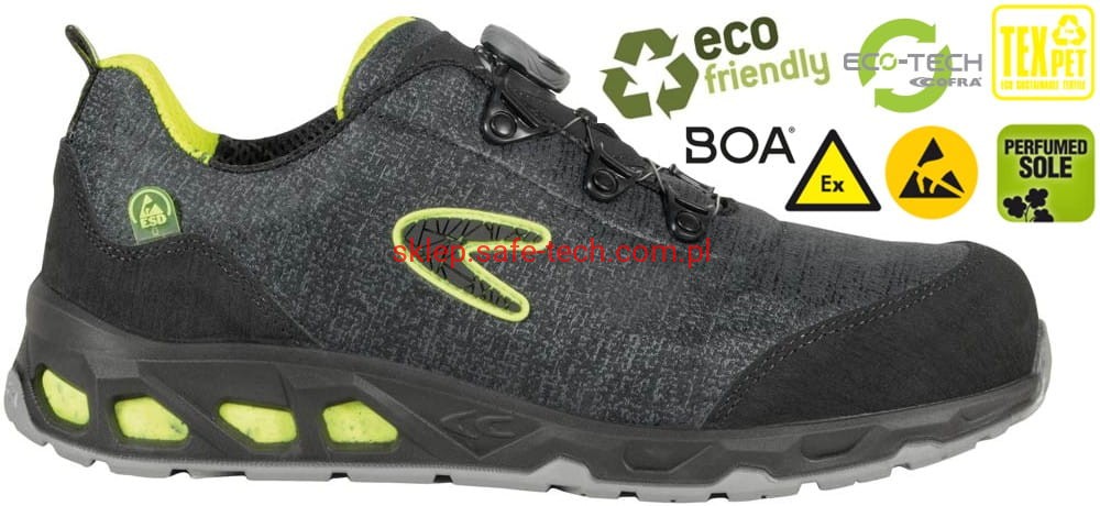Półbuty robocze z podnoskiem aluminiowym EARTH ESD S1PS FO SR włoskiej firmy Cofra. Linia ekologiczna Green Fit. Wkładka antyprzebiciowa kompozytowa, cholewka z tkaniny ekologicznej TEXPET 100% PET, podeszwa o niskiej oporności elektrycznej z PU/TPU z ekologicznymi wstawkami POLY-GREEN o bardzo dobrych właściwościach antypoślizgowych i odporności na ścieranie, wymienna anatomiczna wyściółka poduszkowa ECO-TECH ESD POLY GREEN, antyelektrostatyczna ESD o niskiej oporności elektrycznej, dziurkowana, miękka i wygodna, pokryta tkaniną dobrze pochłaniającą i odprowadzającą pot, podszewka oddychająca SANY-DRY®, antybakteryjna, dobrze pochłaniająca i odprowadzająca wilgoć, odporna na wytarcia. Ochraniacz ze skóry przeciw otarciom na nosku.