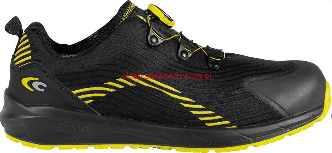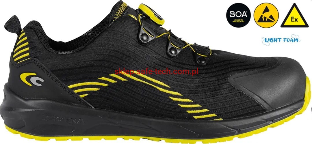 Półbuty robocze YARD ESD S3S FO SR włoskiej firmy Cofra z podnoskiem aluminiowym, antyelektrostatyczne ESD, rekomendowane do pracy w strefach zagrożonych wybuchem (ATEX) i przemyśle elektronicznym, wkładka antyprzebiciowa kompozytowa, cholewka z oddychającej tkaniny skorupowej Techshell (nowatorska technologia jednego kawałka bez szwów), podeszwa z TPU o bardzo dobrych właściwościach antypoślizgowych, wymienna anatomiczna wyściółka poduszkowa MEMORY PLUS która dzięki specjalnej warstwie sprężystej pianki w części środkowej natychmiast dopasowuje się do kształtu stopy. Podszewka oddychająca SANY-DRY®, antybakteryjna, dobrze pochłaniająca i odprowadzająca wilgoć, odporna na wytarcia. System wiązania Boa na pokrętło.