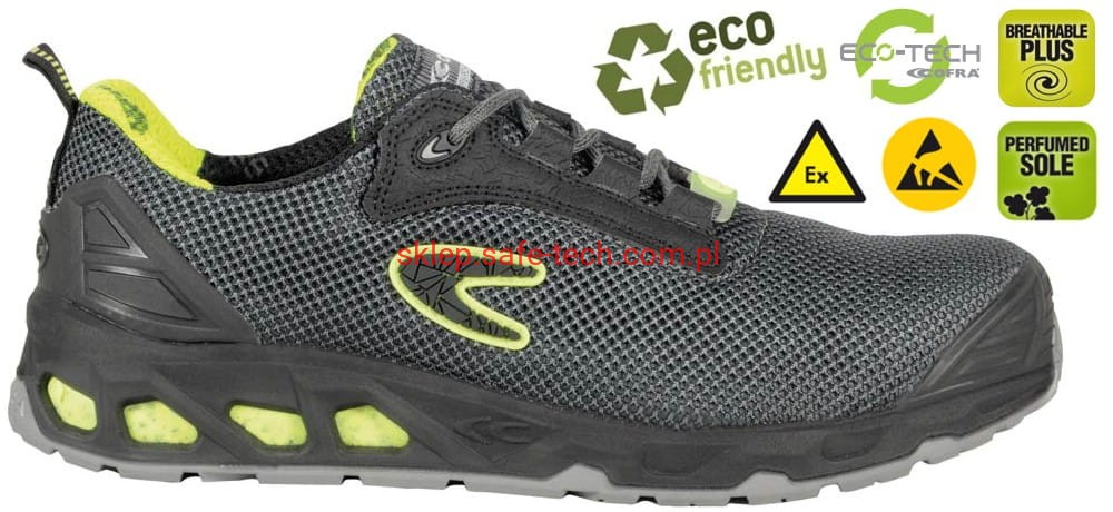 Półbuty robocze z podnoskiem aluminiowym EARTH ESD S1PS FO SR włoskiej firmy Cofra. Linia ekologiczna Green Fit. Wkładka antyprzebiciowa kompozytowa, cholewka z tkaniny ekologicznej TEXPET 100% PET, podeszwa o niskiej oporności elektrycznej z PU/TPU z ekologicznymi wstawkami POLY-GREEN o bardzo dobrych właściwościach antypoślizgowych i odporności na ścieranie, wymienna anatomiczna wyściółka poduszkowa ECO-TECH ESD POLY GREEN, antyelektrostatyczna ESD o niskiej oporności elektrycznej, dziurkowana, miękka i wygodna, pokryta tkaniną dobrze pochłaniającą i odprowadzającą pot, podszewka oddychająca SANY-DRY®, antybakteryjna, dobrze pochłaniająca i odprowadzająca wilgoć, odporna na wytarcia. Ochraniacz ze skóry przeciw otarciom na nosku.