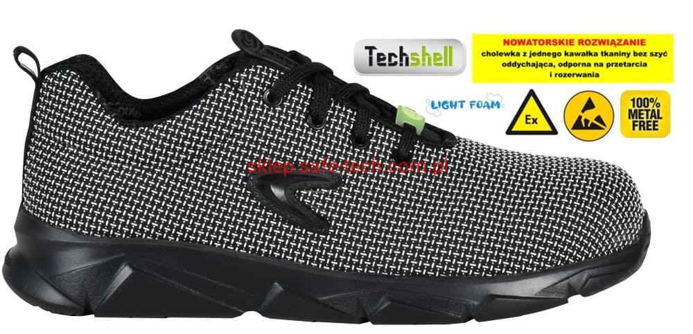Półbuty robocze SNAPPING ESD S3S FO SR włoskiej firmy Cofra. Antyelektrostatyczne ESD, rekomendowane do pracy w strefach zagrożonych wybuchem (ATEX) i przemyśle elektronicznym. Podnosek aluminiowy, wkładka antyprzebiciowa kompozytowa, cholewka z wodoodpornej, oddychającej, odpornej na przetarcia i rozerwanie tkaniny skorupowej TECHSHELL. Podeszwa z PU/TPU o niskiej oporności elektrycznej, bardzo dobrych właściwościach antypoślizgowych i odporności na ścieranie. Wymienna anatomiczna wyściółka poduszkowa Food-Pad o niskiej rezystencji elektrycznej, samoformująca się. Podszewka oddychająca SANY-DRY®, antybakteryjna, dobrze pochłaniająca i odprowadzająca wilgoć, odporna na wytarcia. Ochraniacz z TPU przeciw otarciom na nosku. Bardzo lekkie, waga ok. 500 gram (rozmiar 42). System wiązania BOA® na pokrętło.