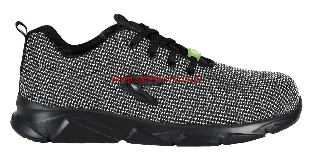 Półbuty robocze z podnoskiem aluminiowym EARTH ESD S1PS FO SR włoskiej firmy Cofra. Linia ekologiczna Green Fit. Wkładka antyprzebiciowa kompozytowa, cholewka z tkaniny ekologicznej TEXPET 100% PET, podeszwa o niskiej oporności elektrycznej z PU/TPU z ekologicznymi wstawkami POLY-GREEN o bardzo dobrych właściwościach antypoślizgowych i odporności na ścieranie, wymienna anatomiczna wyściółka poduszkowa ECO-TECH ESD POLY GREEN, antyelektrostatyczna ESD o niskiej oporności elektrycznej, dziurkowana, miękka i wygodna, pokryta tkaniną dobrze pochłaniającą i odprowadzającą pot, podszewka oddychająca SANY-DRY®, antybakteryjna, dobrze pochłaniająca i odprowadzająca wilgoć, odporna na wytarcia. Ochraniacz ze skóry przeciw otarciom na nosku.
