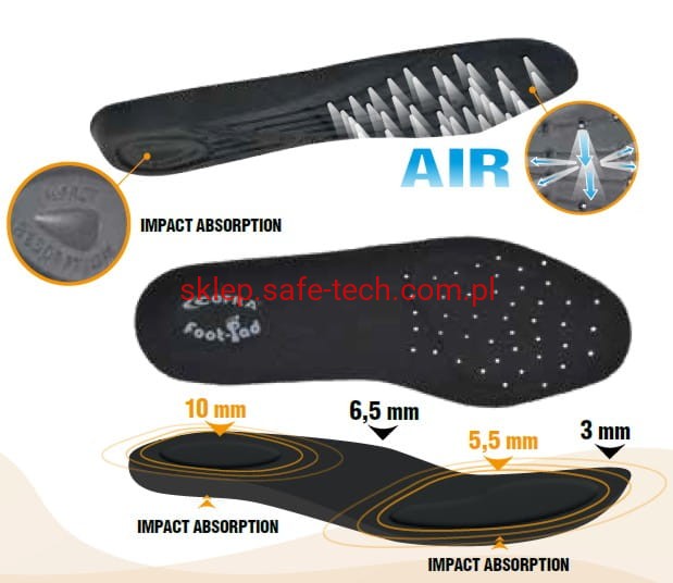- wymienna anatomiczne wkładki poduszkowe FOOD-PAD, ekstremalnie miękkie i wygodne. Dzięki poliuretanowi o bardzo niskiej gęstości wkładki samo formułują się zapewniając odpowiedni rozkład nacisku w zależności od wagi ciała i dając natychmiastowe uczucie wygody. Bardzo dobry tłumik uderzeń (shock absorber) dzięki odpornemu materiałowi i poduszce w części środkowej pięty oraz dodatkowej poduszce w części śródstopia. Otulające profile boczne wspierają stopę również podczas mimowolnych ruchów bocznych. Dzięki dziurkom w części przedniej oraz powlekanej tkaninie zapewniają dobrą cyrkulację powietrza, oddychalność, dobre odprowadzanie wilgoci i higienę. Anatomiczne o zróżnicowanej grubości (10 mm przy pięcie, 6,5 mm w części środkowej i 3 mm przy palcach).