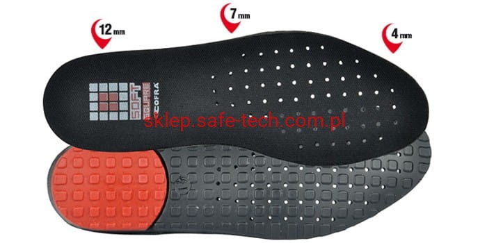 - wyściółka SOFT SQUARE, anatomiczna, antystatyczna, wykonana z miękkiego PU , wstawka żelowa w pięcie, zapewnia dobrą stabilność dzięki zróżnicowanej grubości (12 mm w pięcie)