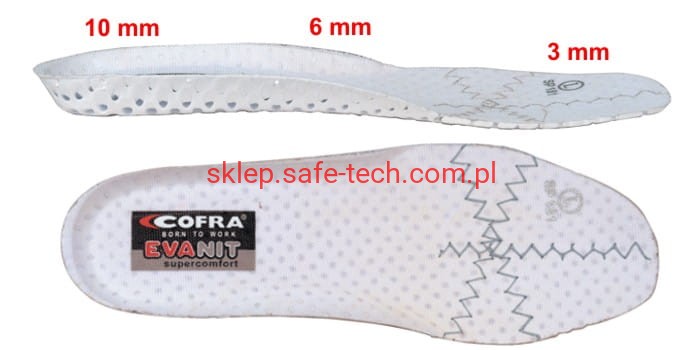 - wyściółka EVANIT wykonana z EVA i nitrylu, antystatyczna, anatomiczna o zróżnicowanej grubości (12 - 8 - 3,8 mm), dziurkowana, pokryta tkaniną o wysokiej oddychalności