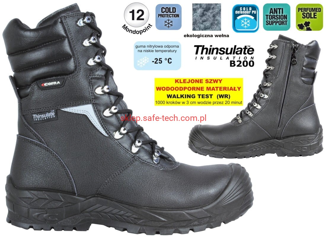 Trzewiki wysokie robocze ocieplane NEW MOZAMBICO UK S3S CI HRO SC LG FO SR włoskiej firmy Cofra. Podnosek kompozytowy, wkładka antyprzebiciowa kompozytowa, cholewka z wodoodpornej skóry tłoczonej, podszewka ocieplająca z wełny ekologicznej plus włóknina ocieplająca THINSULATETM B200, podeszwa z gumy nitrylowej odpornej na wysokie temp. do 3000 C (HRO) i niskie do - 250C, wymienna anatomiczna wyściółka poduszkowa EVANIT, stabilizator z poliwęglanu i włókna szklanego w podeszwie zapobiegający jej skręcaniu i zginaniu w części śródstopia, ochraniacz z PU przeciw otarciom na nosku. Zamek z boku ułatwiający zakładanie i zdejmowanie.