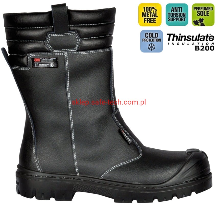 Trzewiki wysokie robocze ocieplane NEW MOZAMBICO UK S3S CI HRO SC LG FO SR włoskiej firmy Cofra. Podnosek kompozytowy, wkładka antyprzebiciowa kompozytowa, cholewka z wodoodpornej skóry tłoczonej, podszewka ocieplająca z wełny ekologicznej plus włóknina ocieplająca THINSULATETM B200, podeszwa z gumy nitrylowej odpornej na wysokie temp. do 3000 C (HRO) i niskie do - 250C, wymienna anatomiczna wyściółka poduszkowa EVANIT, stabilizator z poliwęglanu i włókna szklanego w podeszwie zapobiegający jej skręcaniu i zginaniu w części śródstopia, ochraniacz z PU przeciw otarciom na nosku. Zamek z boku ułatwiający zakładanie i zdejmowanie.