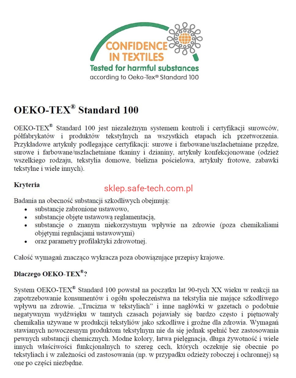 - materiał: 65% poliester, 35% bawełna, ok. 230 g/m2, splot diagonalny, ochrona przed przetarciem i zbieganiem wg DIN EN ISO 6330