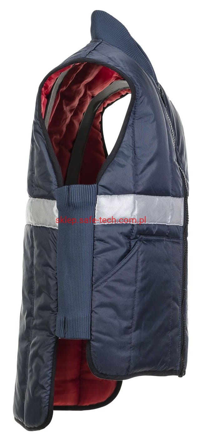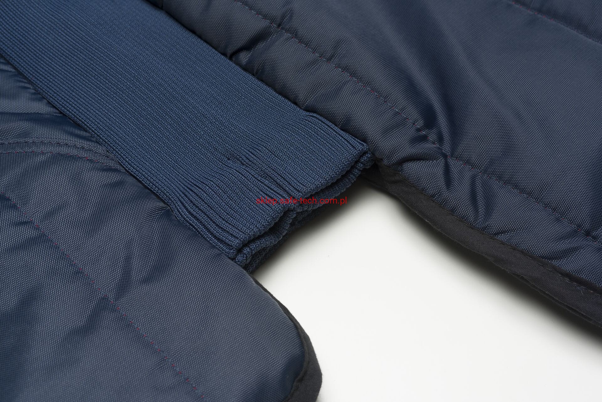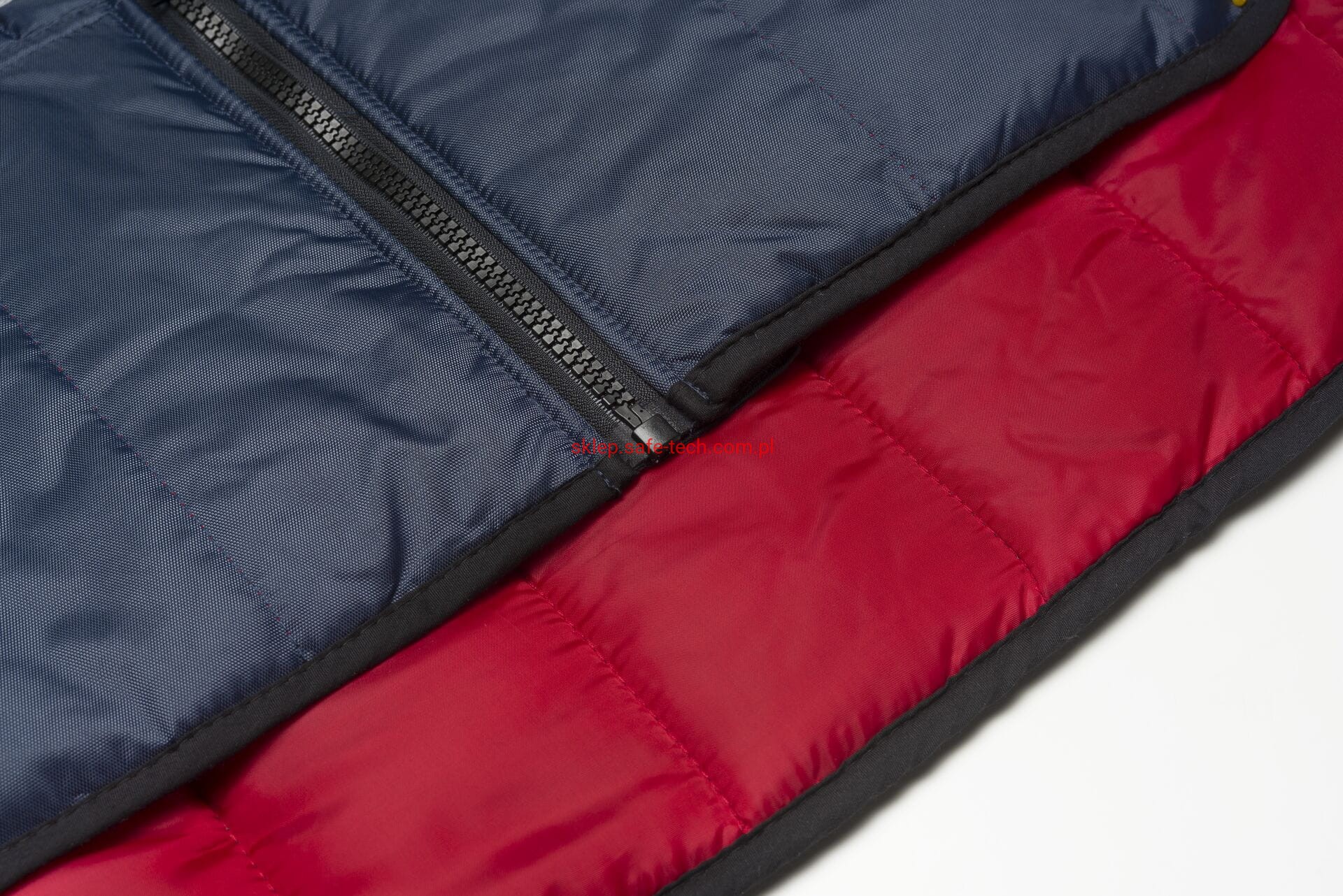 - kryty zamek błyskawiczny z przodu na całej długości, 1 kieszeń po lewej stronie na piersi, 2 boczne kieszenie, przedłużony tył, wstawki ze stretchu po bokach, taśma odblaskowa w pasie.