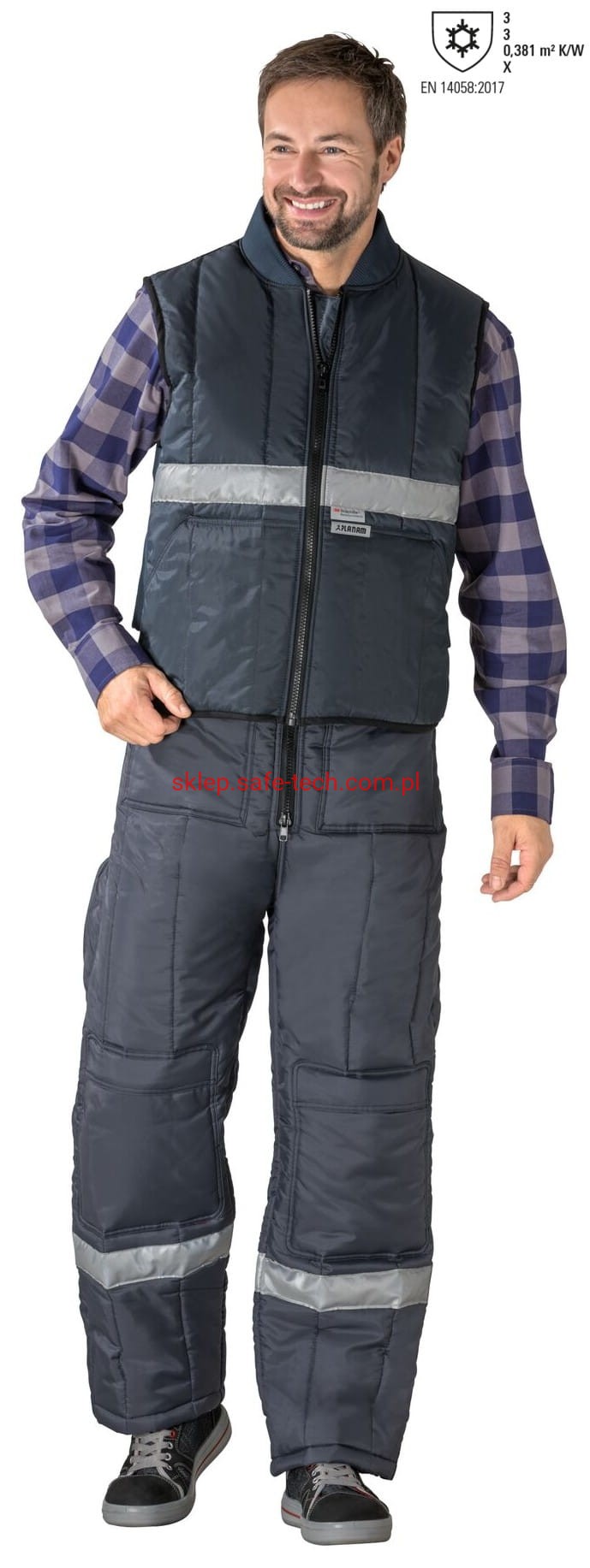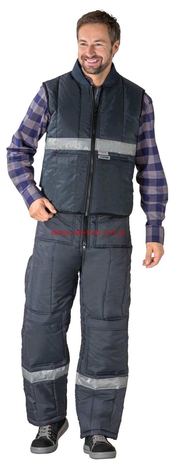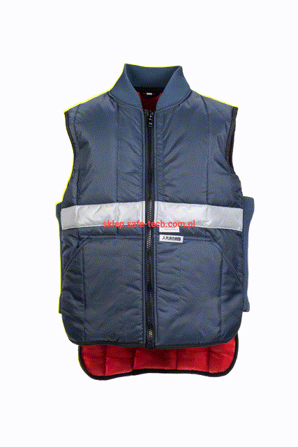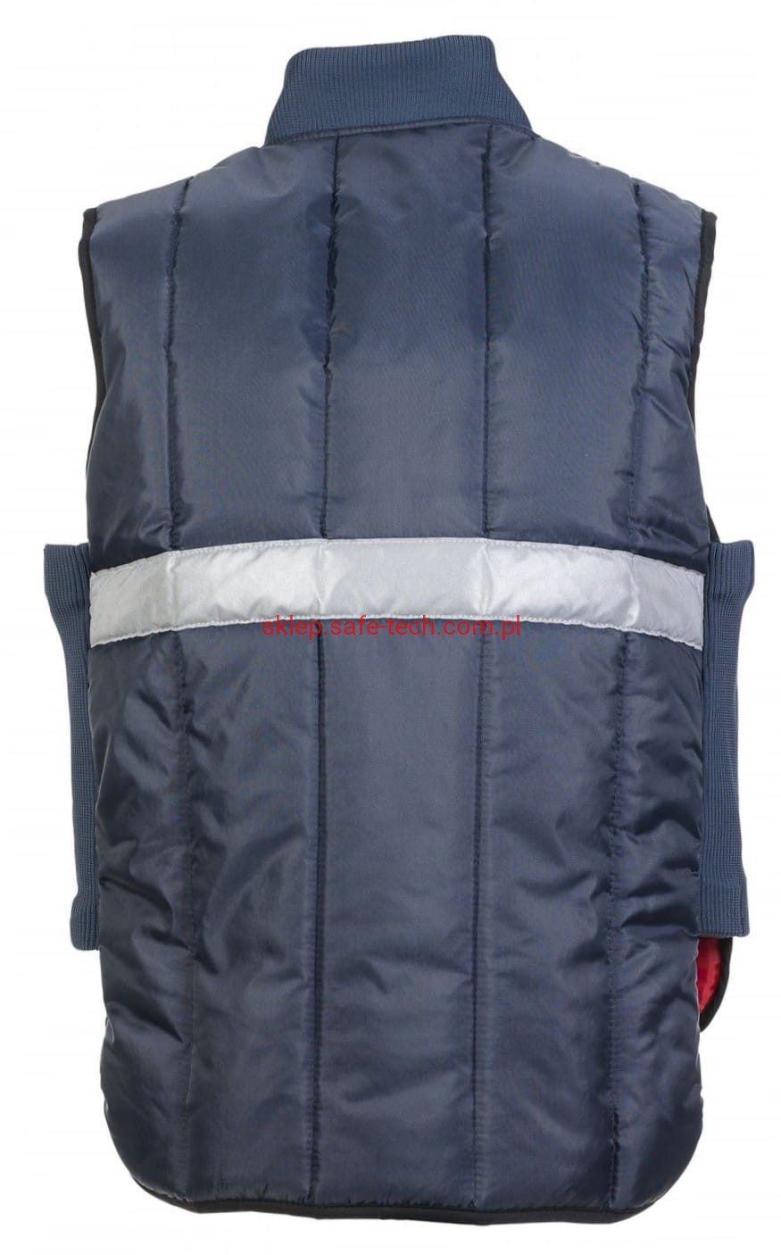 - kryty zamek błyskawiczny z przodu na całej długości, 1 kieszeń po lewej stronie na piersi, 2 boczne kieszenie, przedłużony tył, wstawki ze stretchu po bokach, taśma odblaskowa w pasie.
