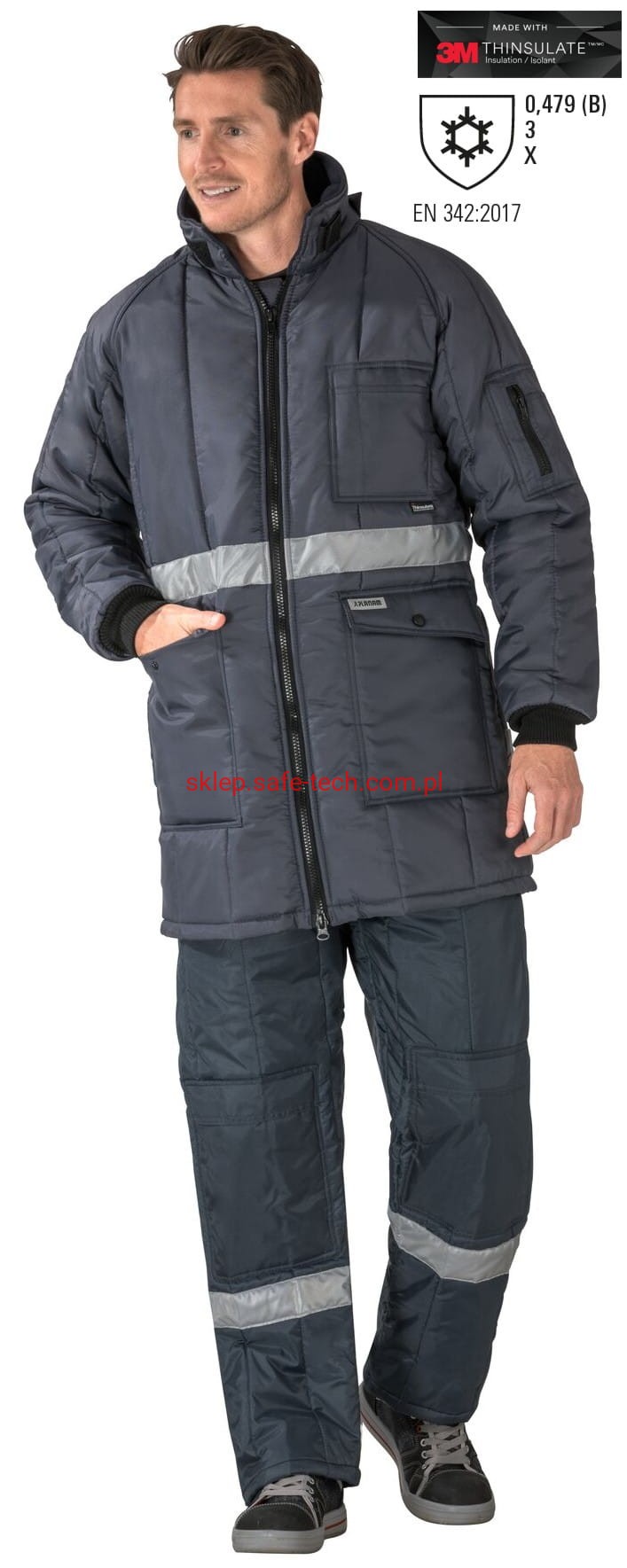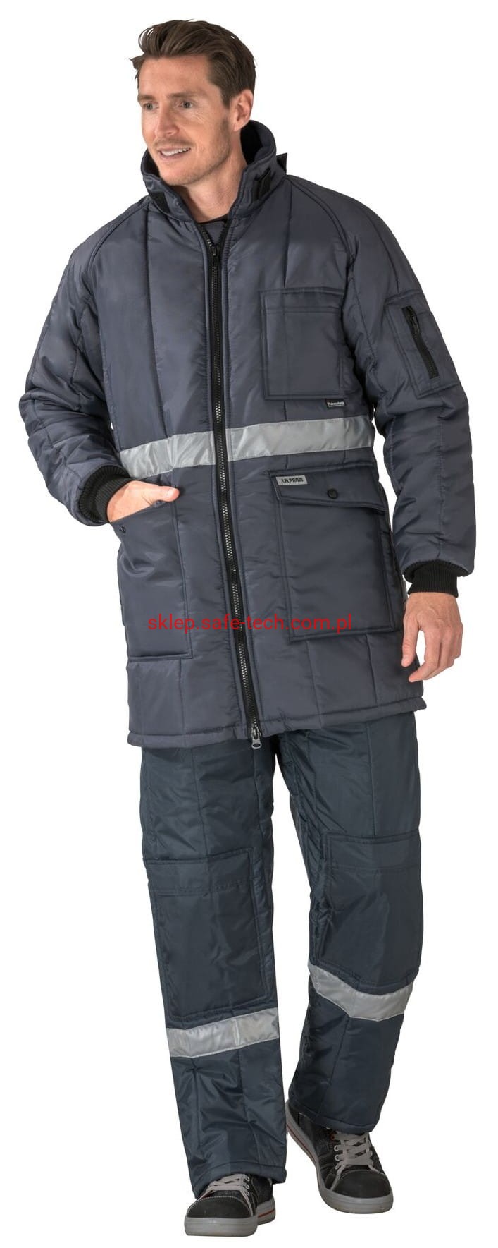 - kryty zamek błyskawiczny z przodu na całej długości, 1 kieszeń po lewej stronie na piersi, 2 naszyte kieszenie po boczne z patkami, kieszeń na rękawie po lewej stronie z zamkiem błyskawicznym, taśma odblaskowa w pasie, ściągacze z dzianiny przy rękawach i w pasie.