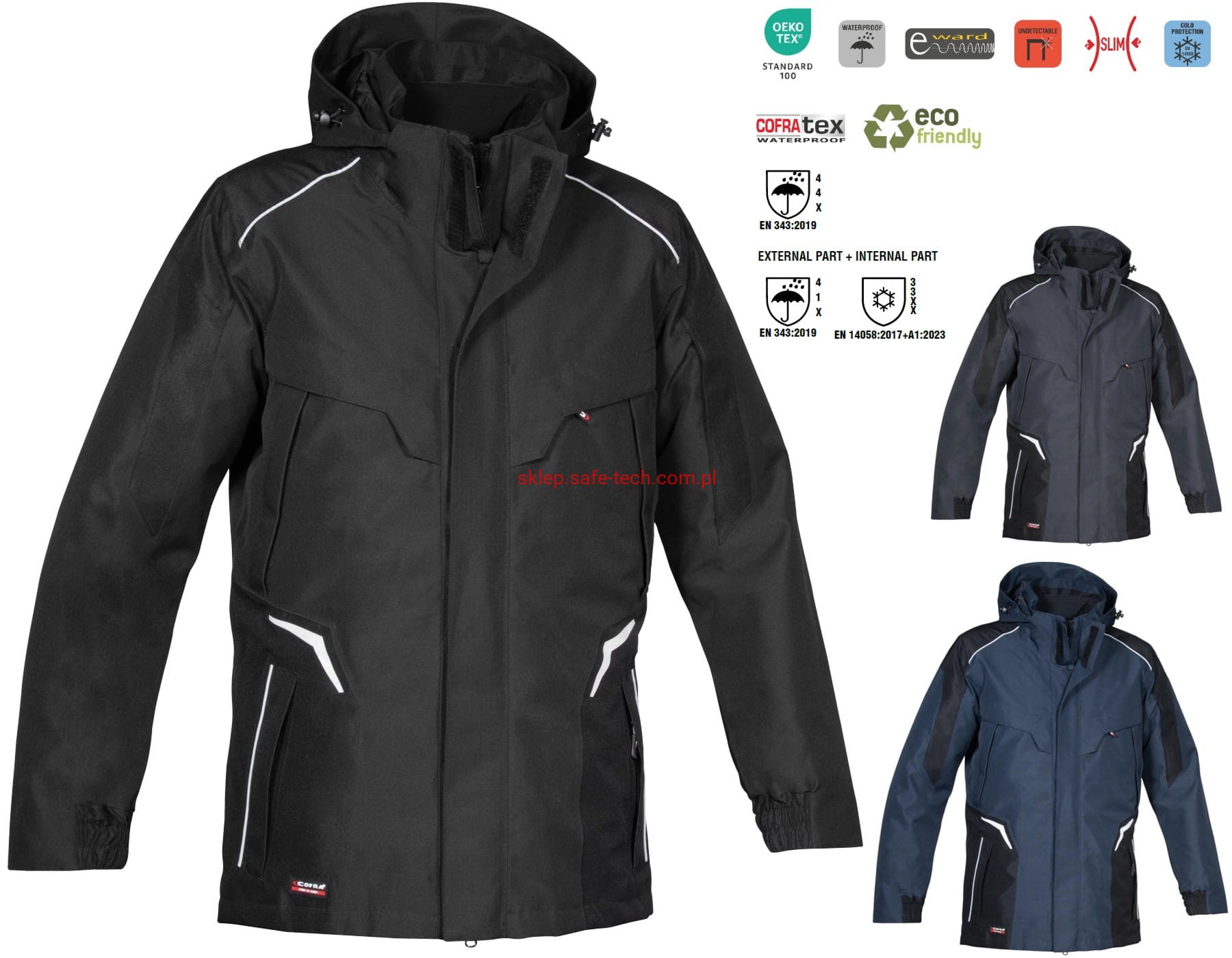 - EN 343:2019 (część zewnętrzna: najwyższy poziom 4 na przenikanie wody (wodoodporność), najwyższy poziom 4 na przenikanie pary(przewiewność))