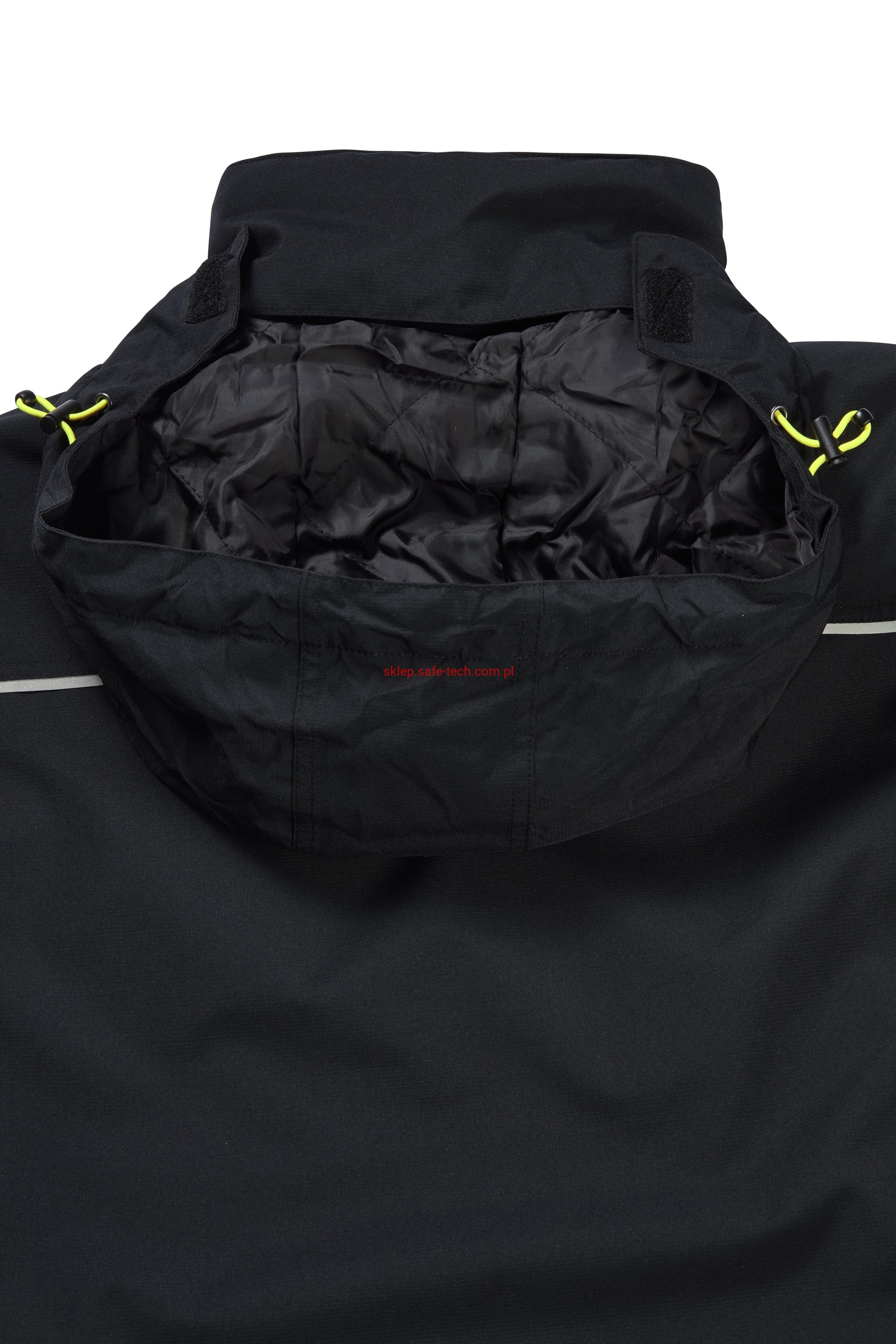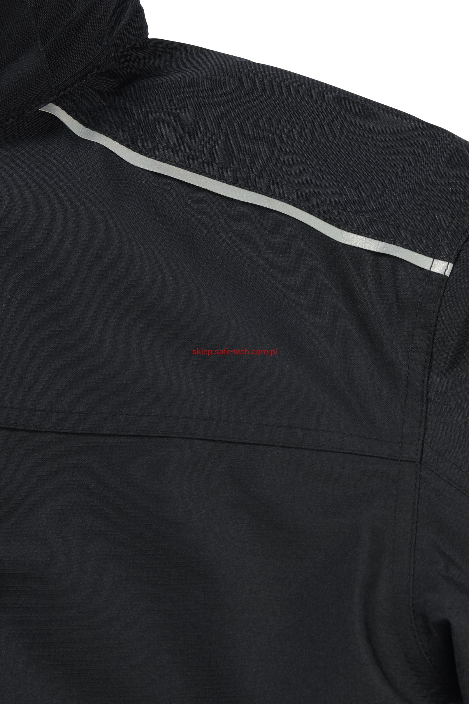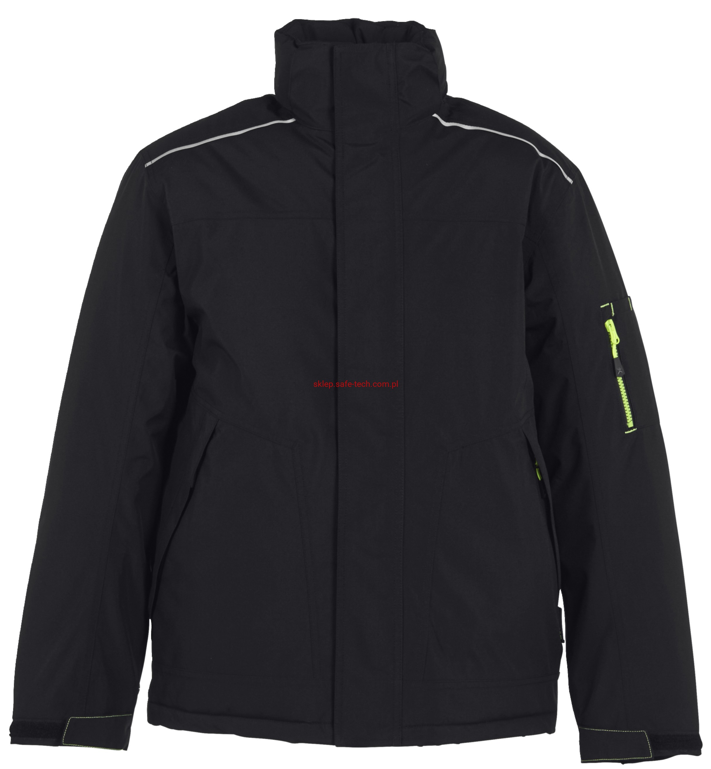- 2 zakryte kieszenie boczne z zamkiem błyskawicznym, 1 kieszeń na piersi z zamkiem błyskawicznym, kaptur z możliwością regulacji, z przodu kryty zamek błyskawiczny, elastyczne mankiety, szerokość w pasie regulowana, odblaskowe wstawki