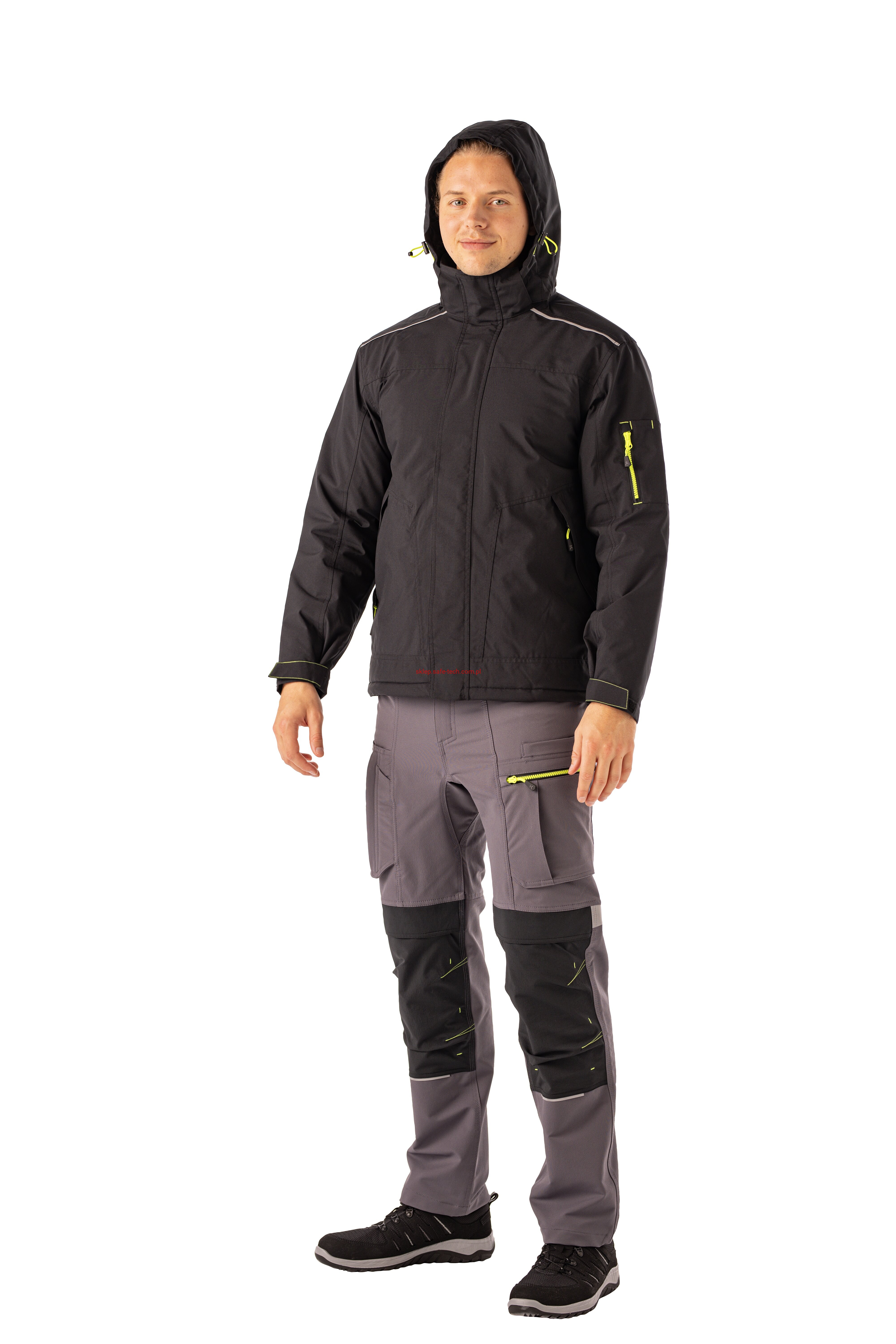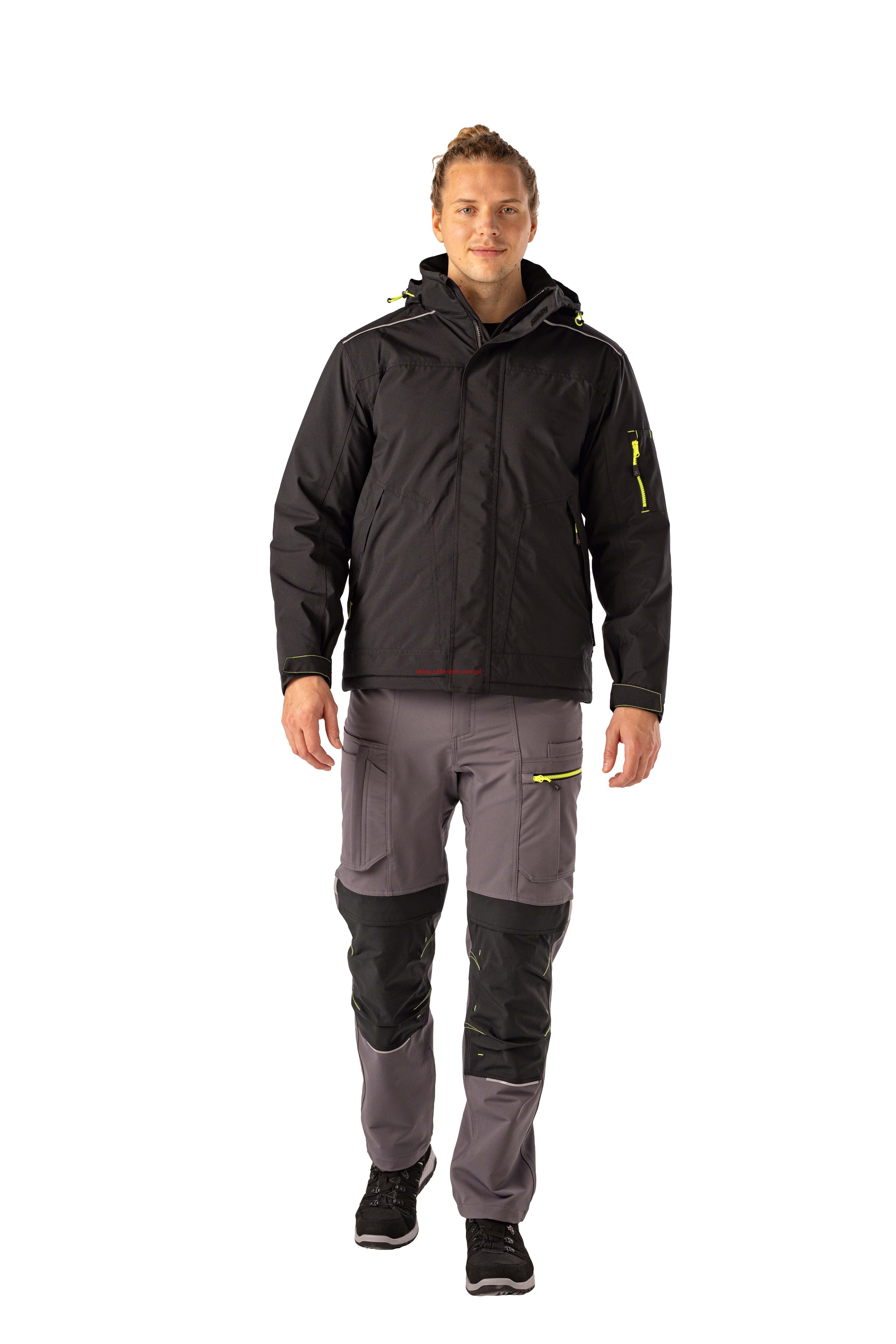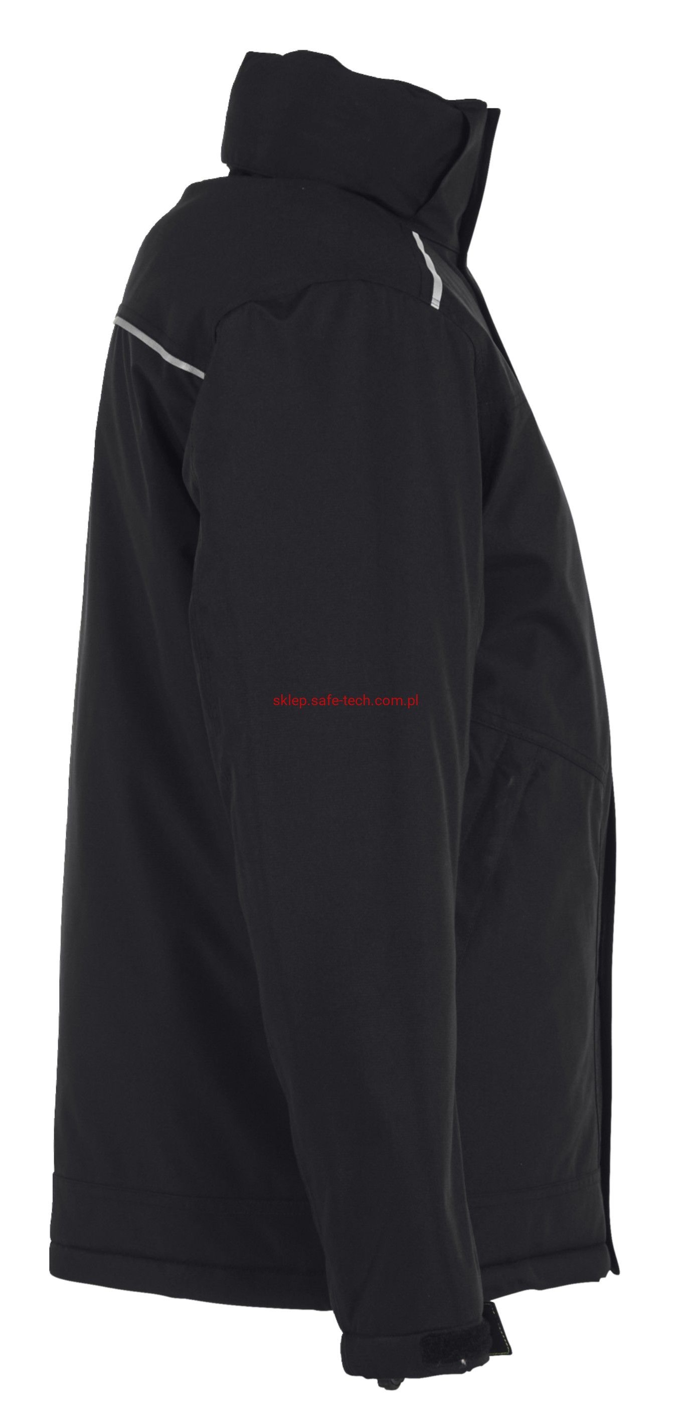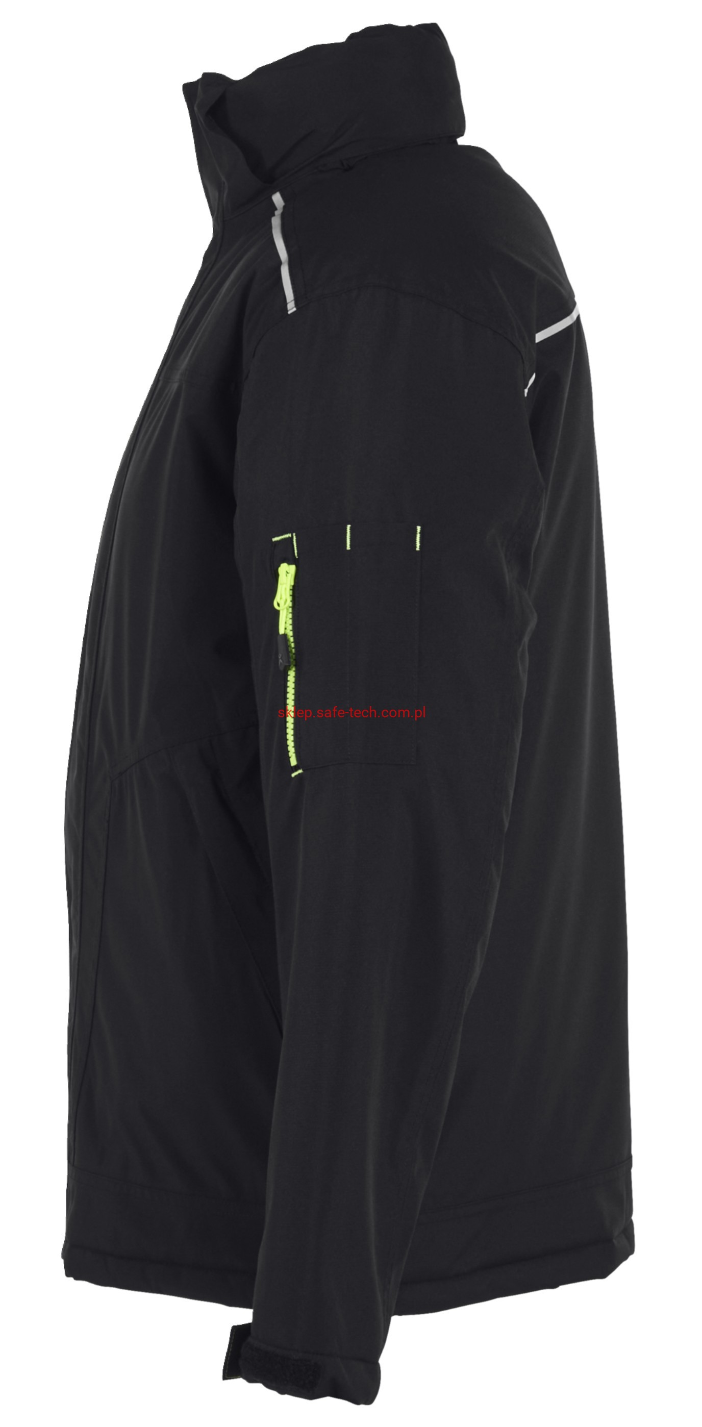 - 2 zakryte kieszenie boczne z zamkiem błyskawicznym, 1 kieszeń na piersi z zamkiem błyskawicznym, kaptur z możliwością regulacji, z przodu kryty zamek błyskawiczny, elastyczne mankiety, szerokość w pasie regulowana, odblaskowe wstawki