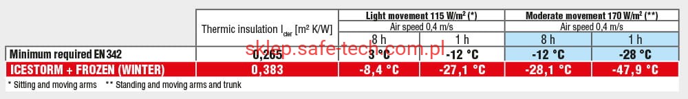 - zapewnia bardzo dobrą ochronę przed zimnem, razem ze spodniami FROZEN przeznaczona do pracy o umiarkowanej ruchliwości przez 8 godzin w temp. do -280 C (do -480 C przez 1 godzinę)