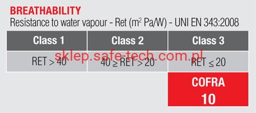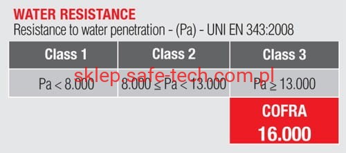 - EN 343:2019 (wysoki poziom 3 wodoodporności, wysoki poziom 3 oddychalności)