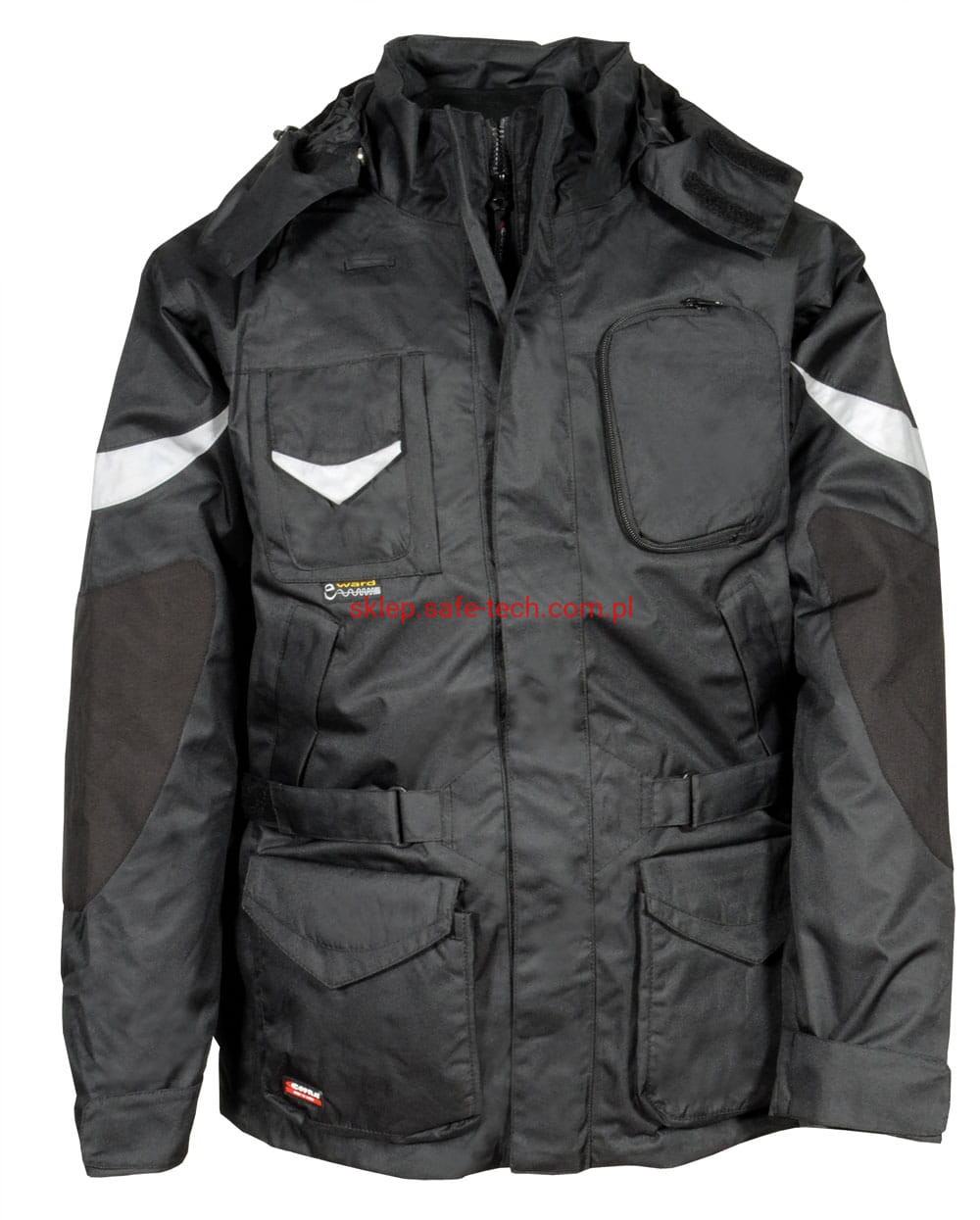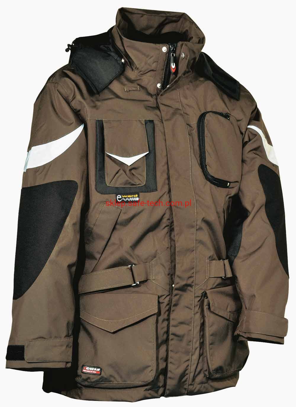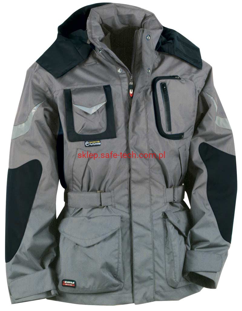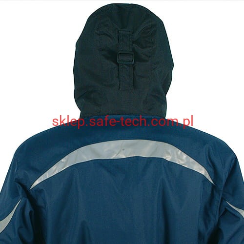 - materiał: część zewnętrzna - 100% poliester 200 g/m2 powlekany poliuretanem; część wewnętrzna: 100% poliester 70 g/m2, watowanie 100% poliester 160 g/m2. W części zewnętrznej łącznie 11 kieszeni zewnętrznych oraz 3 kieszenie wewnętrzne w tym jedna na zamek, regulowany i odczepiany kaptur, regulowane mankiety, regulowana talia na pas, ergonomiczny fason ramion, pętla do zestawu słuchawkowego, kieszeń z tkaniny ochronnej e-ward na telefon, łaty z nylonu na łokciach, wstawki odblaskowe, szwy termo-zgrzewane.
