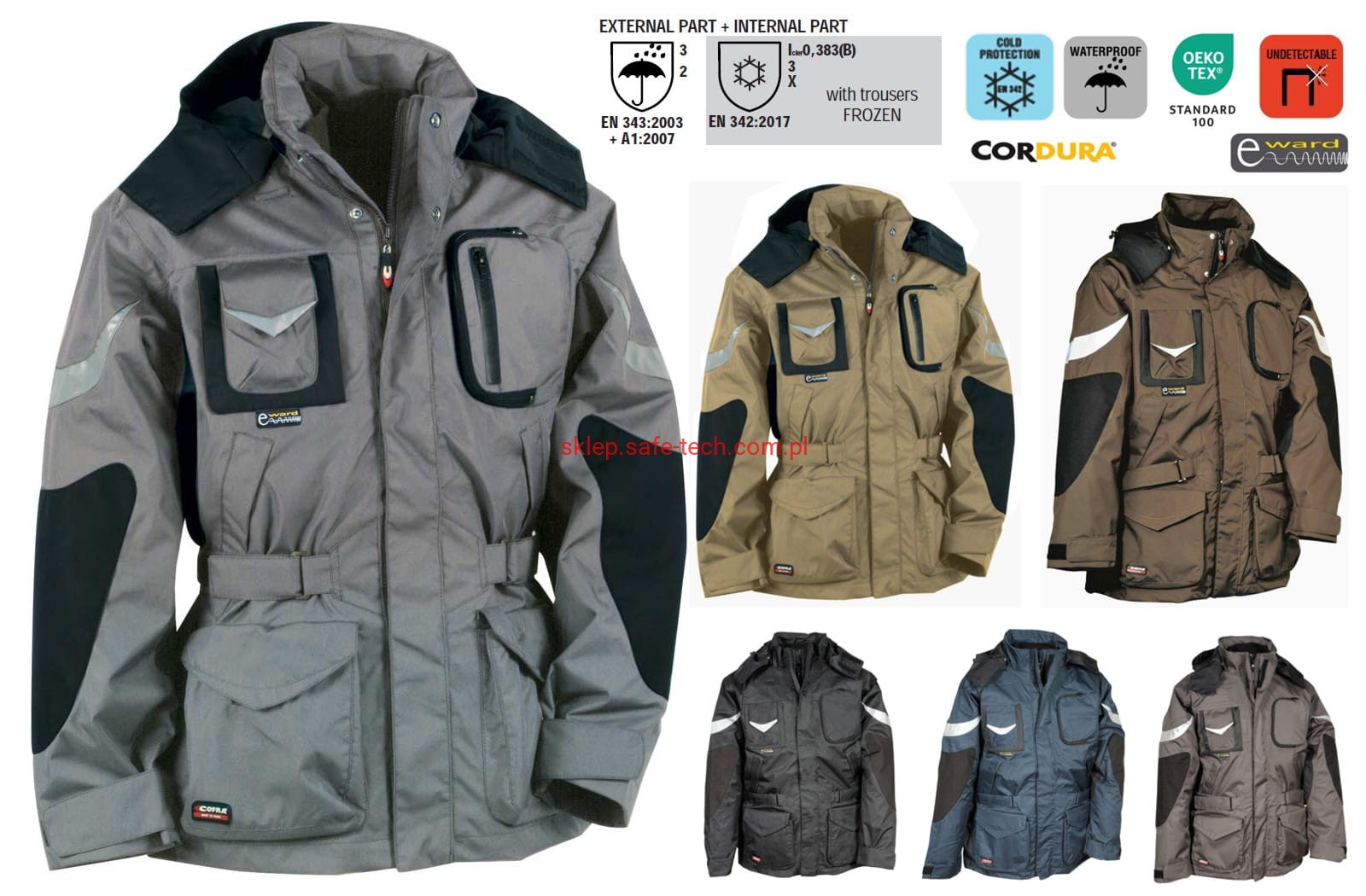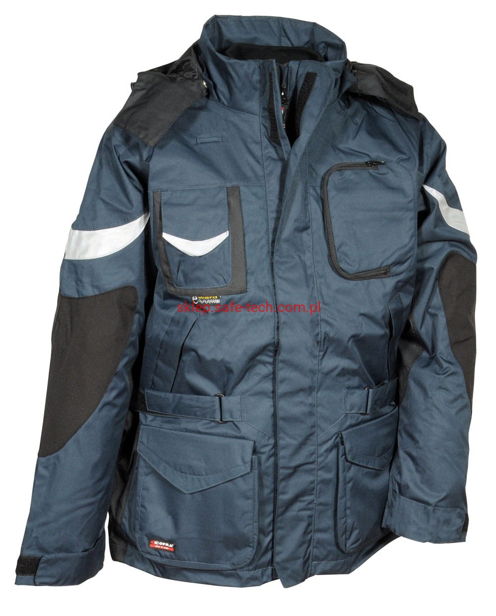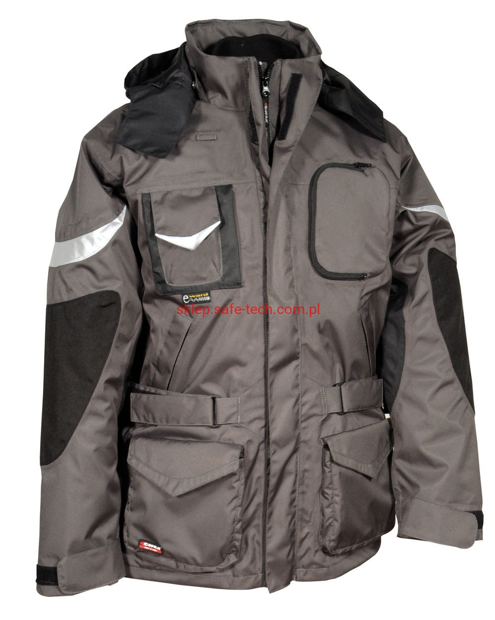 - materiał: część zewnętrzna - 100% poliester 200 g/m2 powlekany poliuretanem; część wewnętrzna: 100% poliester 70 g/m2, watowanie 100% poliester 160 g/m2. W części zewnętrznej łącznie 11 kieszeni zewnętrznych oraz 3 kieszenie wewnętrzne w tym jedna na zamek, regulowany i odczepiany kaptur, regulowane mankiety, regulowana talia na pas, ergonomiczny fason ramion, pętla do zestawu słuchawkowego, kieszeń z tkaniny ochronnej e-ward na telefon, łaty z nylonu na łokciach, wstawki odblaskowe, szwy termo-zgrzewane.