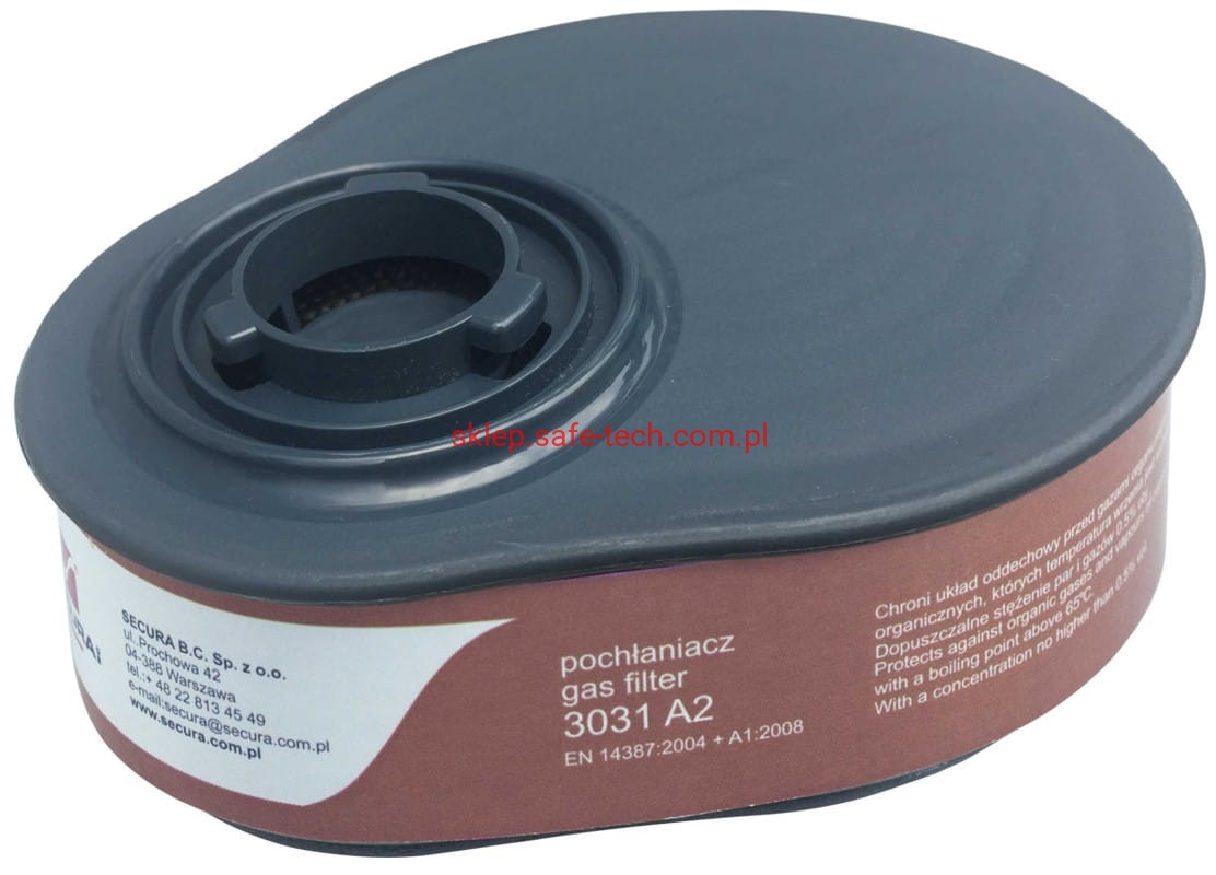 - pochłaniacze SECURA 3031 A2 po skompletowaniu z odpowiednią półmaską lub maską chronią przed gazami i parami substancji organicznych, których temperatura wrzenia jest wyższa niż 65°C