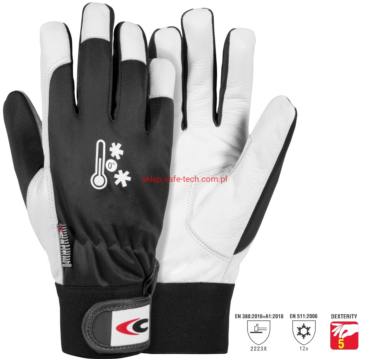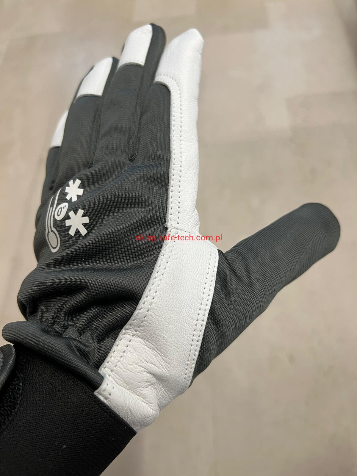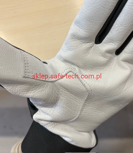 - część chwytna wykonana z wysokiej jakości miękkiej skóry koziej licowej zapewniającej wygodę i elastyczność, część grzbietowa i kciuk z tkaniny poliestrowej zapewniającej oddychalność i manualność, ocieplina wewnątrz z wełny poliestrowej.