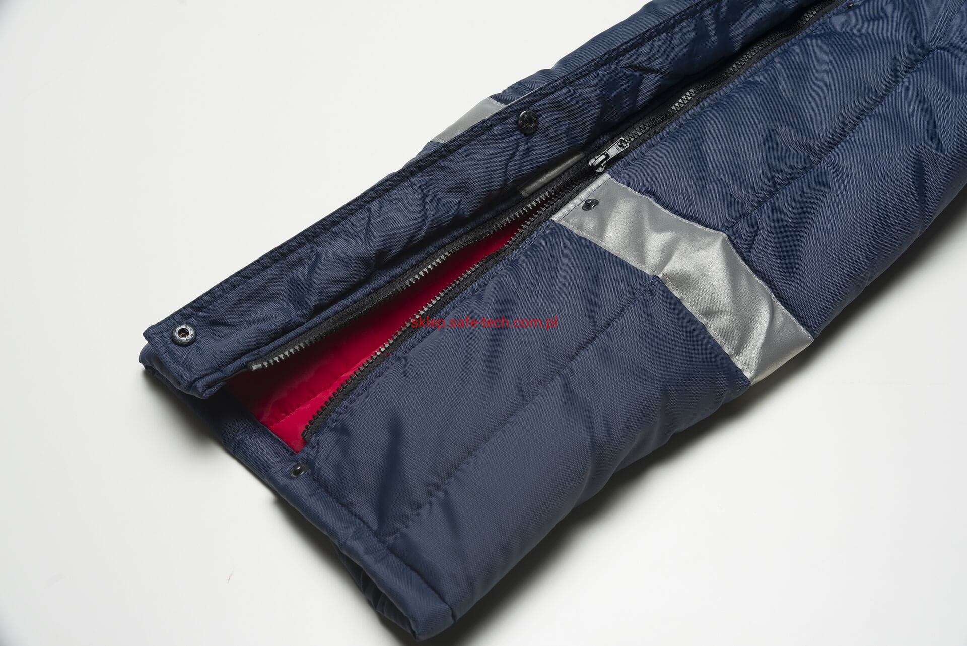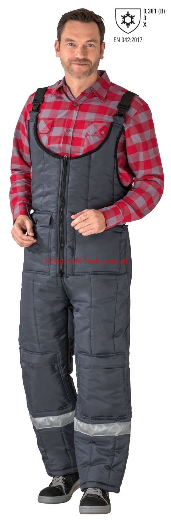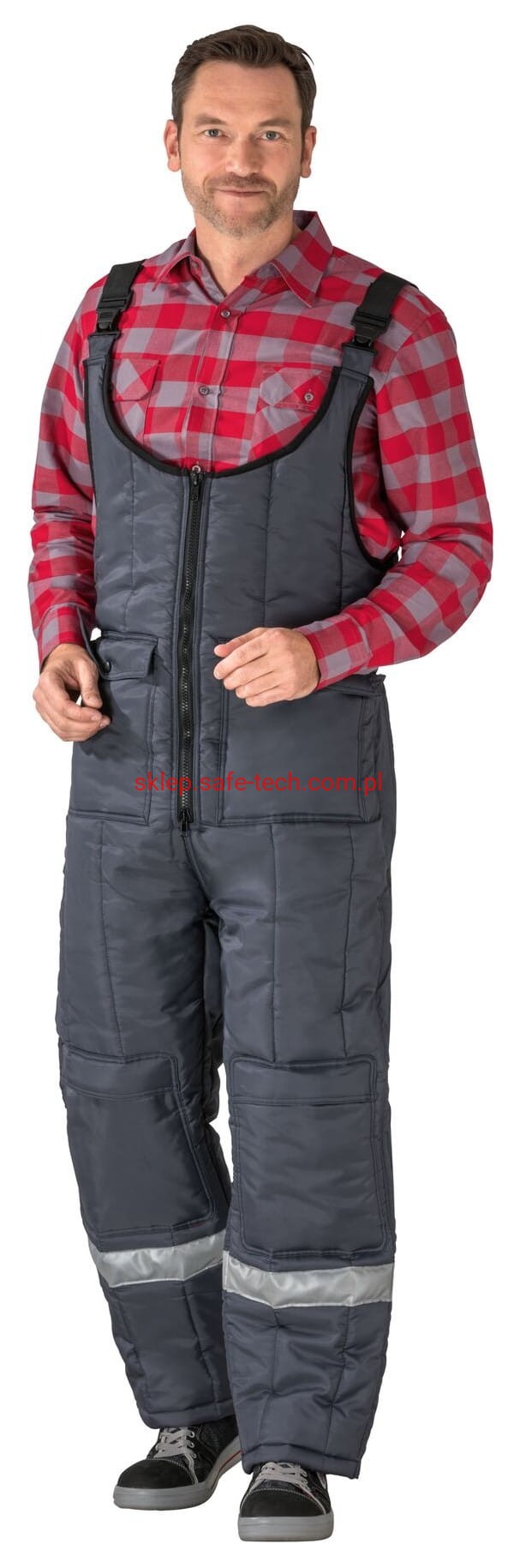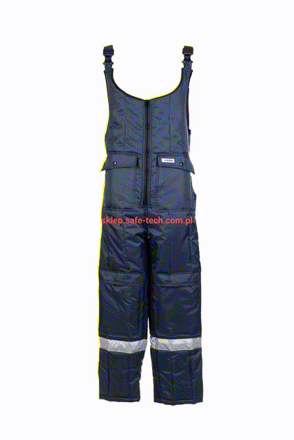 - zamek błyskawiczny z przodu na całej długości, 2 naszyte kieszenie po bokach z patkami, wysoki, zachodzący na plecy tył spodni z elastycznymi szelkami, klamrowe zapięcia na szelkach, naszyte kieszenie na nakolannikach, boczny zamek błyskawiczny z patką dla ułatwienia zakładania, taśma odblaskowa na nogawkach