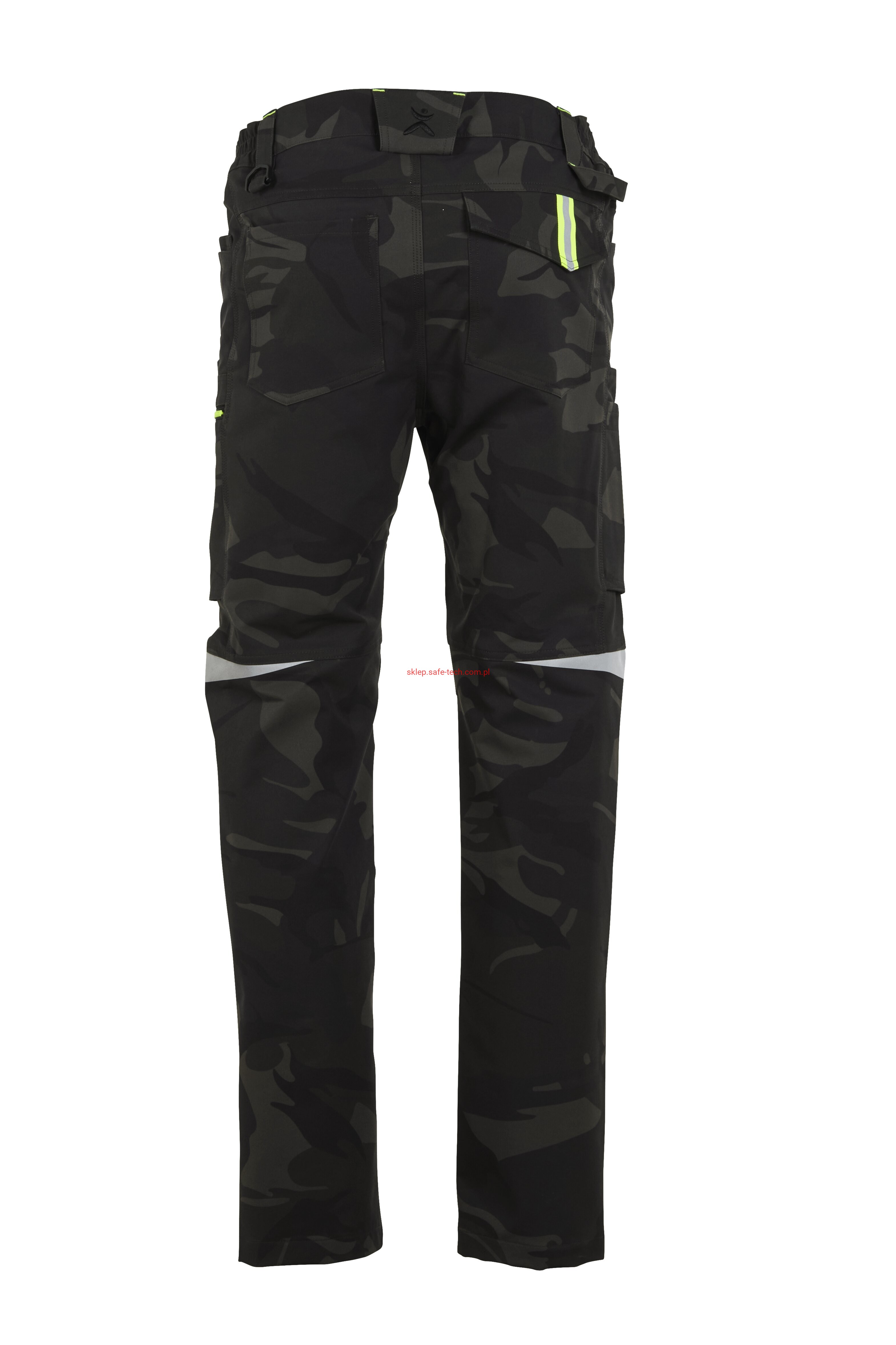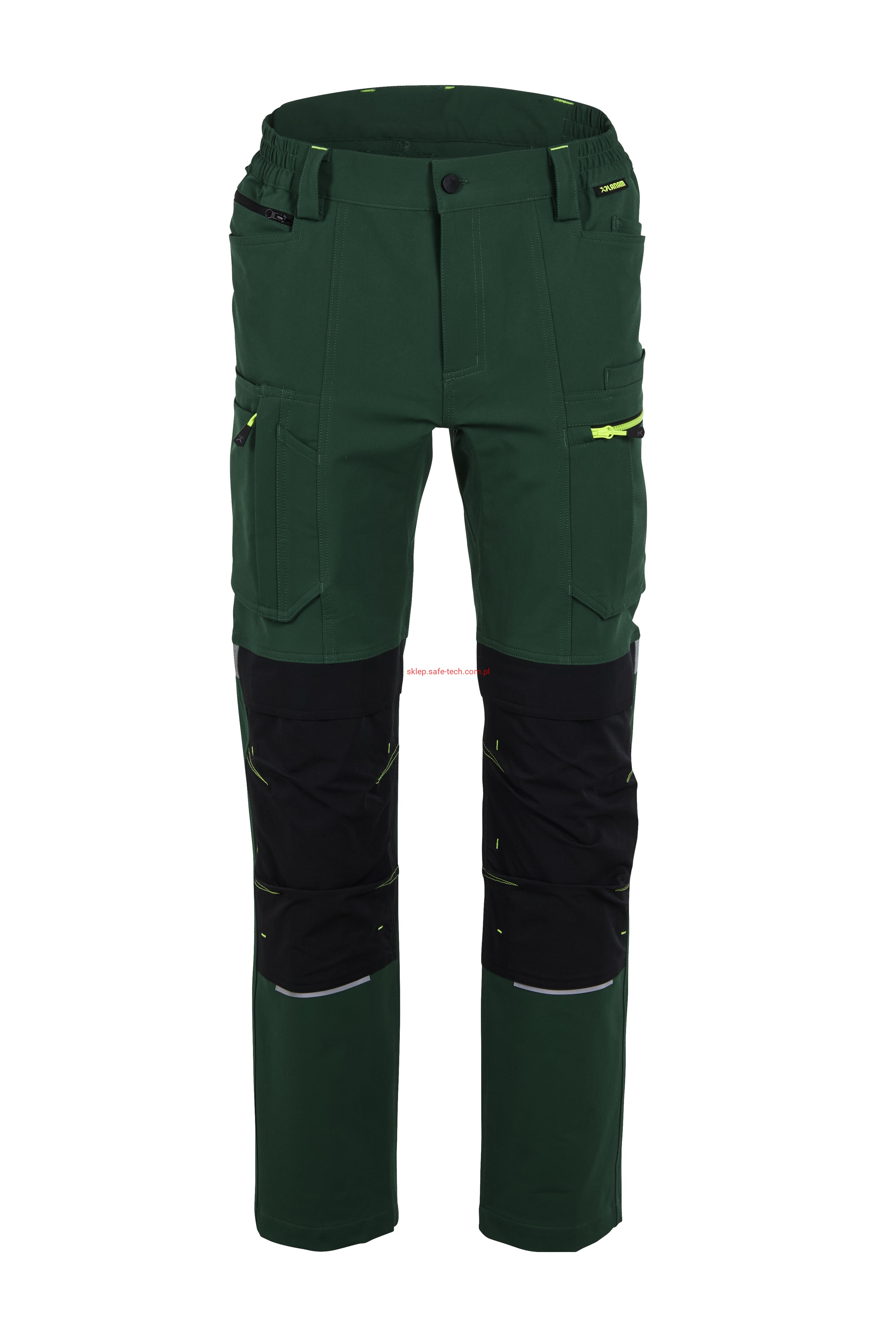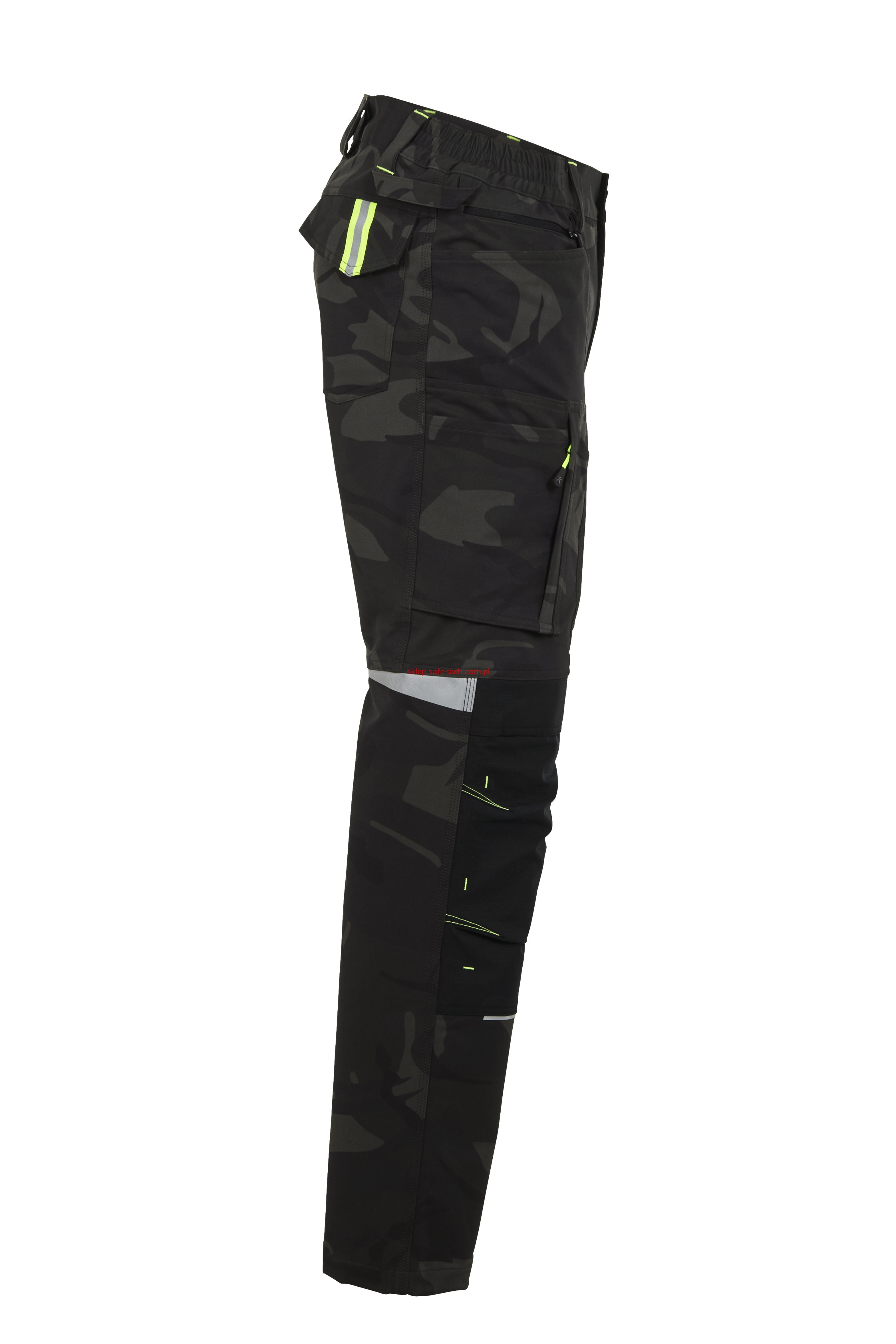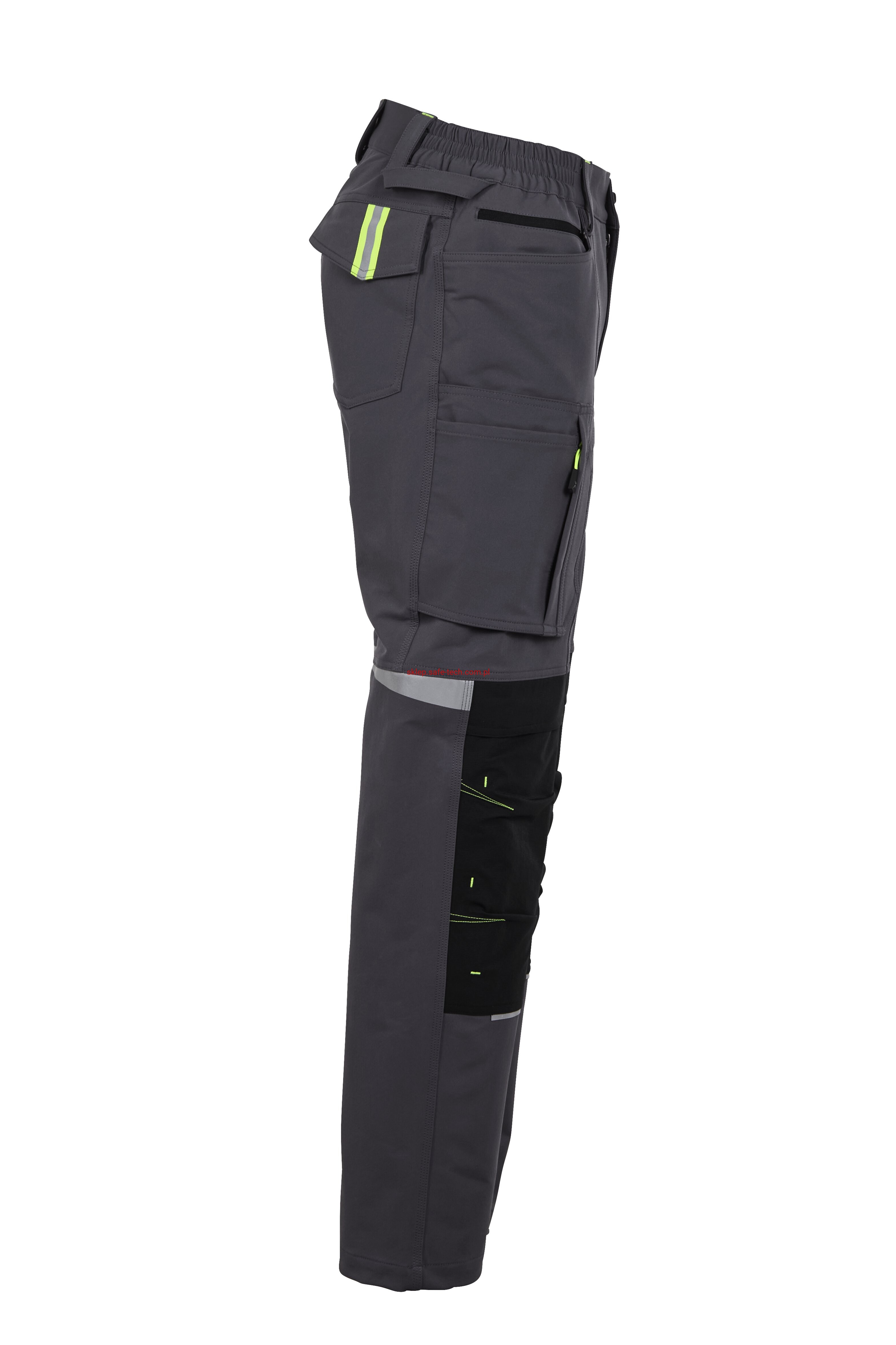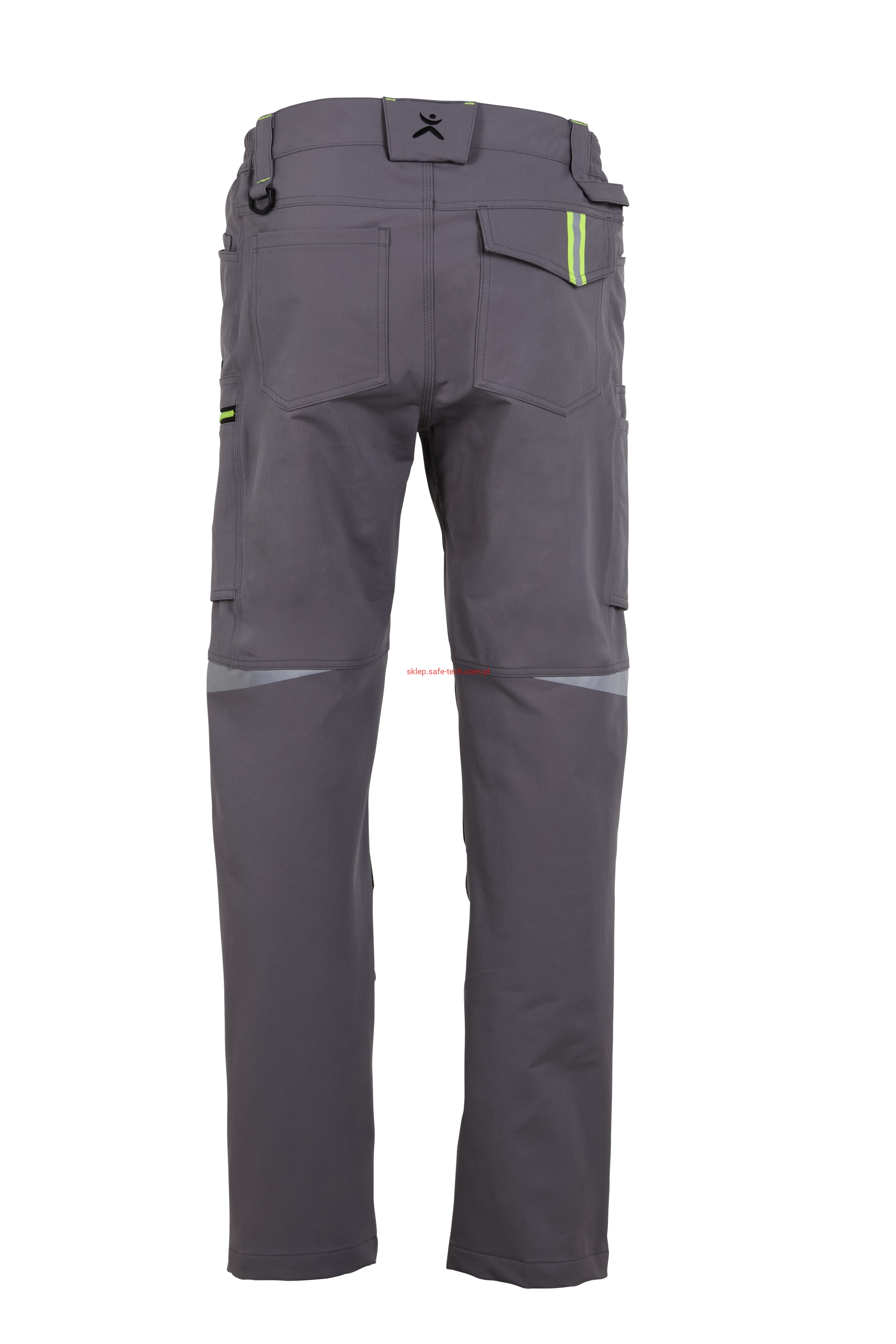 - 2 wstawiane obszerne kieszenie, kieszeń z lewej strony na komórkę, talia z elastyczną wstawką, talia z 5 szlufkami i guzikiem dżinsowym, 2 naszyte kieszenie na kolanach obsługiwane od góry, rozporek zamykany na zamek błyskawiczny, szlufka na młotek, odblaskowe aplikacje, kieszeń po prawej stronie z małą kieszonką zapinaną na suwak, kieszeń po lewej stronie z dużą kieszenią na telefon komórkowy, podwójna kieszeń na udzie po prawej stronie z zamkiem błyskawicznym i przegrodą na długopisy, kieszeń na lewym udzie z zamkiem błyskawicznym i dużą kieszenią na telefon komórkowy, 2 tylne kieszenie, prawa tylna kieszeń z klapką i odblaskową aplikacją.