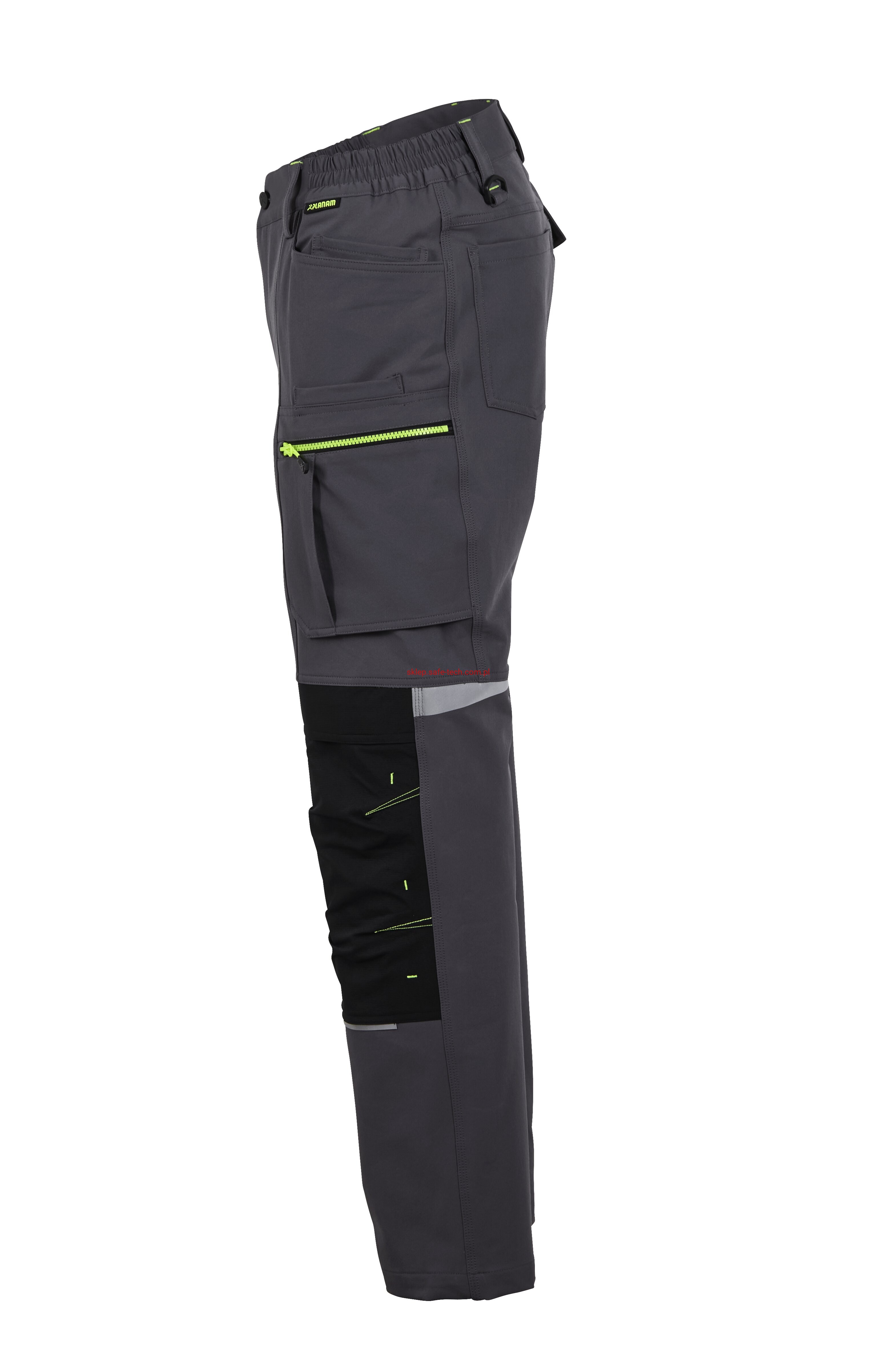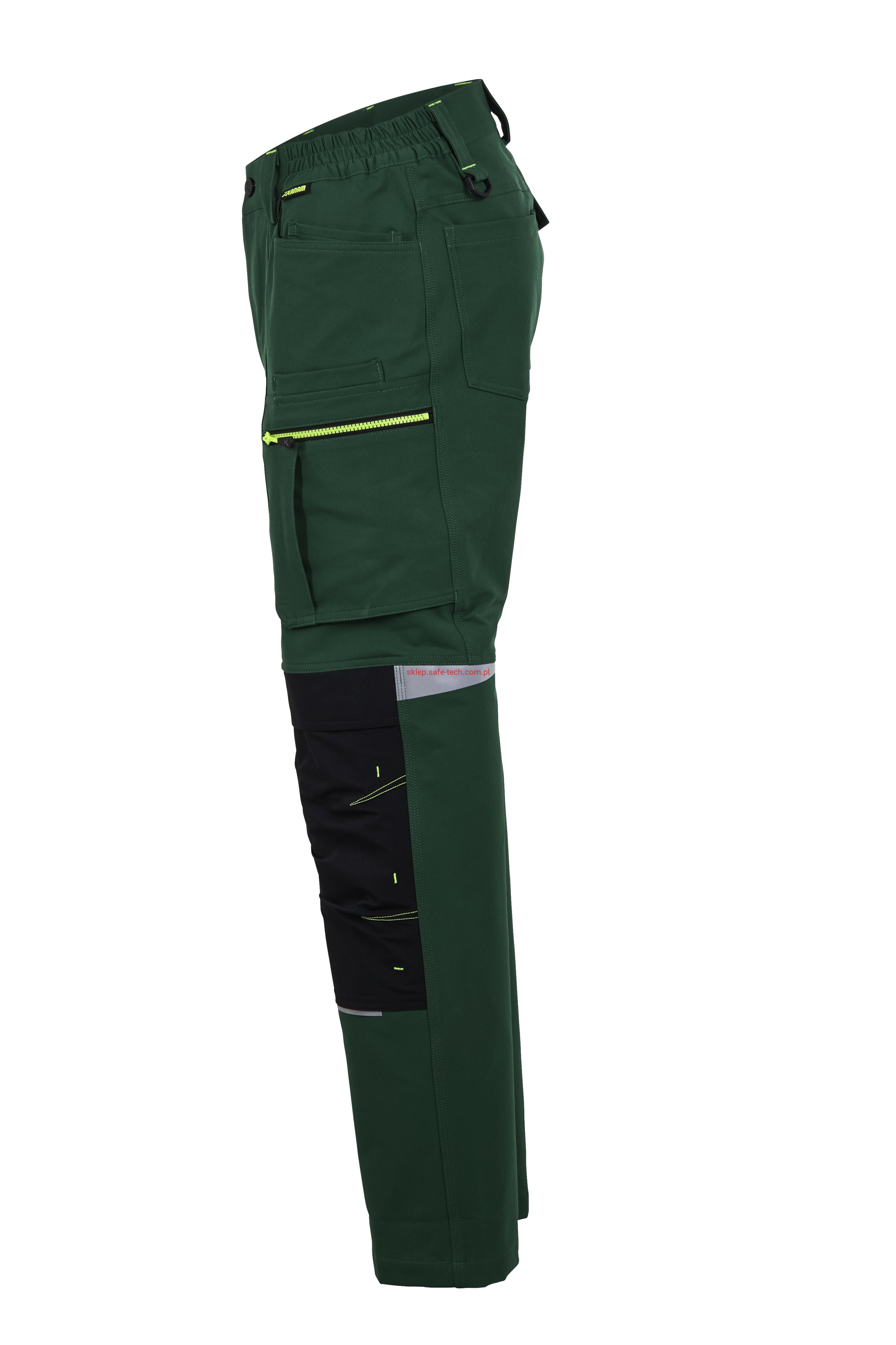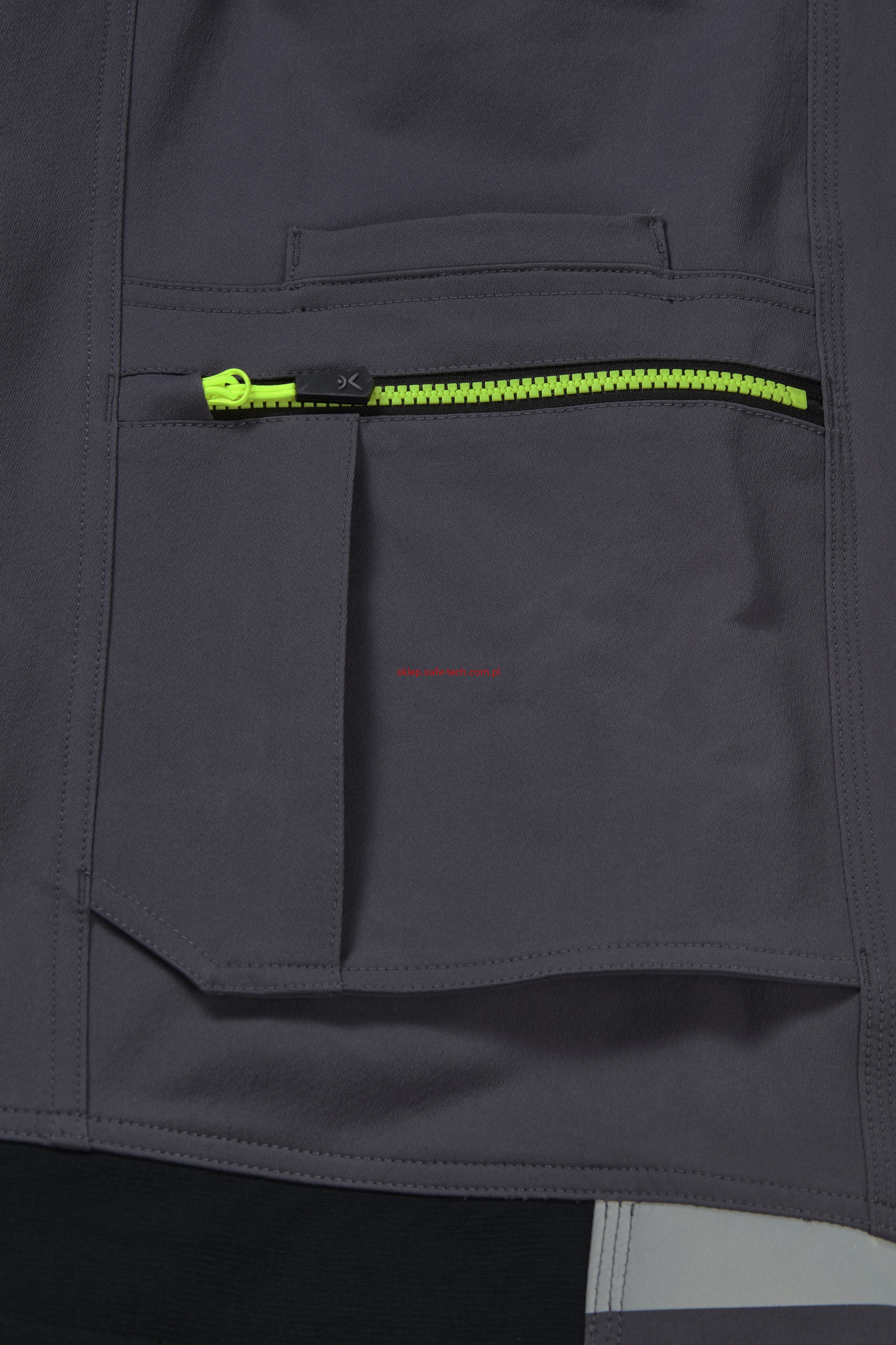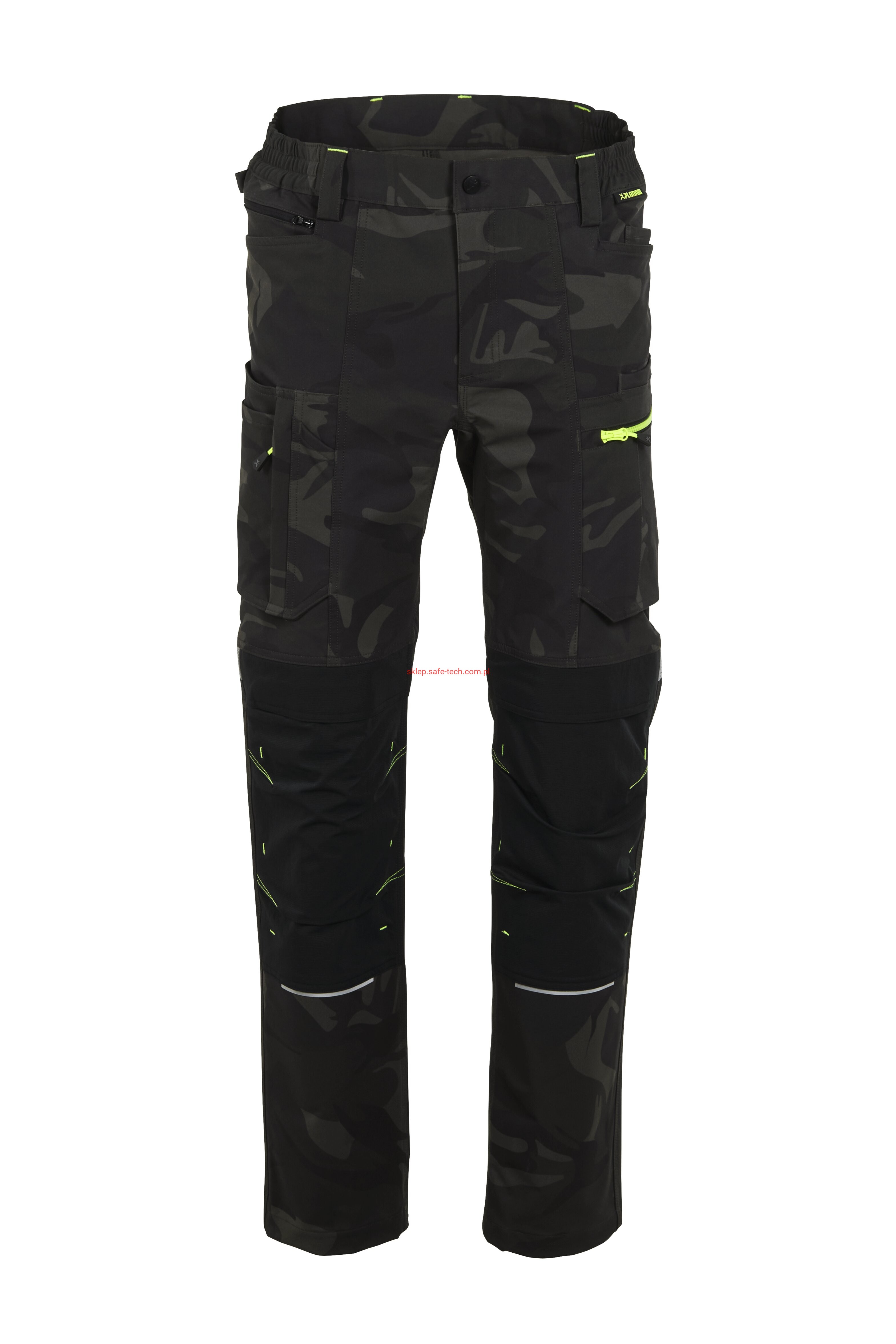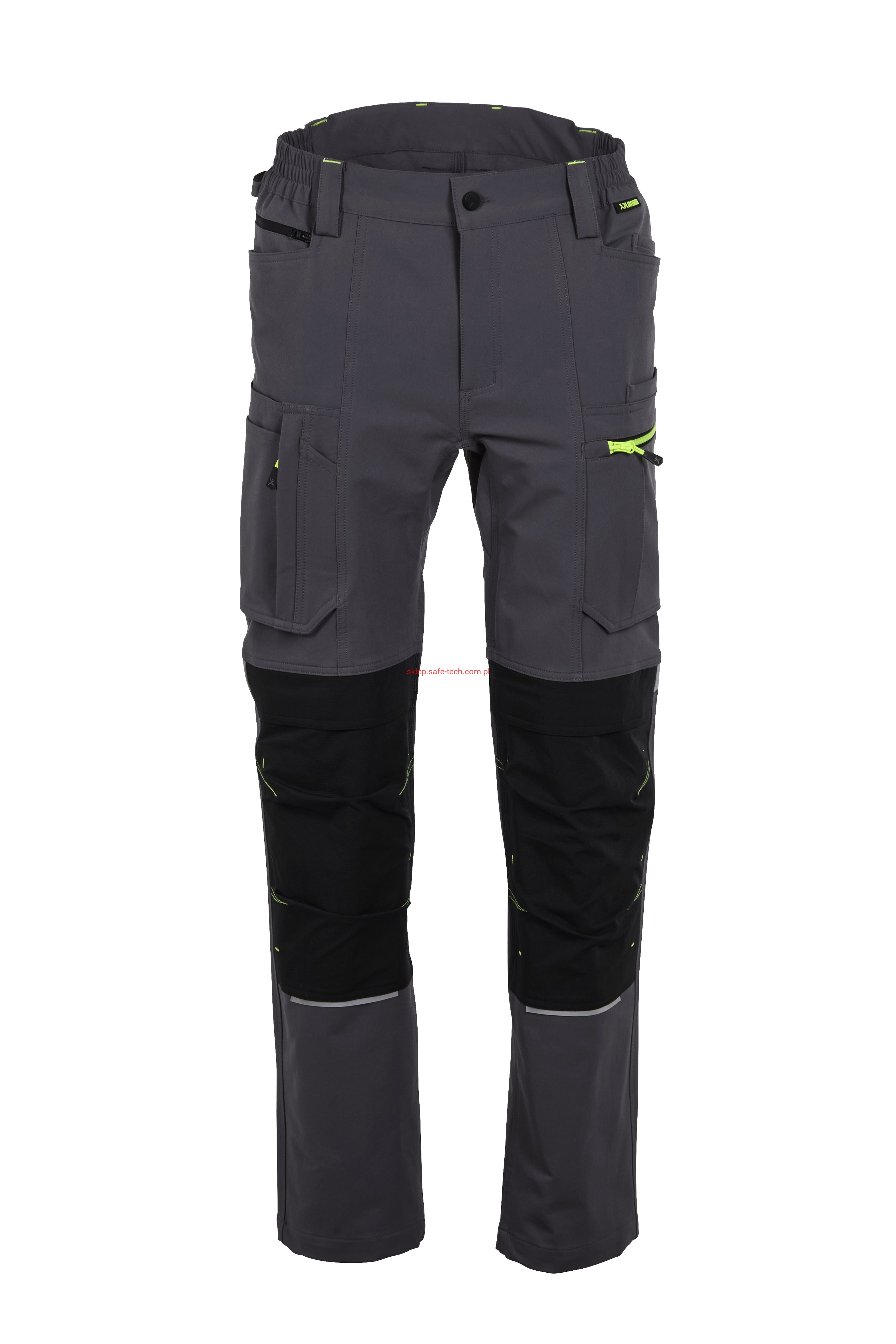 - 2 wstawiane obszerne kieszenie, kieszeń z lewej strony na komórkę, talia z elastyczną wstawką, talia z 5 szlufkami i guzikiem dżinsowym, 2 naszyte kieszenie na kolanach obsługiwane od góry, rozporek zamykany na zamek błyskawiczny, szlufka na młotek, odblaskowe aplikacje, kieszeń po prawej stronie z małą kieszonką zapinaną na suwak, kieszeń po lewej stronie z dużą kieszenią na telefon komórkowy, podwójna kieszeń na udzie po prawej stronie z zamkiem błyskawicznym i przegrodą na długopisy, kieszeń na lewym udzie z zamkiem błyskawicznym i dużą kieszenią na telefon komórkowy, 2 tylne kieszenie, prawa tylna kieszeń z klapką i odblaskową aplikacją.