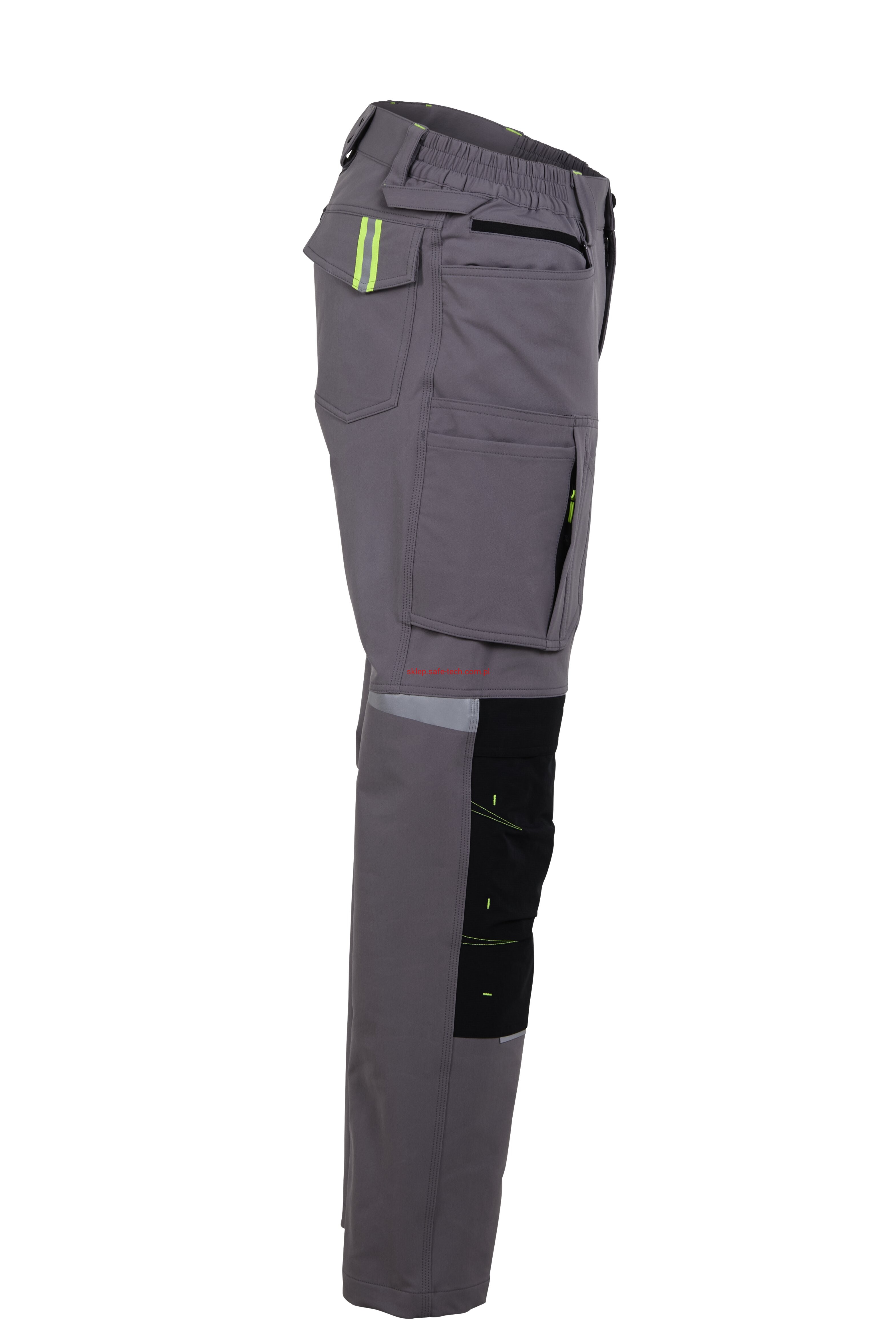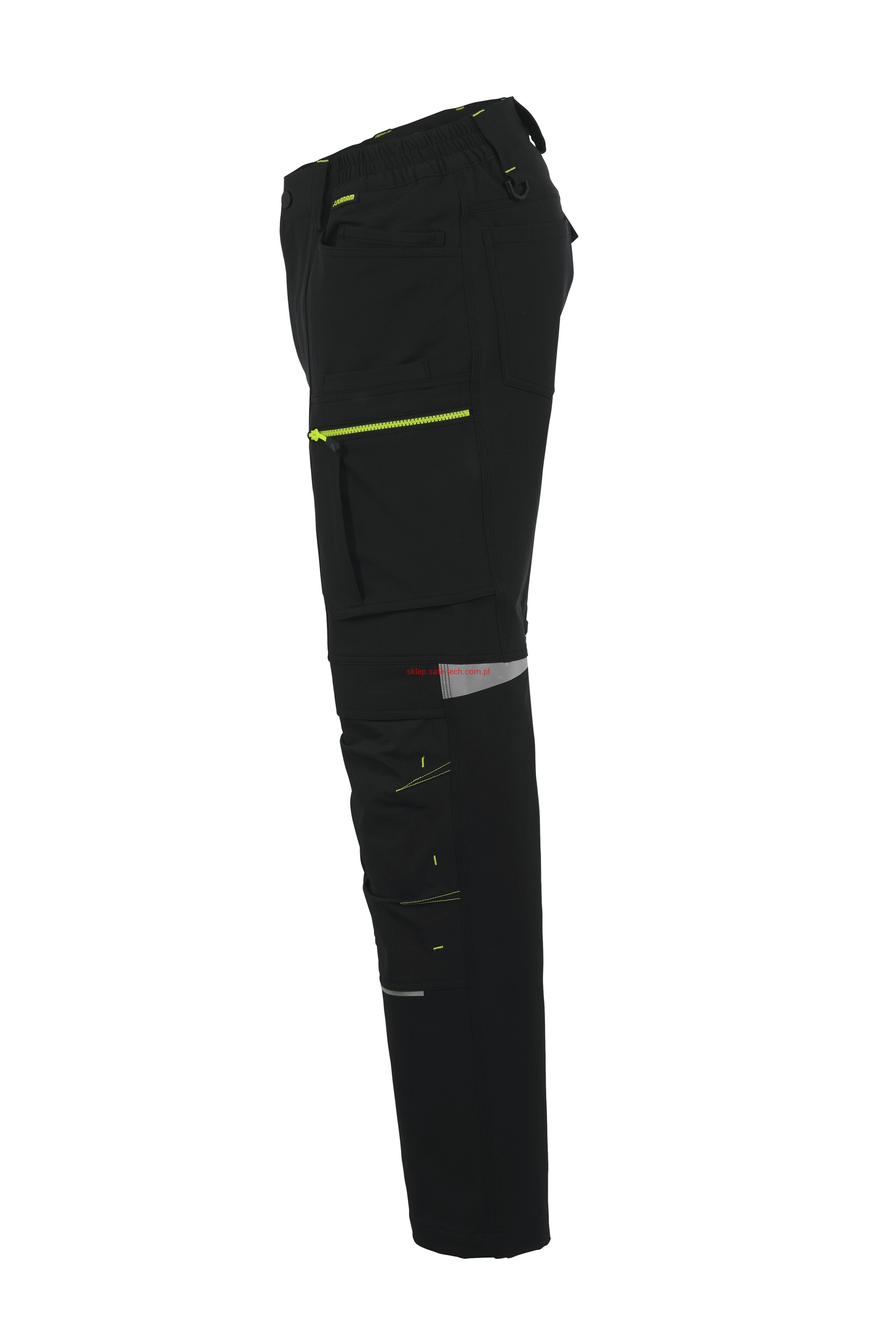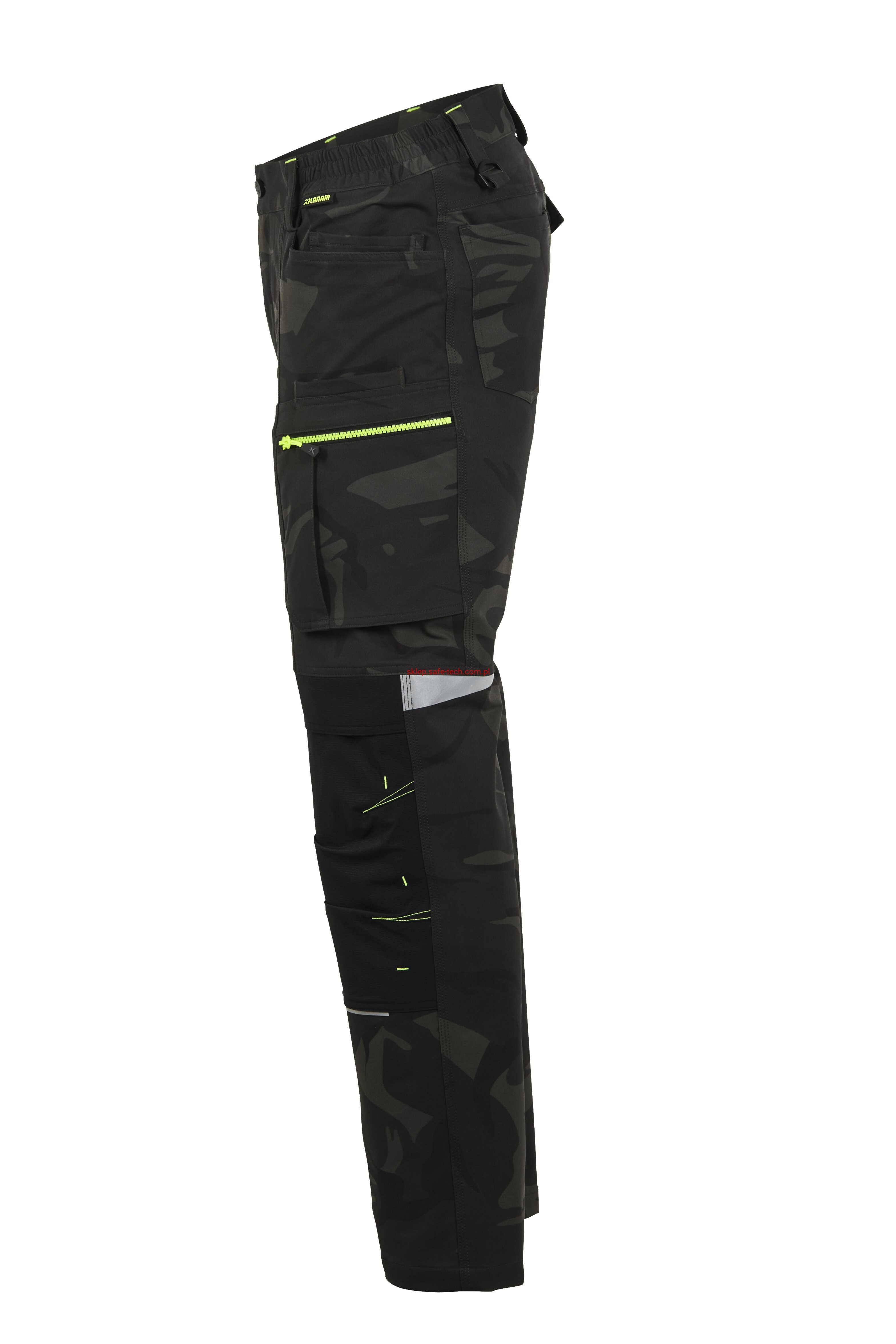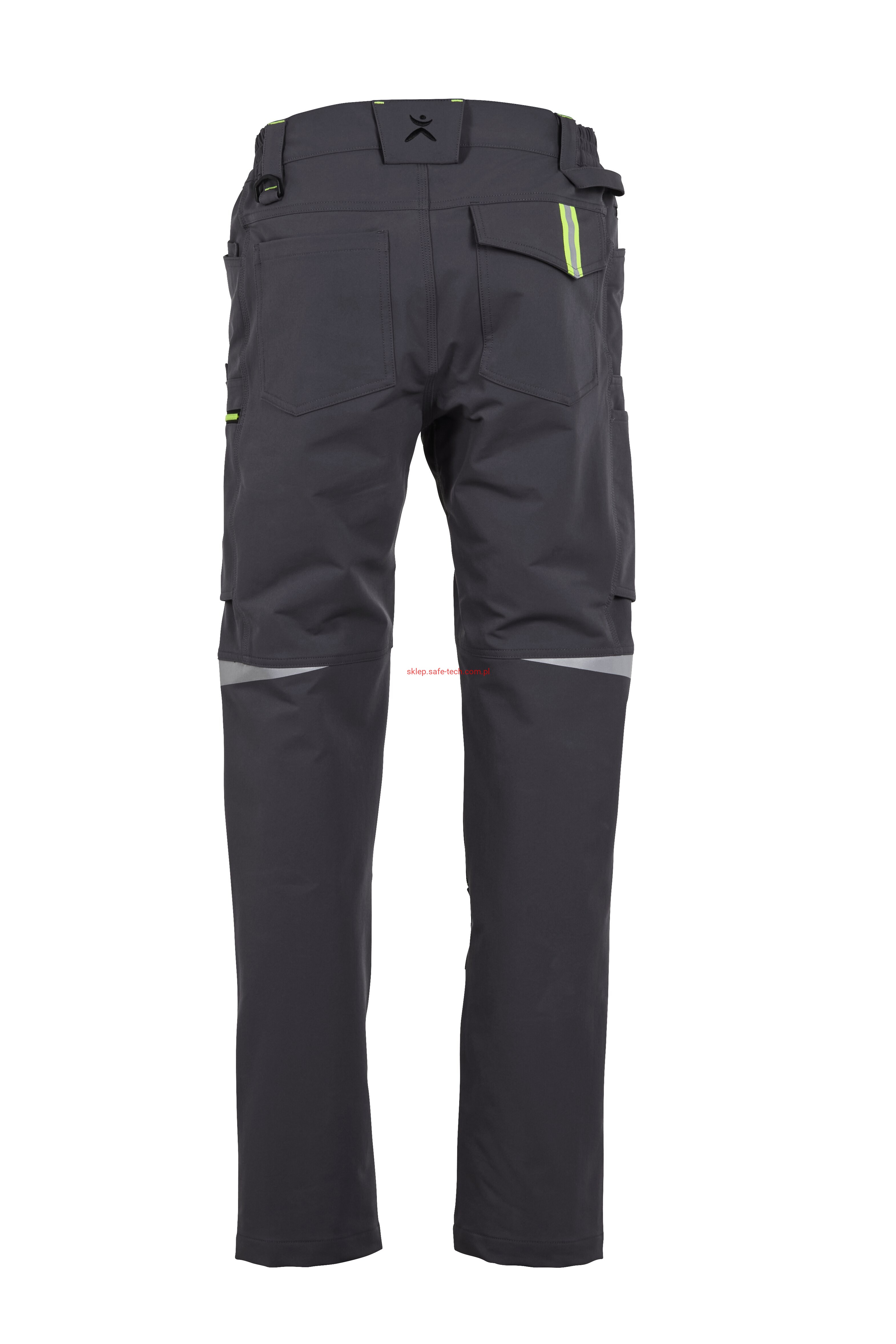 - 2 wstawiane obszerne kieszenie, kieszeń z lewej strony na komórkę, talia z elastyczną wstawką, talia z 5 szlufkami i guzikiem dżinsowym, 2 naszyte kieszenie na kolanach obsługiwane od góry, rozporek zamykany na zamek błyskawiczny, szlufka na młotek, odblaskowe aplikacje, kieszeń po prawej stronie z małą kieszonką zapinaną na suwak, kieszeń po lewej stronie z dużą kieszenią na telefon komórkowy, podwójna kieszeń na udzie po prawej stronie z zamkiem błyskawicznym i przegrodą na długopisy, kieszeń na lewym udzie z zamkiem błyskawicznym i dużą kieszenią na telefon komórkowy, 2 tylne kieszenie, prawa tylna kieszeń z klapką i odblaskową aplikacją.