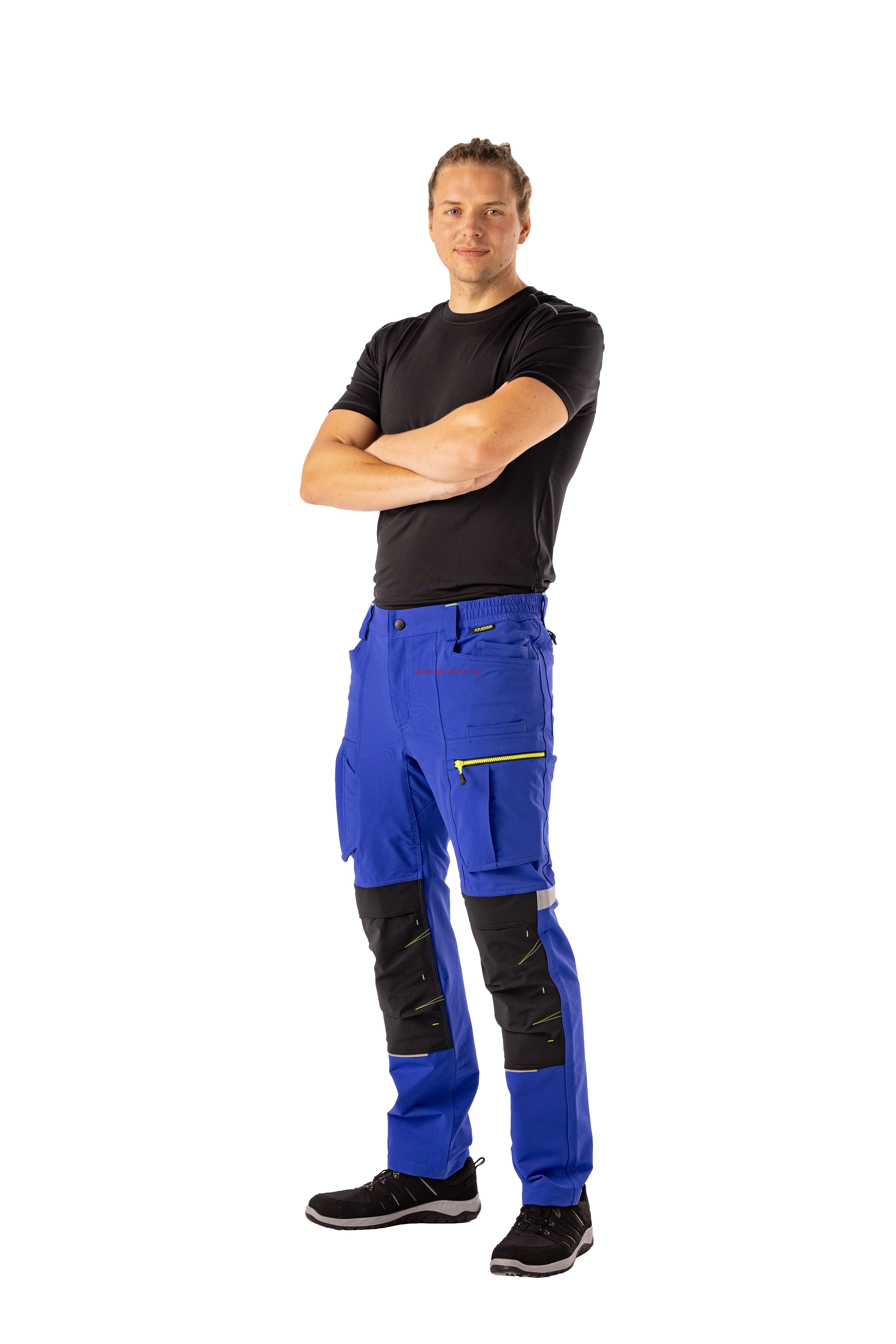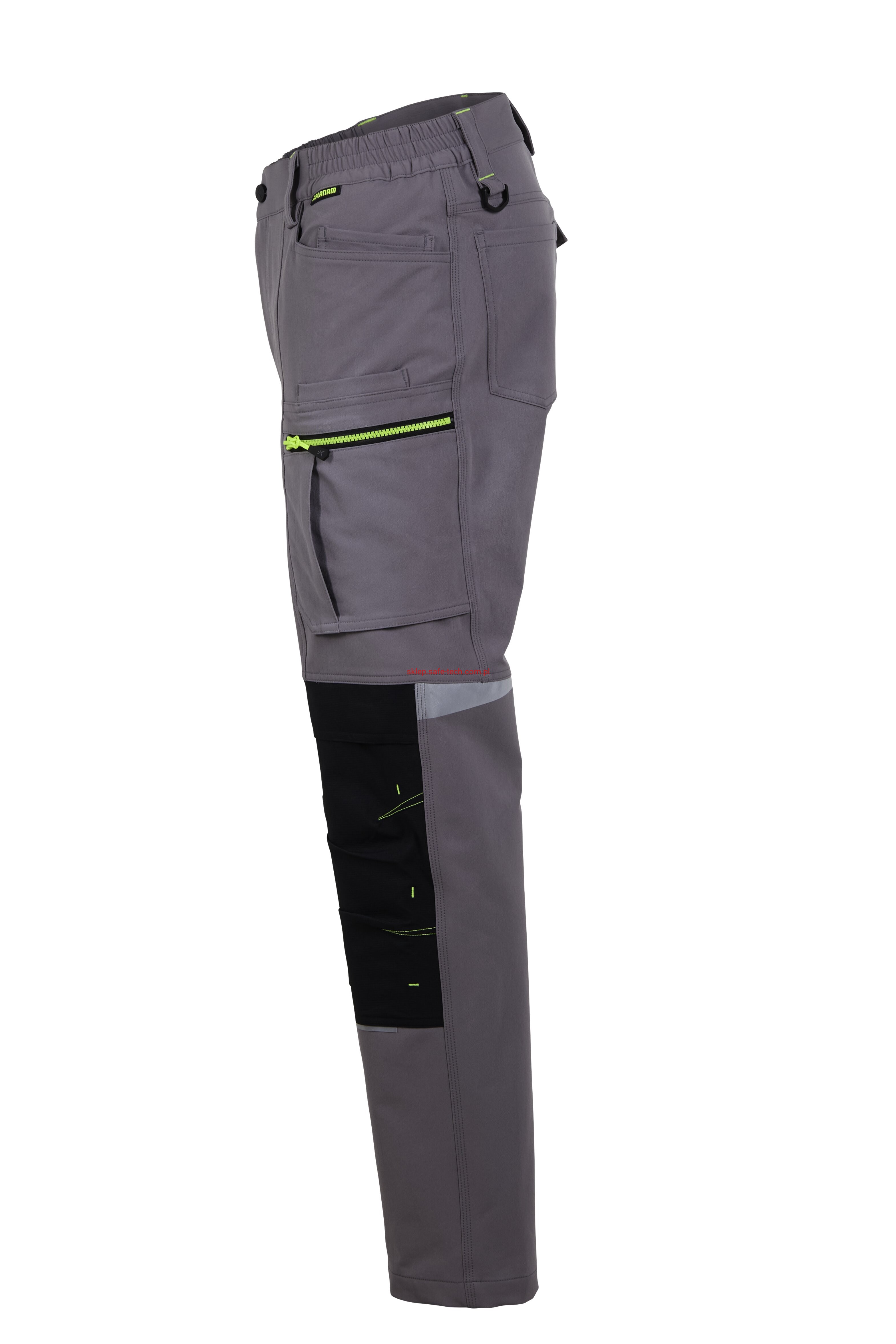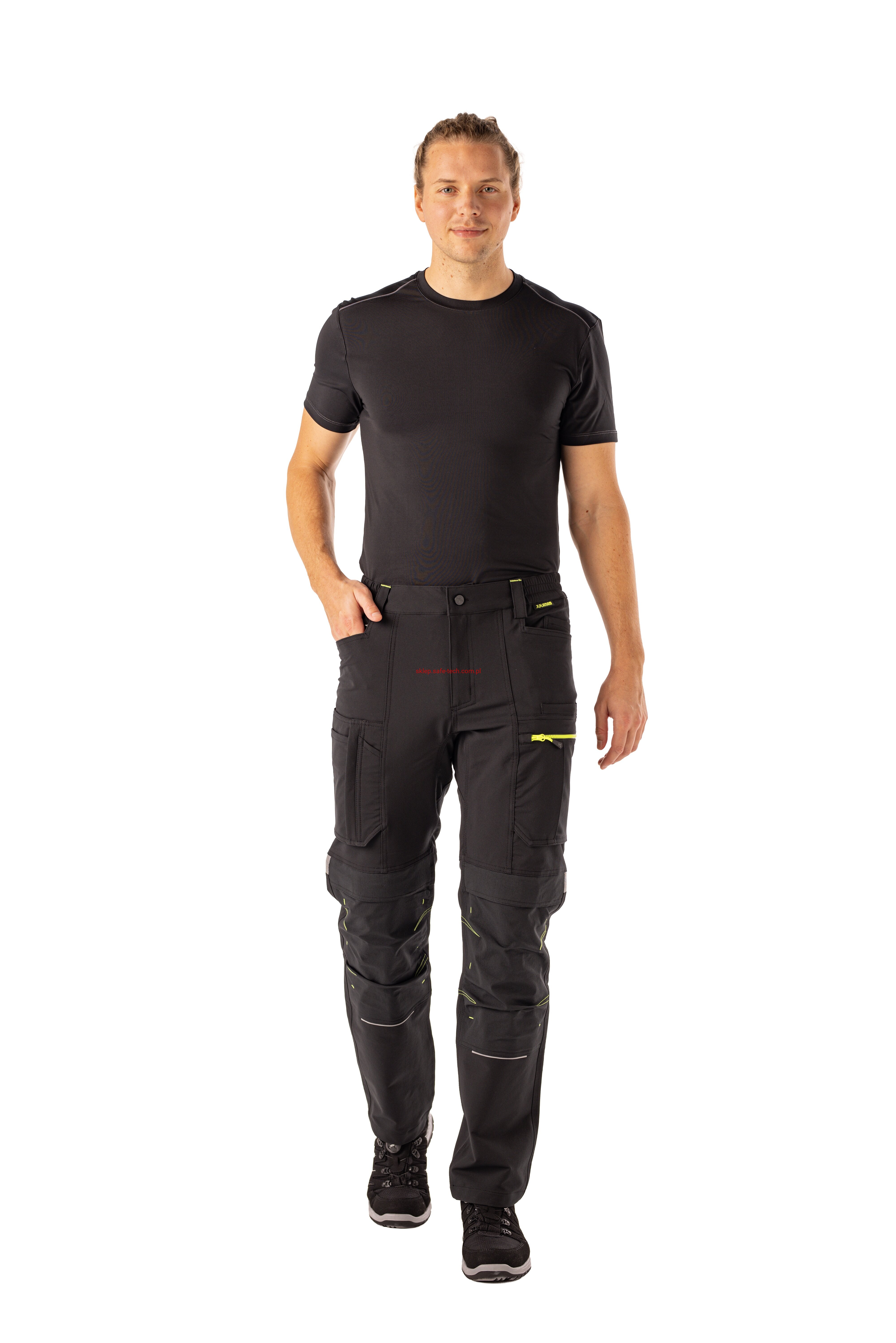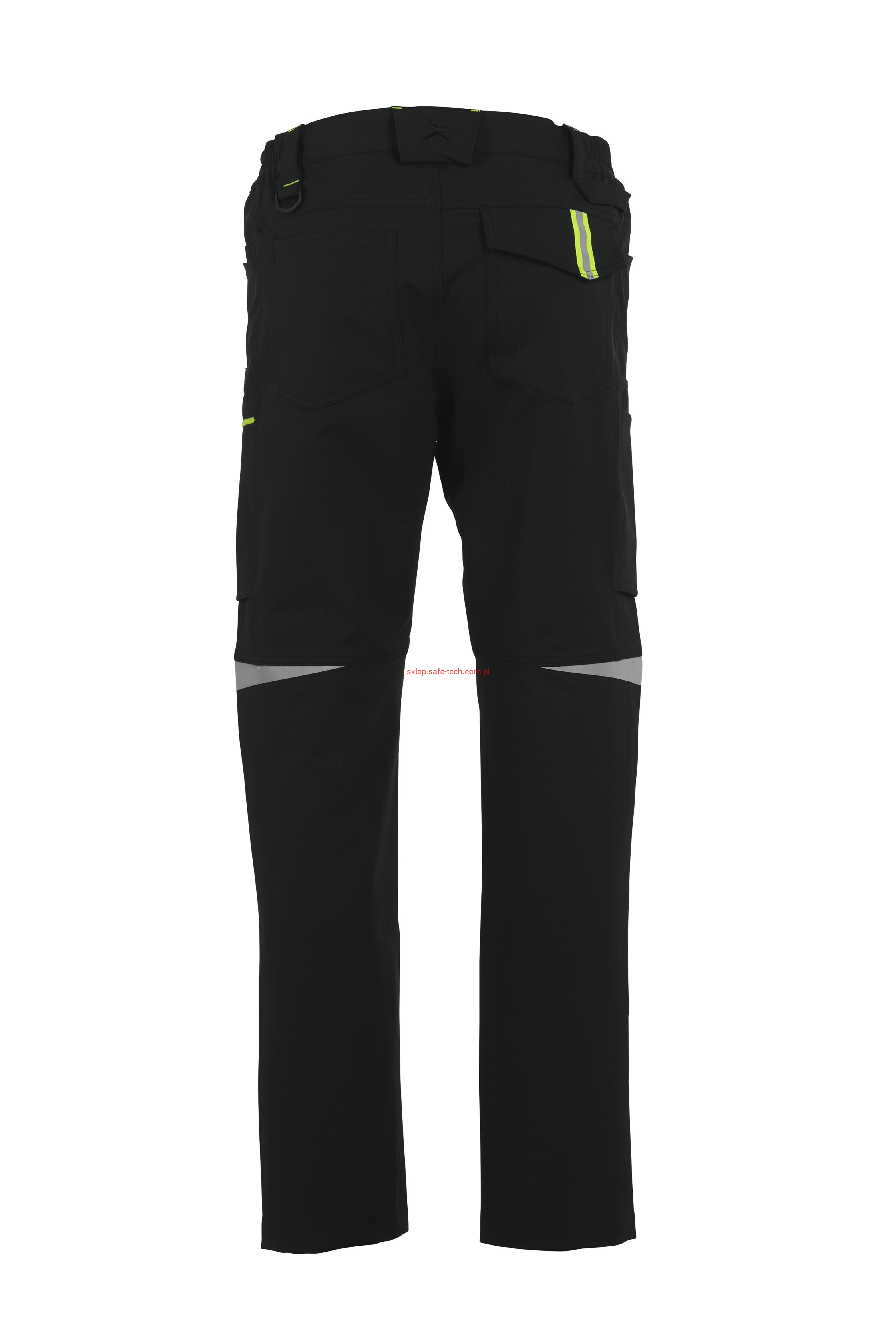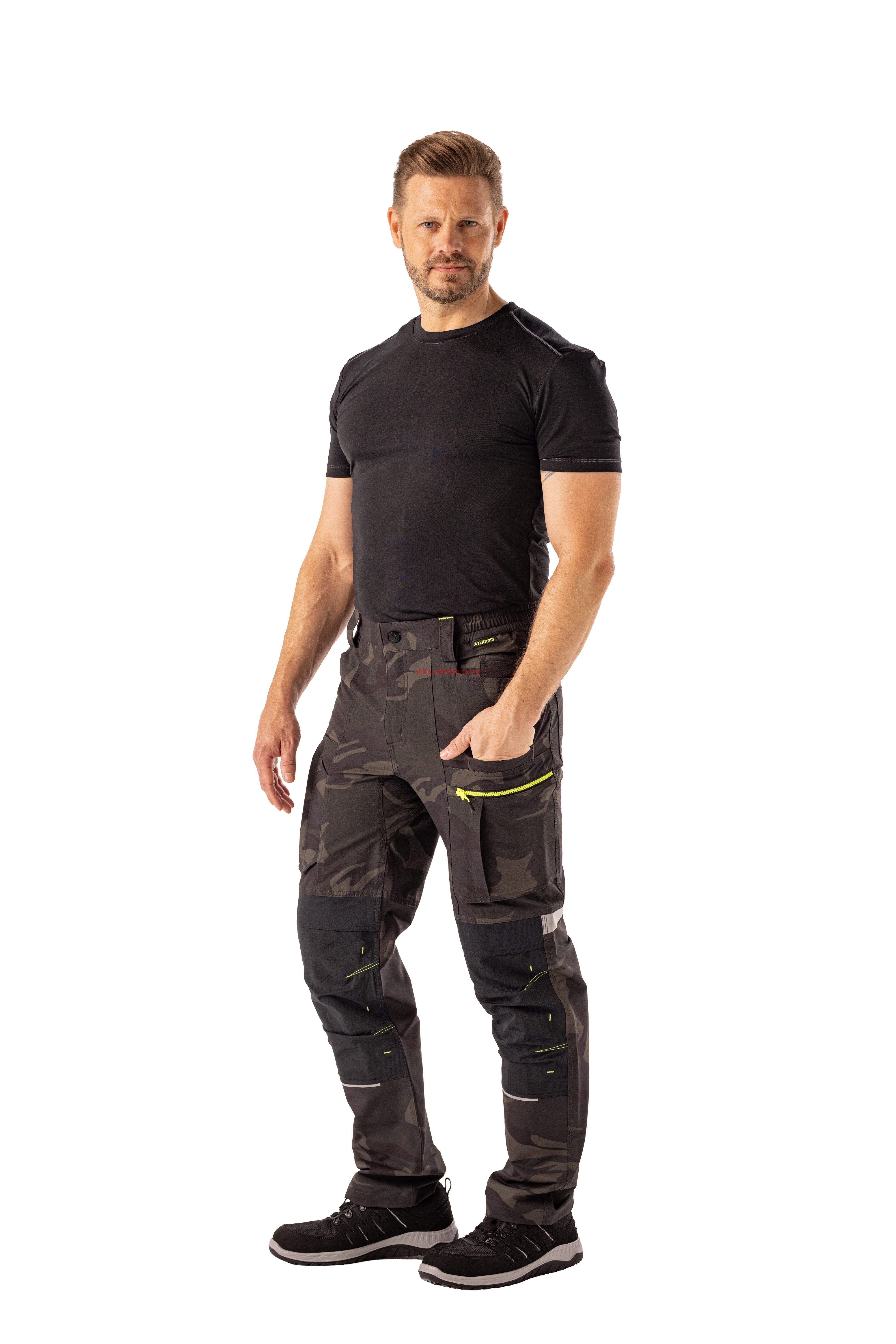 - 2 wstawiane obszerne kieszenie, kieszeń z lewej strony na komórkę, talia z elastyczną wstawką, talia z 5 szlufkami i guzikiem dżinsowym, 2 naszyte kieszenie na kolanach obsługiwane od góry, rozporek zamykany na zamek błyskawiczny, szlufka na młotek, odblaskowe aplikacje, kieszeń po prawej stronie z małą kieszonką zapinaną na suwak, kieszeń po lewej stronie z dużą kieszenią na telefon komórkowy, podwójna kieszeń na udzie po prawej stronie z zamkiem błyskawicznym i przegrodą na długopisy, kieszeń na lewym udzie z zamkiem błyskawicznym i dużą kieszenią na telefon komórkowy, 2 tylne kieszenie, prawa tylna kieszeń z klapką i odblaskową aplikacją.