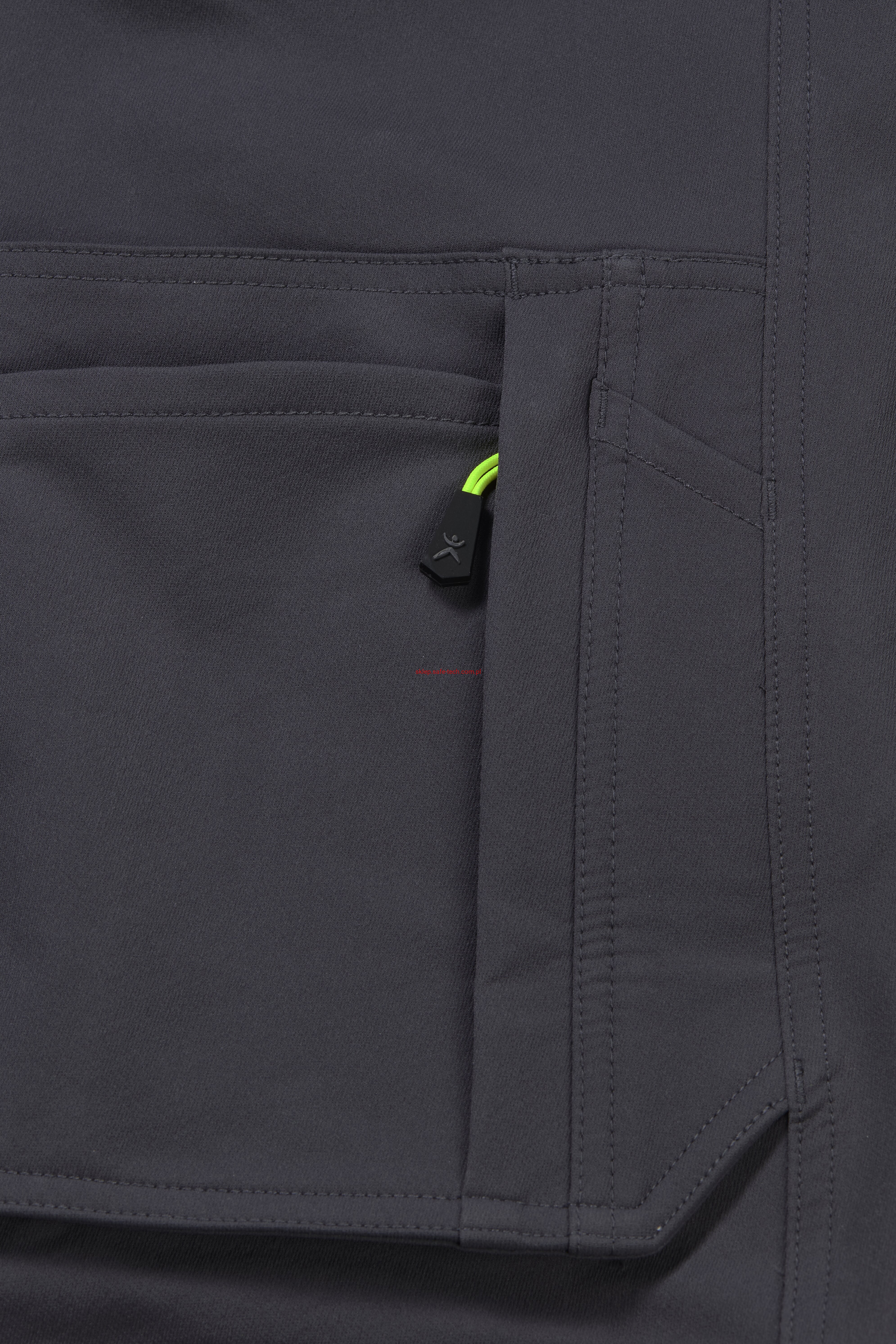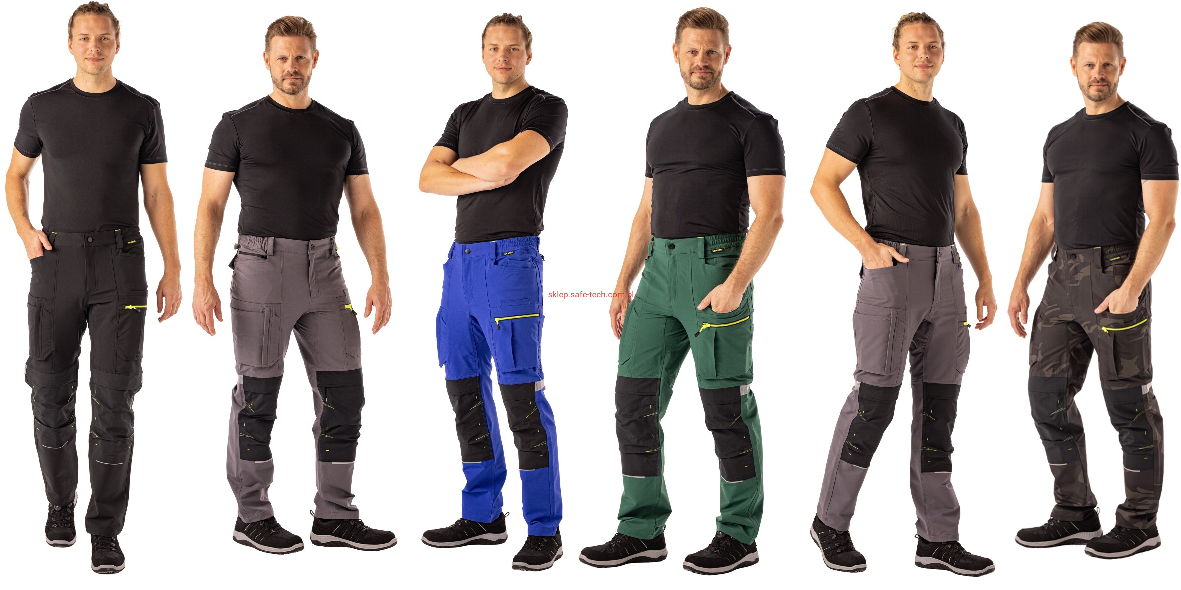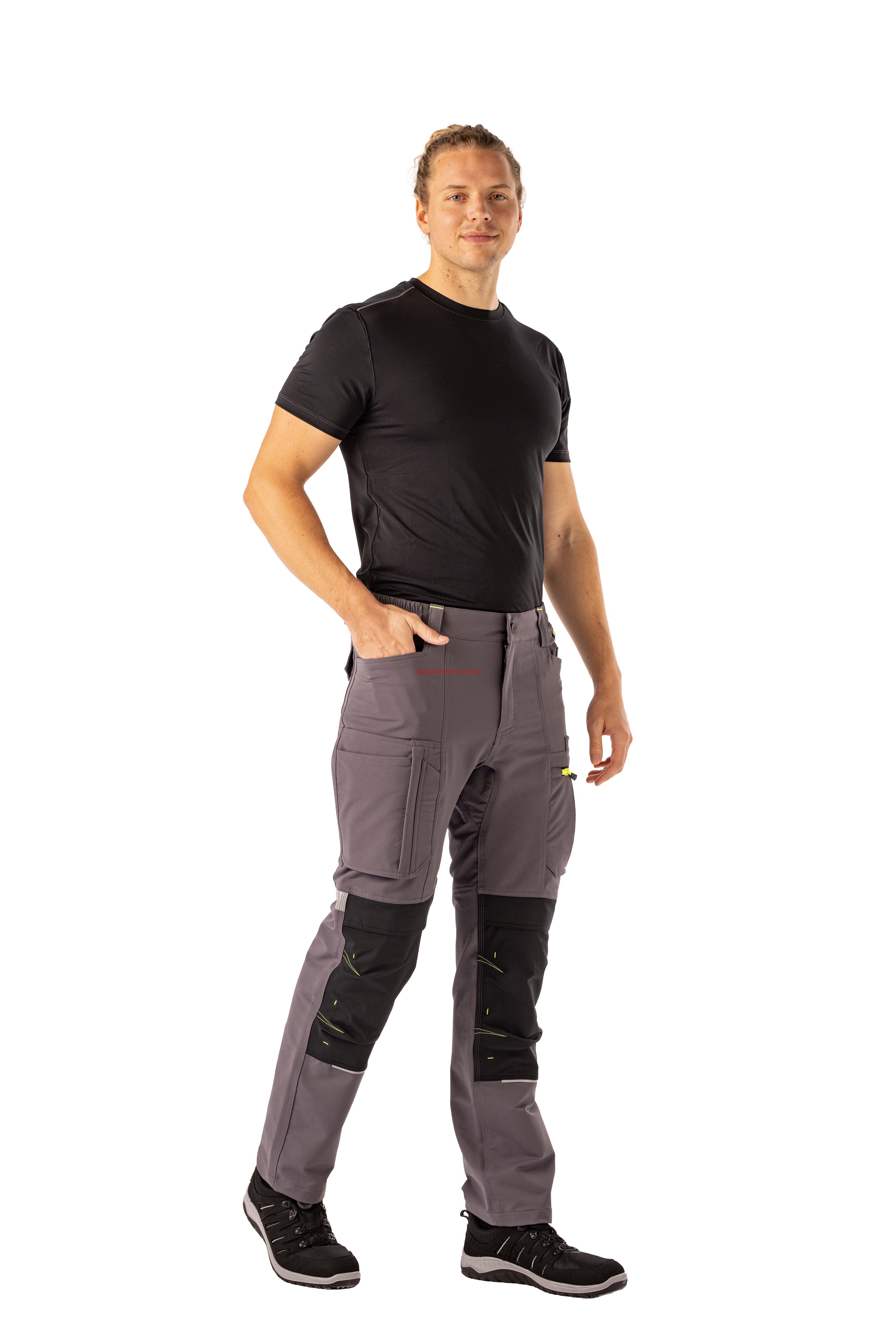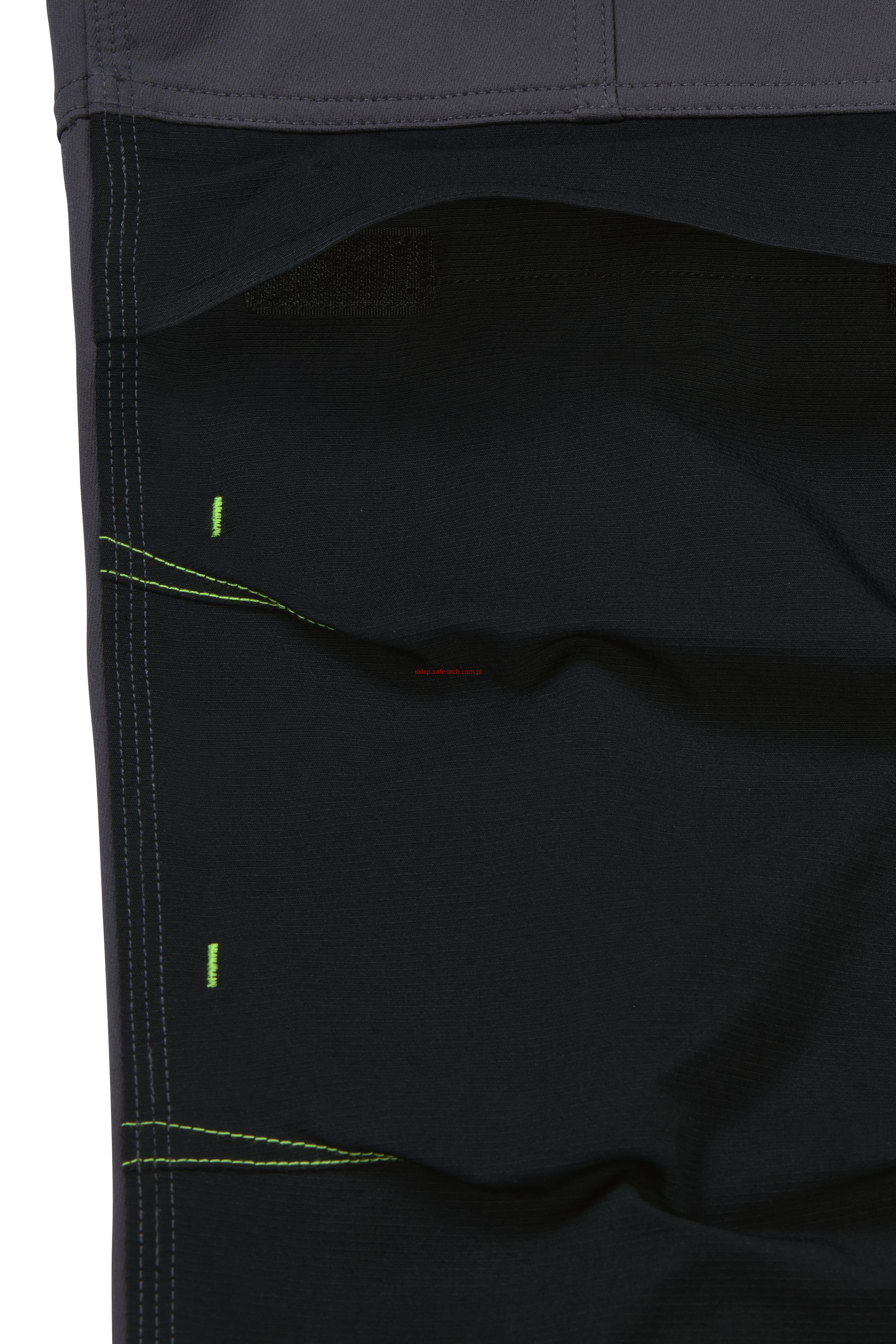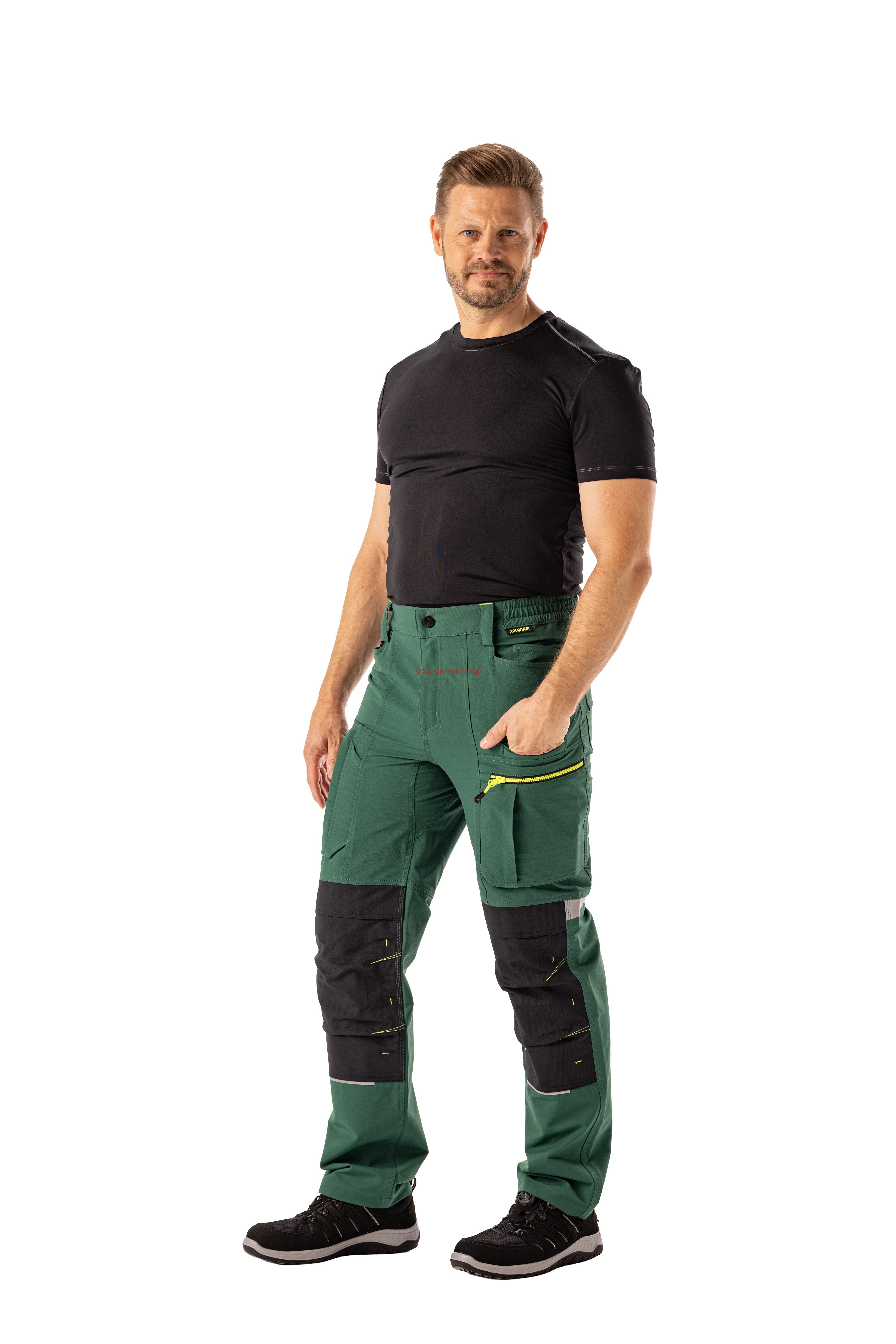 - 2 wstawiane obszerne kieszenie, kieszeń z lewej strony na komórkę, talia z elastyczną wstawką, talia z 5 szlufkami i guzikiem dżinsowym, 2 naszyte kieszenie na kolanach obsługiwane od góry, rozporek zamykany na zamek błyskawiczny, szlufka na młotek, odblaskowe aplikacje, kieszeń po prawej stronie z małą kieszonką zapinaną na suwak, kieszeń po lewej stronie z dużą kieszenią na telefon komórkowy, podwójna kieszeń na udzie po prawej stronie z zamkiem błyskawicznym i przegrodą na długopisy, kieszeń na lewym udzie z zamkiem błyskawicznym i dużą kieszenią na telefon komórkowy, 2 tylne kieszenie, prawa tylna kieszeń z klapką i odblaskową aplikacją.