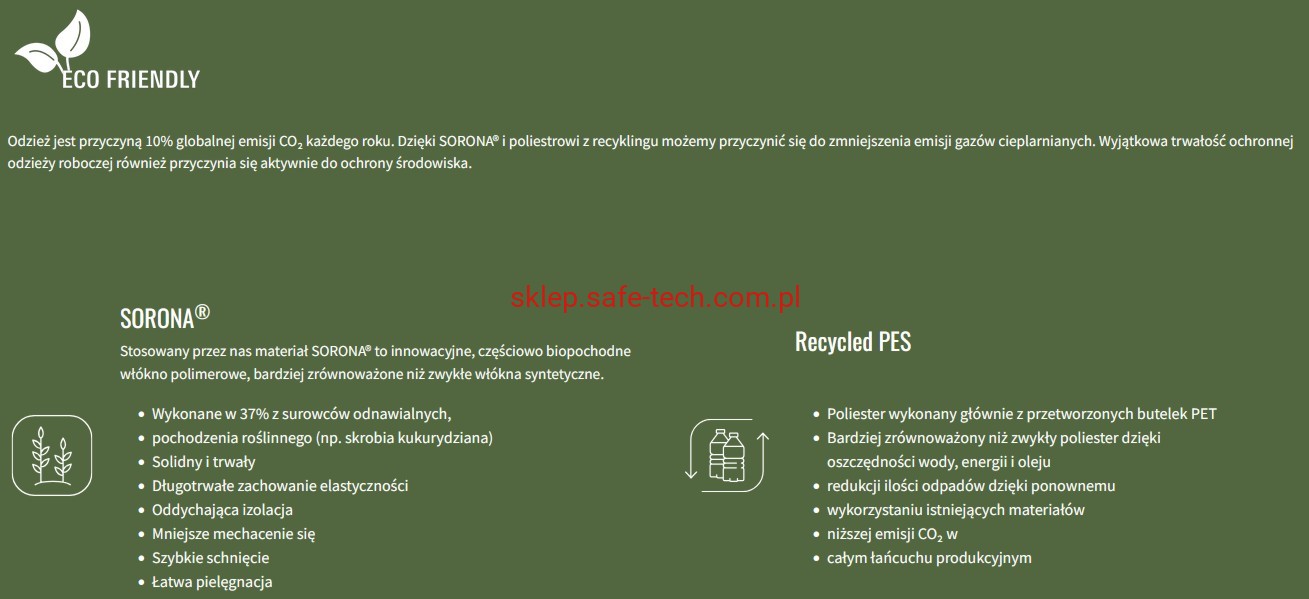 - materiał wierzchni - 100% poliester (75% Sorona®, 25 % recyklingowany poliester) ok. 240 g/m2; materiał kontrastowy - 90% nylon, 10% elastan, ok. 240 g/m2; wypełnienie 90% poliester, 10% bawełna, ok. 110 g/m2.