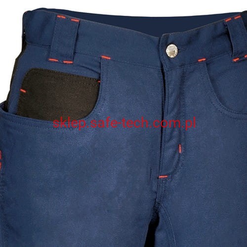 - 2 tylne kieszenie w tym jedna z patką, regulowana talia, kieszonka na monetę, pętla na młotek, ergonomiczny fason kolan i nogawek, kieszeń na długopis, wzmocnione krocze, kieszeń na linijkę, kieszeń boczna, szerokie kieszenie przednie, zamek YKK