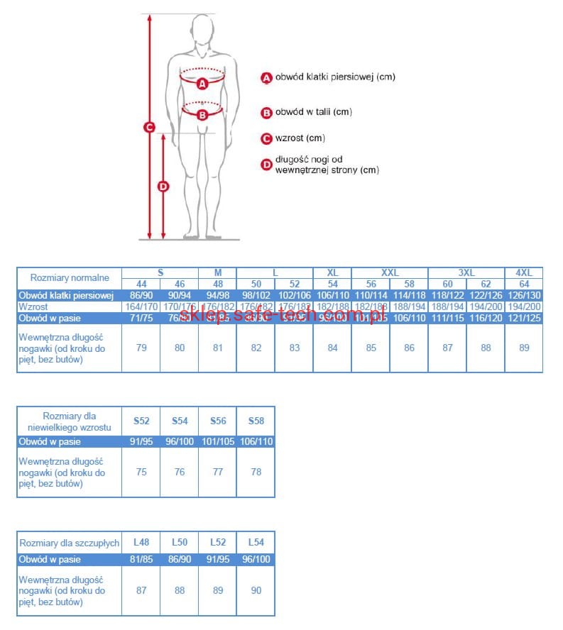 - rozmiary: normalne 44 - 64 (kolor czarny, granatowy i antracytowy rozmiary 40 - 66), dla niskiego wzrostu S52 - S58, dla szczupłych L48 - L54