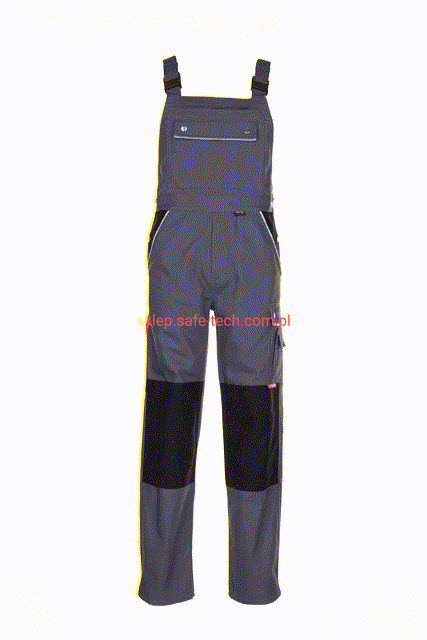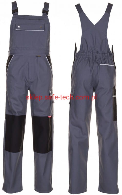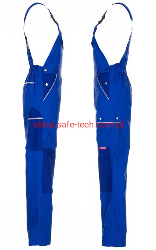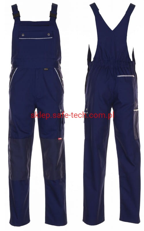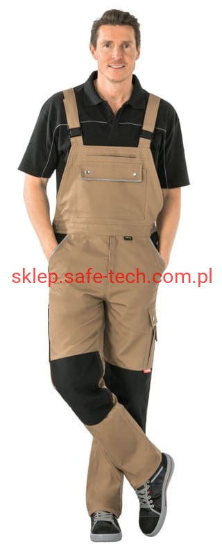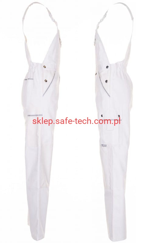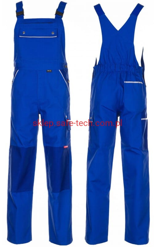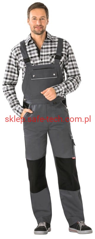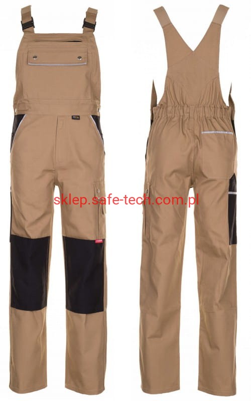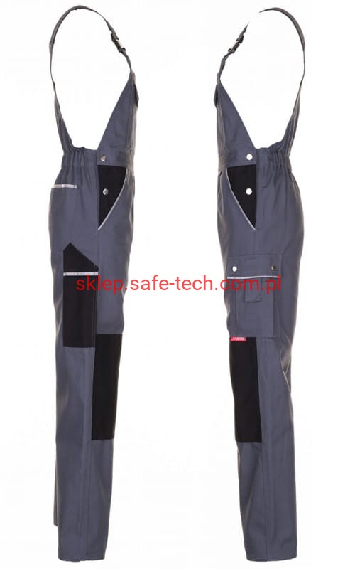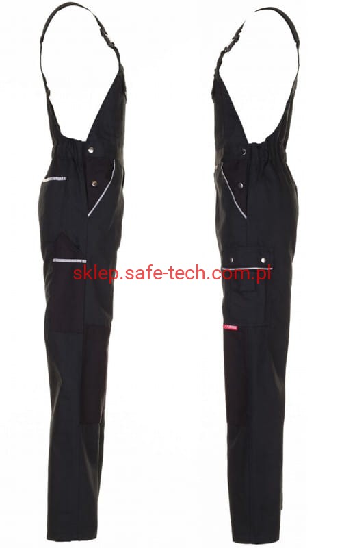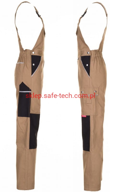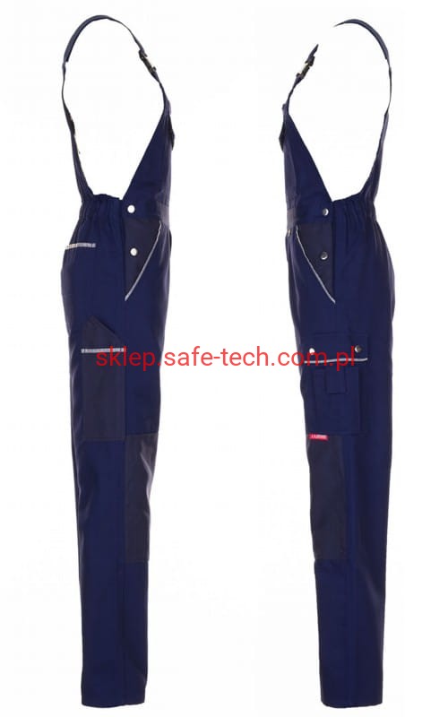 - ściągacz z gumką w pasie, wysoki, zachodzący na plecy tył spodni ze skrzyżowanymi szelkami, szelki z elastyczną wstawką, klamrowe zapięcie na szelkach, rozporek zamykany na zamek błyskawiczny