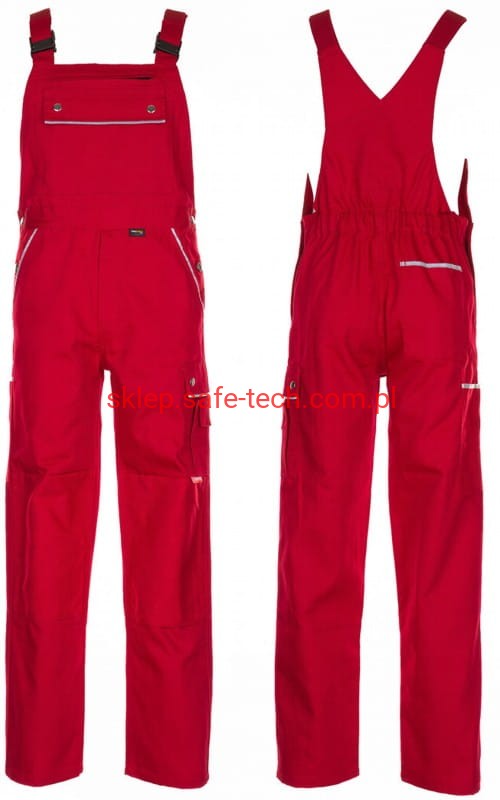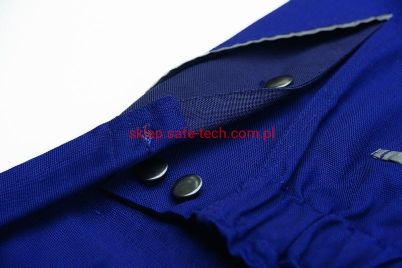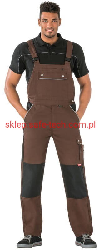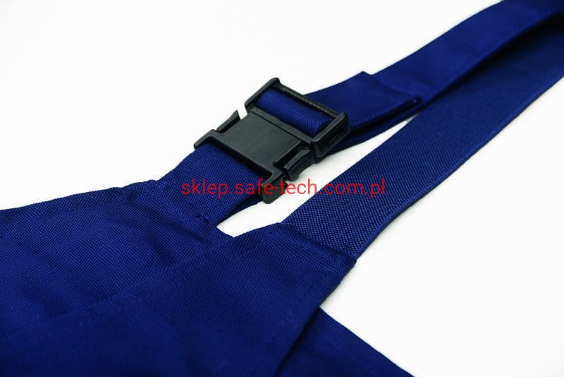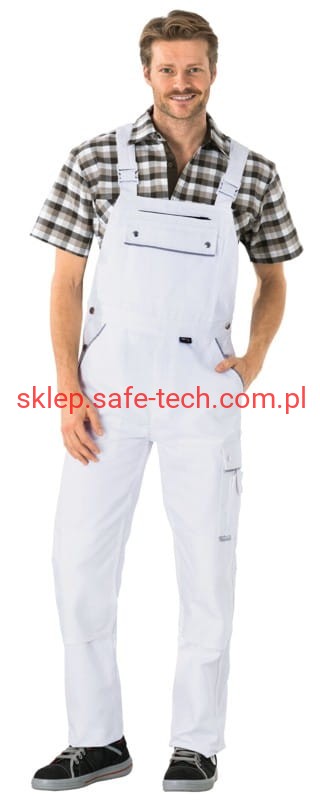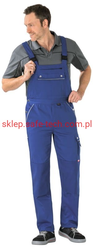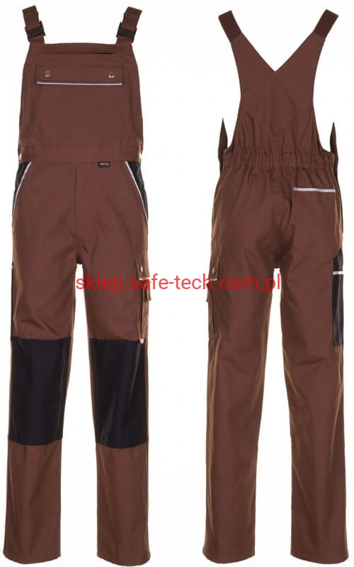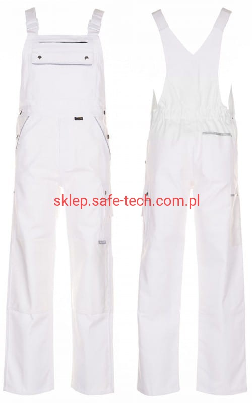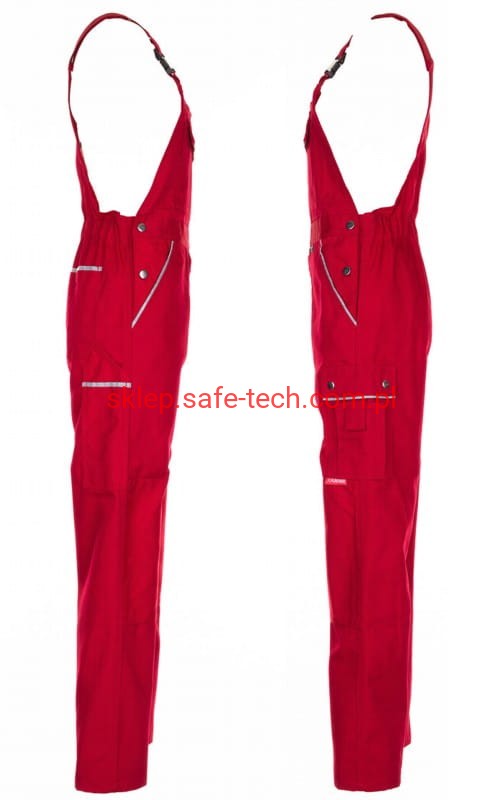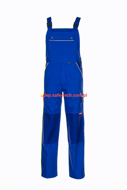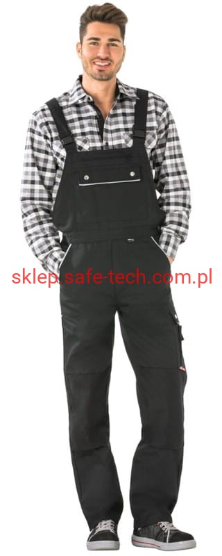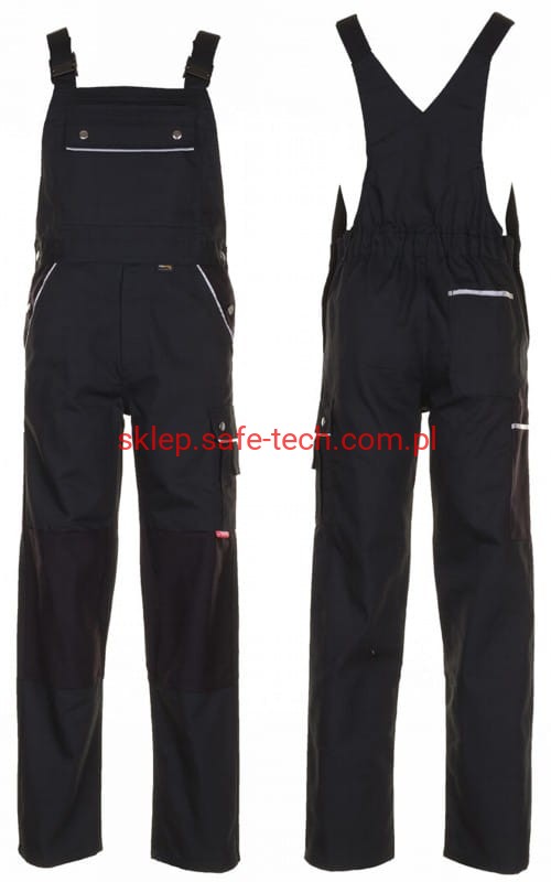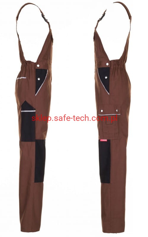 - ściągacz z gumką w pasie, wysoki, zachodzący na plecy tył spodni ze skrzyżowanymi szelkami, szelki z elastyczną wstawką, klamrowe zapięcie na szelkach, rozporek zamykany na zamek błyskawiczny