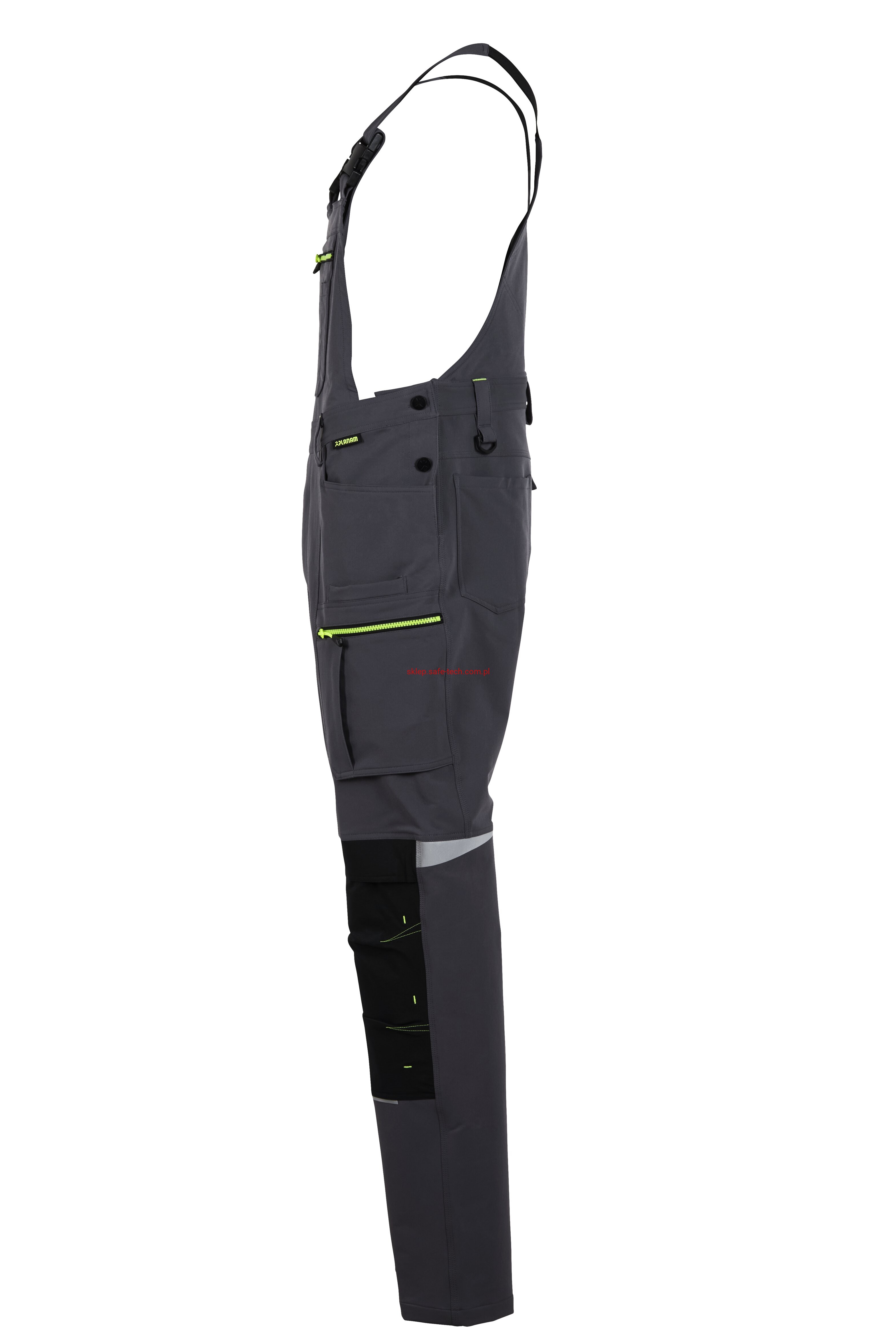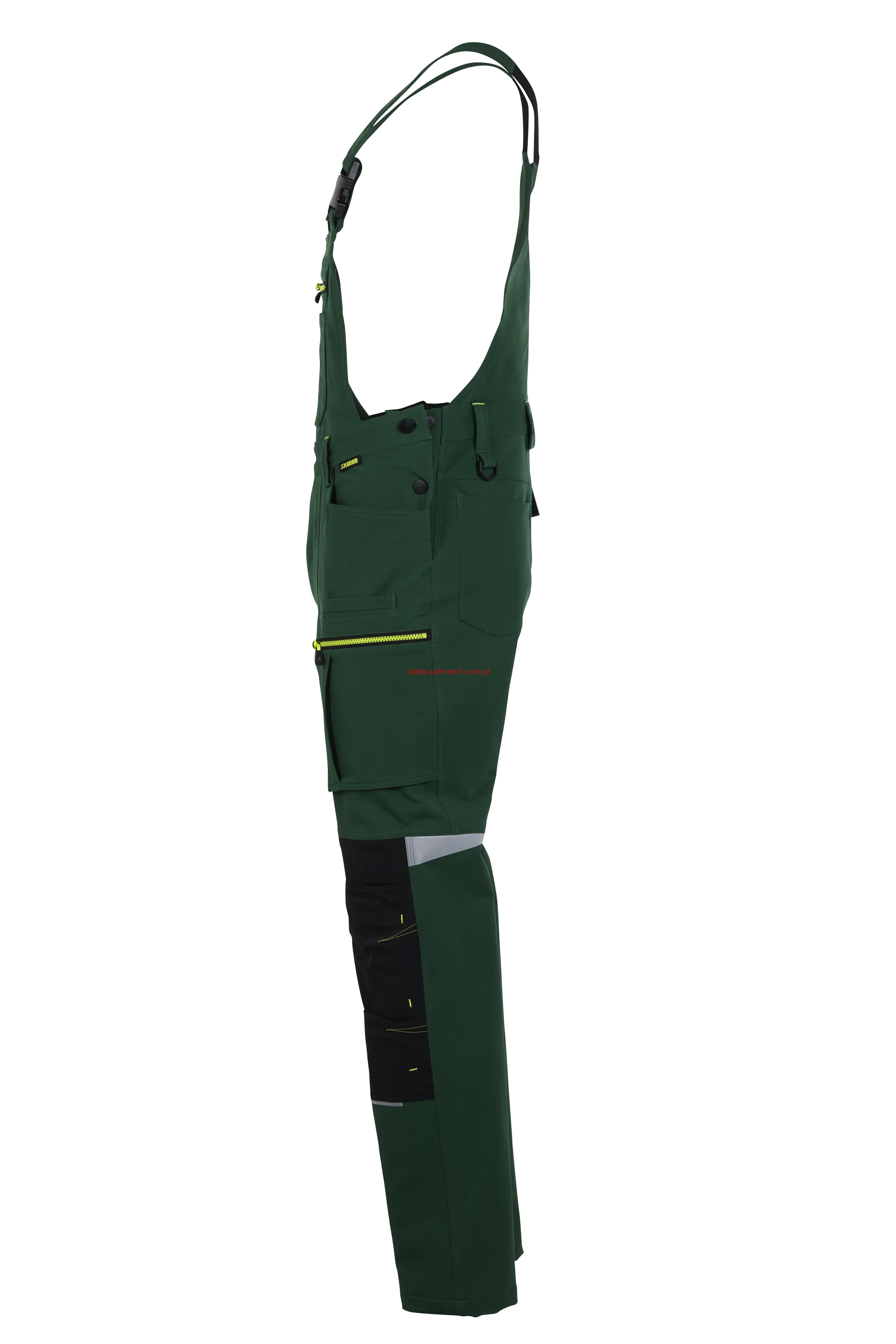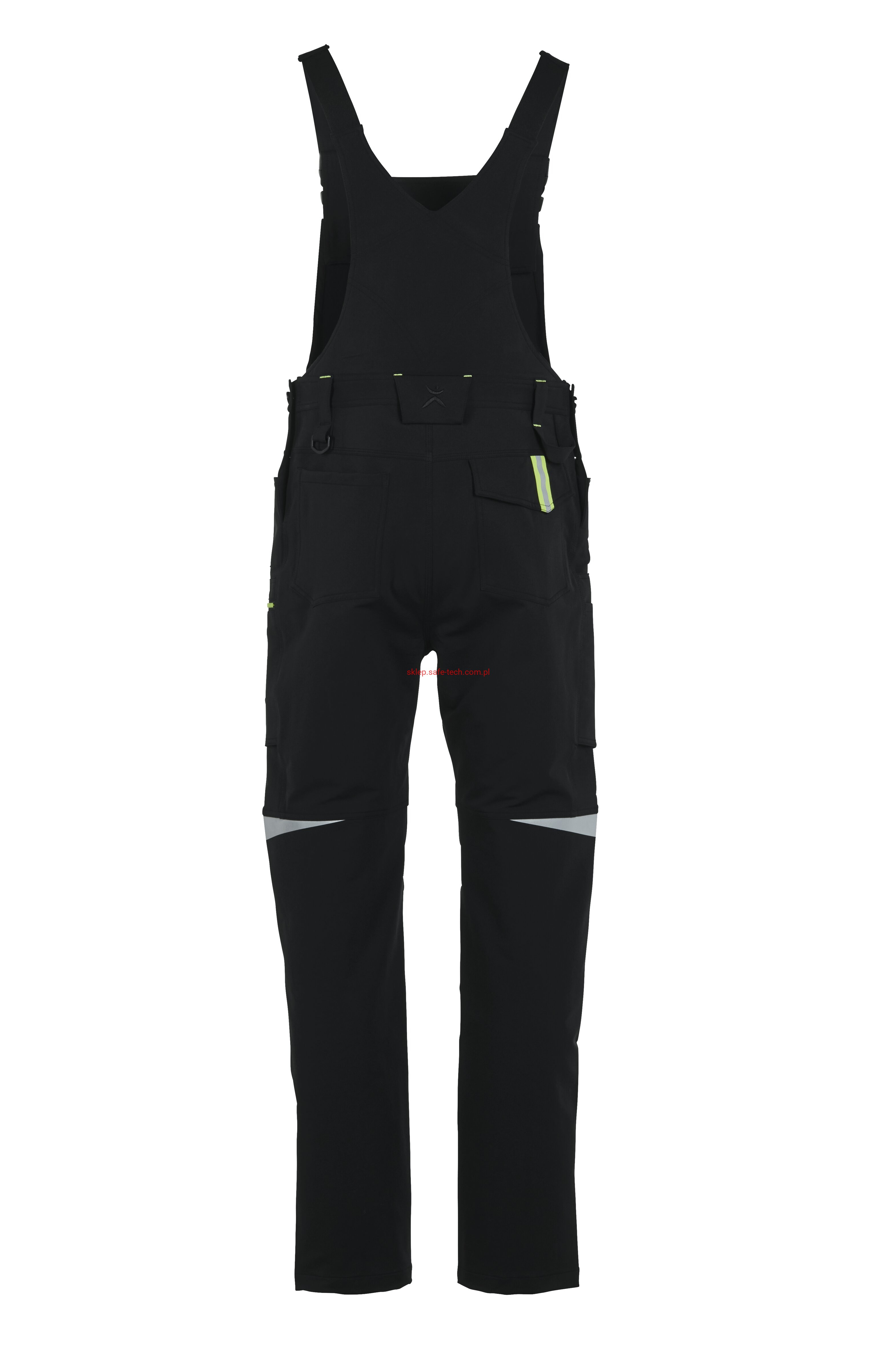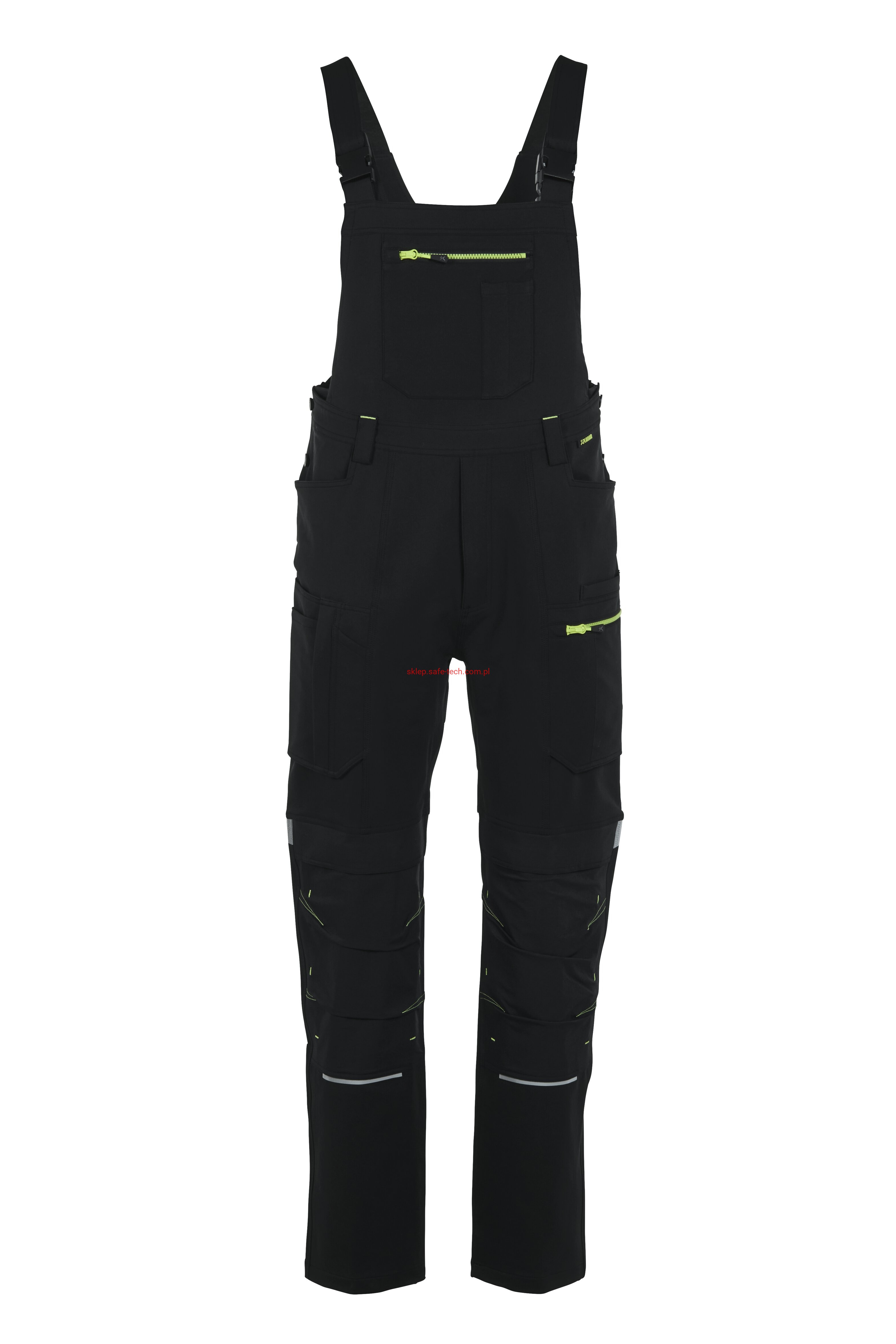 - 2 wstawiane obszerne kieszenie, 2 naszyte kieszenie na kolanach obsługiwane od góry, kieszeń na klapie z zamkiem błyskawicznym, regulacja obwodu w pasie guzikiem dżinsowym, karczek z tyłu spodni ze skrzyżowanymi szelkami, szelki z elastyczną wstawką, 5 szerokich szlufek na pasku, szlufka na młotek, odblaskowe aplikacje, rozporek na zamek błyskawiczny, 2 naszywane kieszenie na kolanach, obsługiwane od góry, kieszeń na pasku z zamkiem błyskawicznym i 2 przegródkami na długopisy.