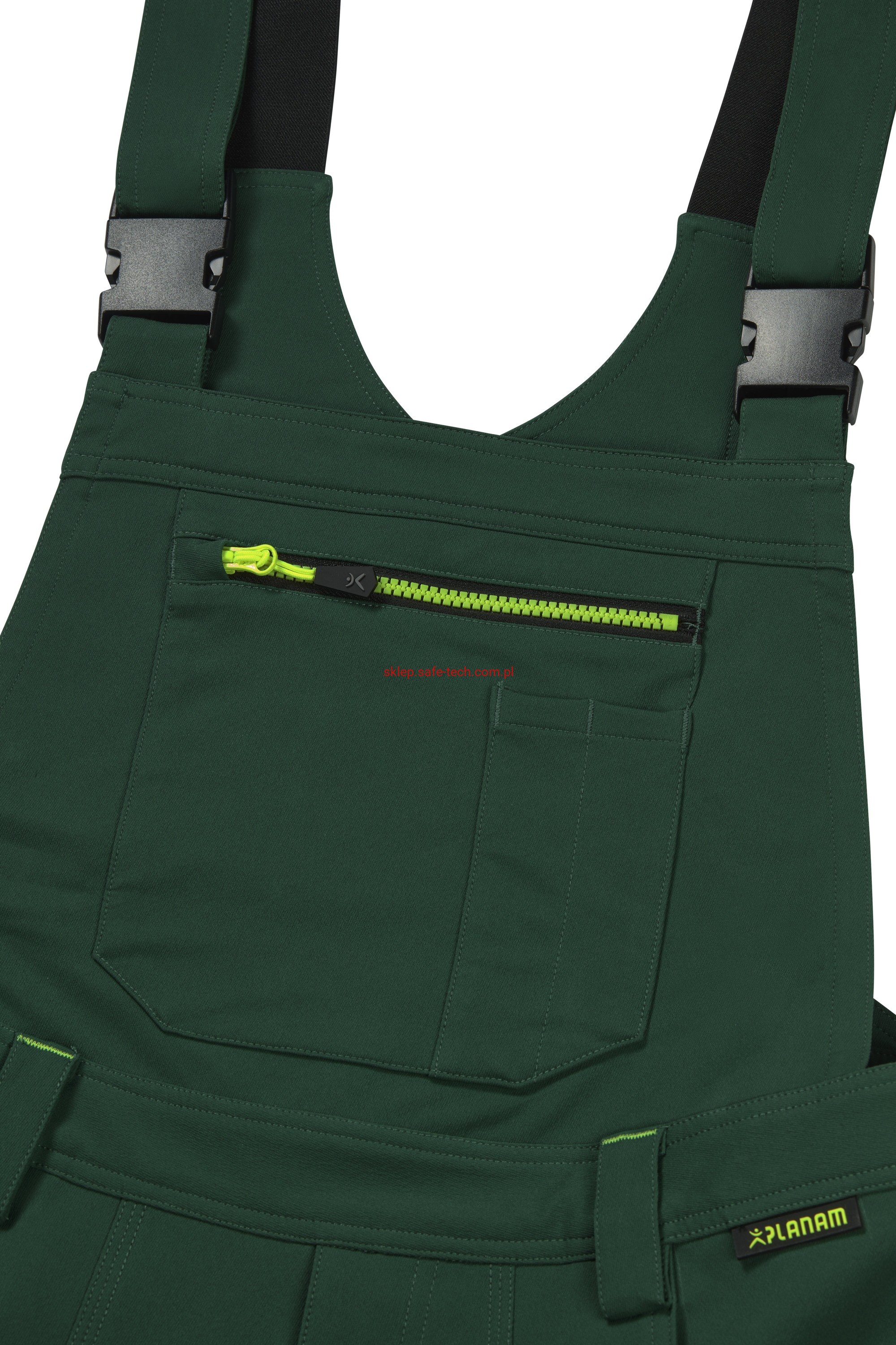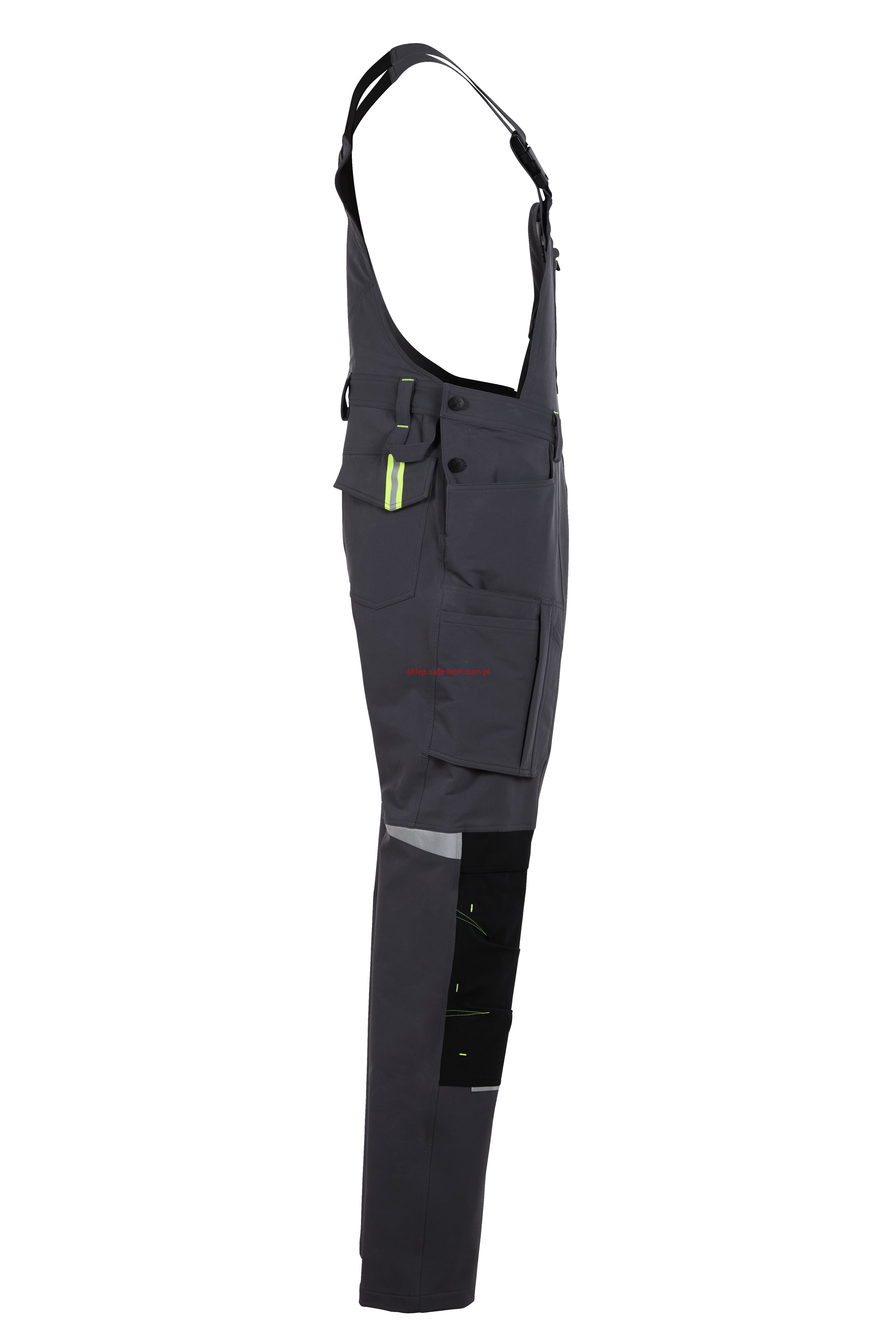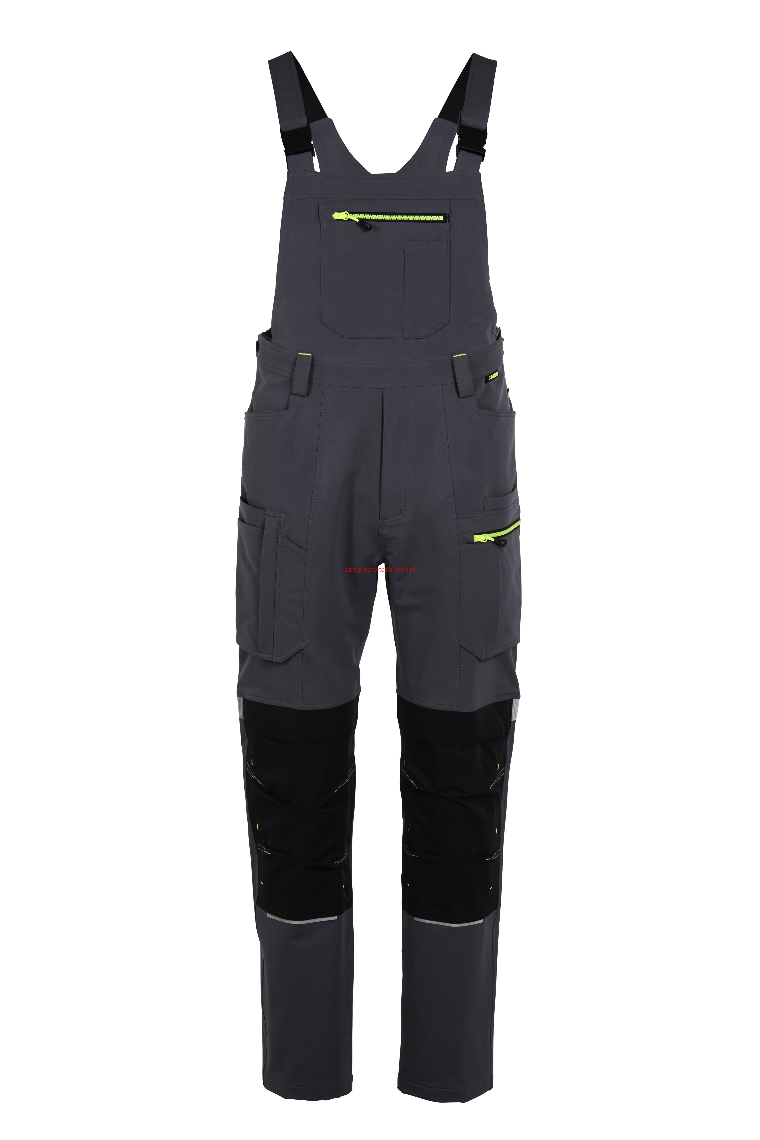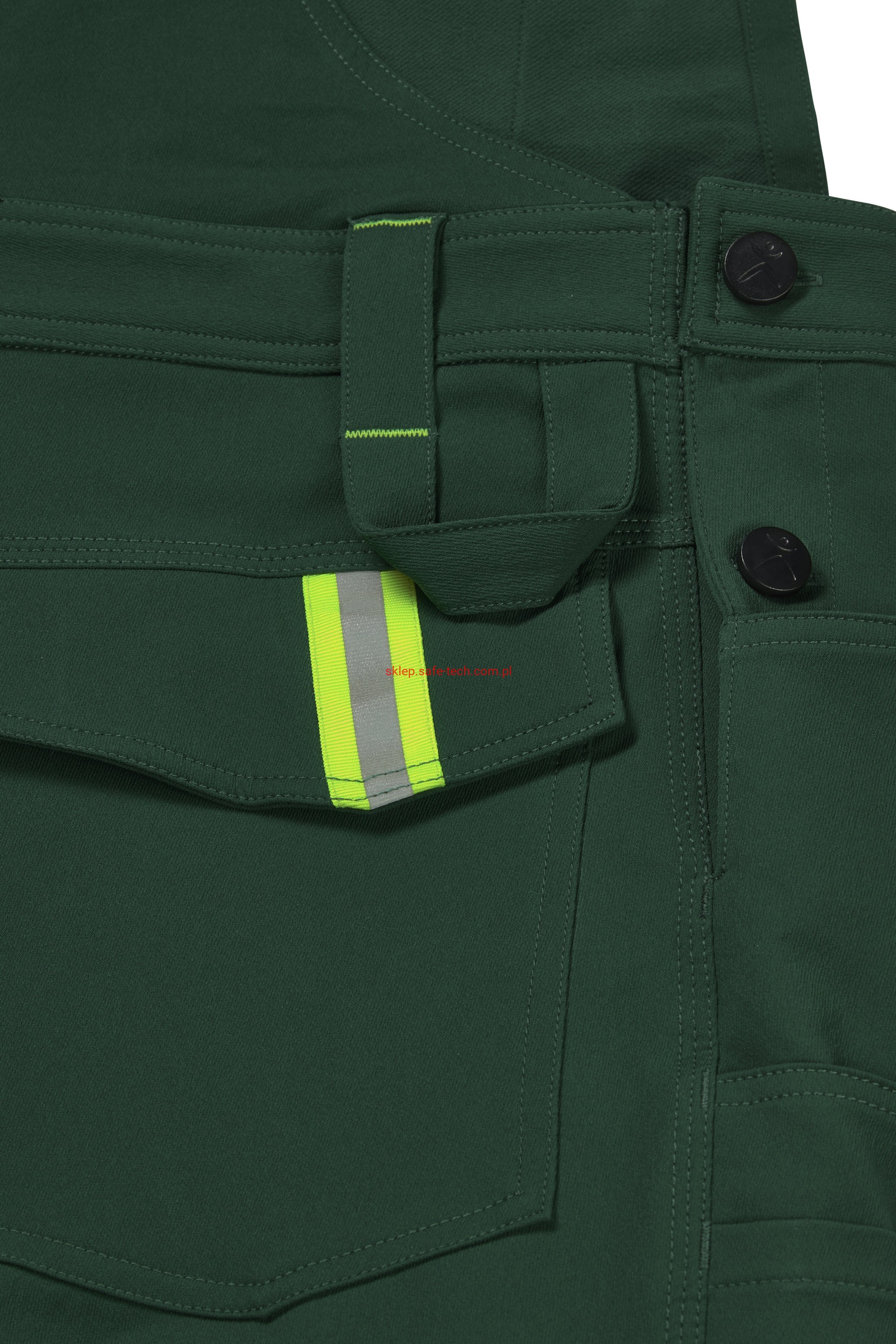 - 2 wstawiane obszerne kieszenie, 2 naszyte kieszenie na kolanach obsługiwane od góry, kieszeń na klapie z zamkiem błyskawicznym, regulacja obwodu w pasie guzikiem dżinsowym, karczek z tyłu spodni ze skrzyżowanymi szelkami, szelki z elastyczną wstawką, 5 szerokich szlufek na pasku, szlufka na młotek, odblaskowe aplikacje, rozporek na zamek błyskawiczny, 2 naszywane kieszenie na kolanach, obsługiwane od góry, kieszeń na pasku z zamkiem błyskawicznym i 2 przegródkami na długopisy.