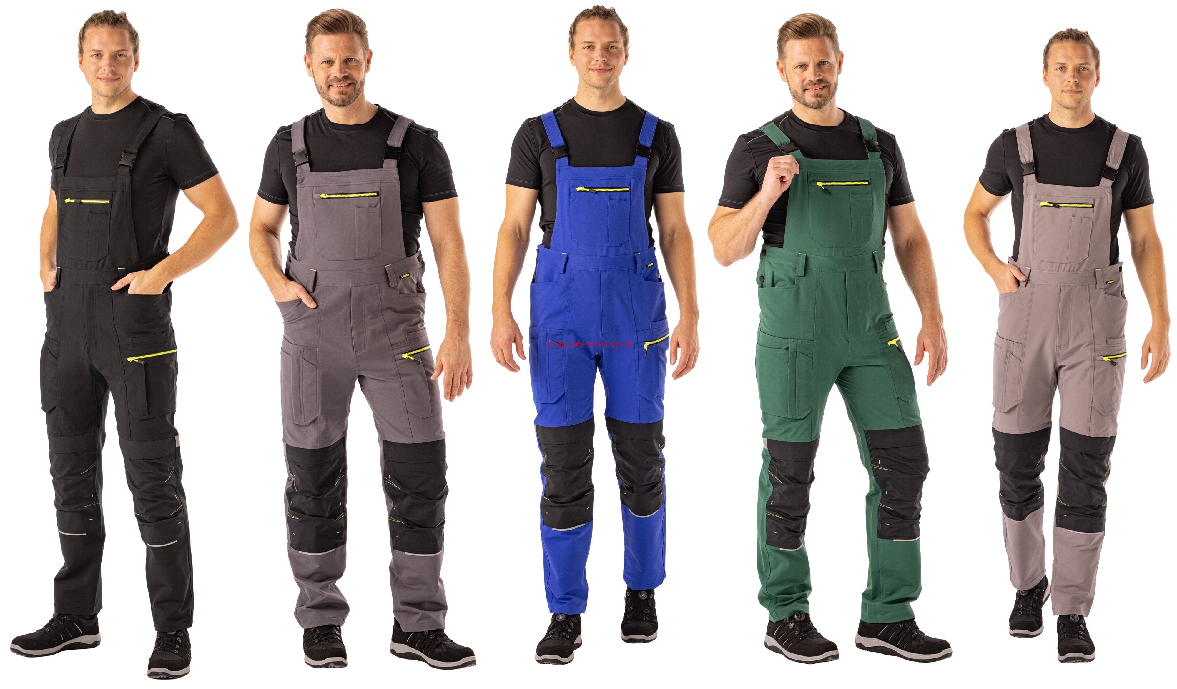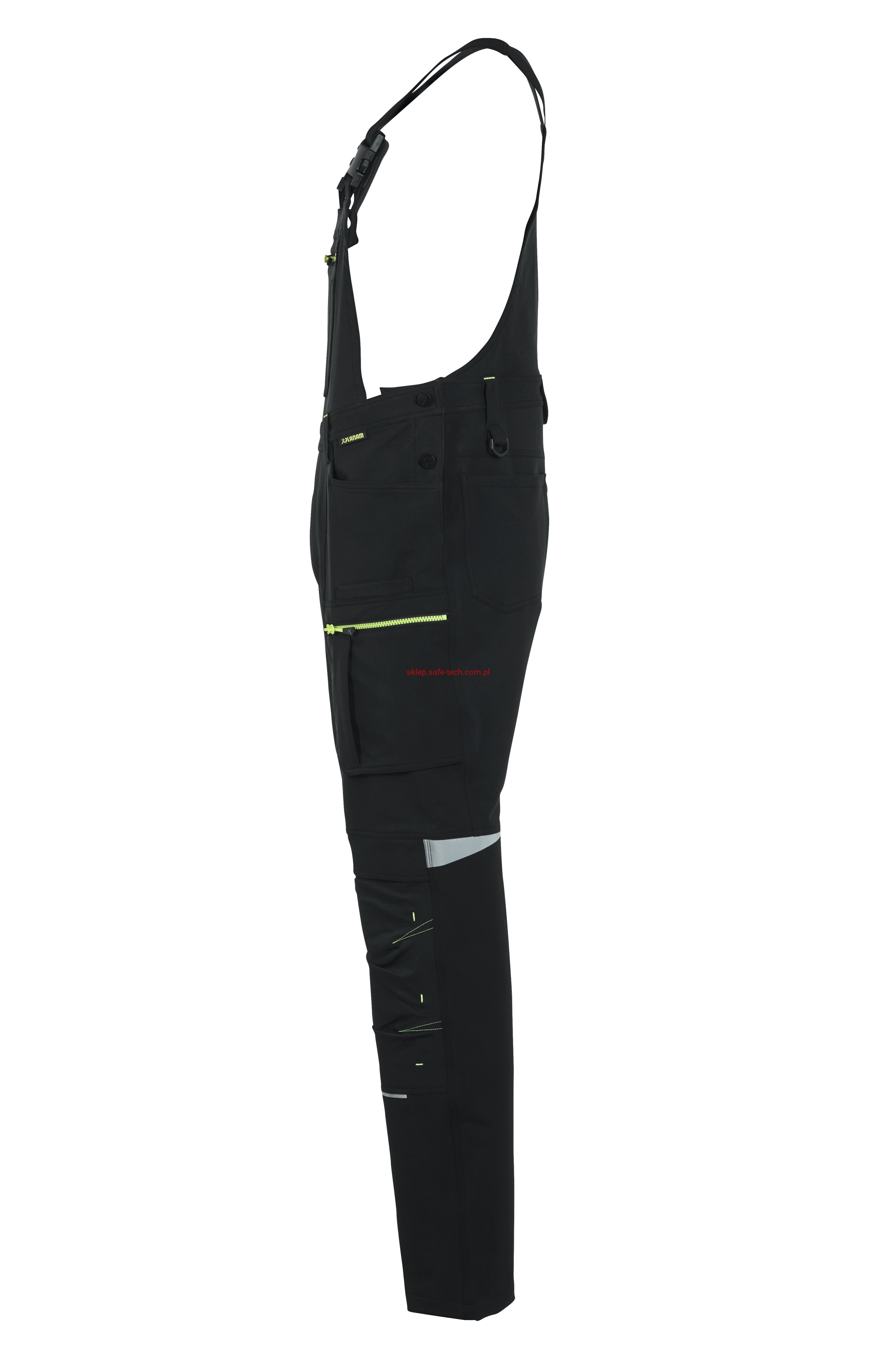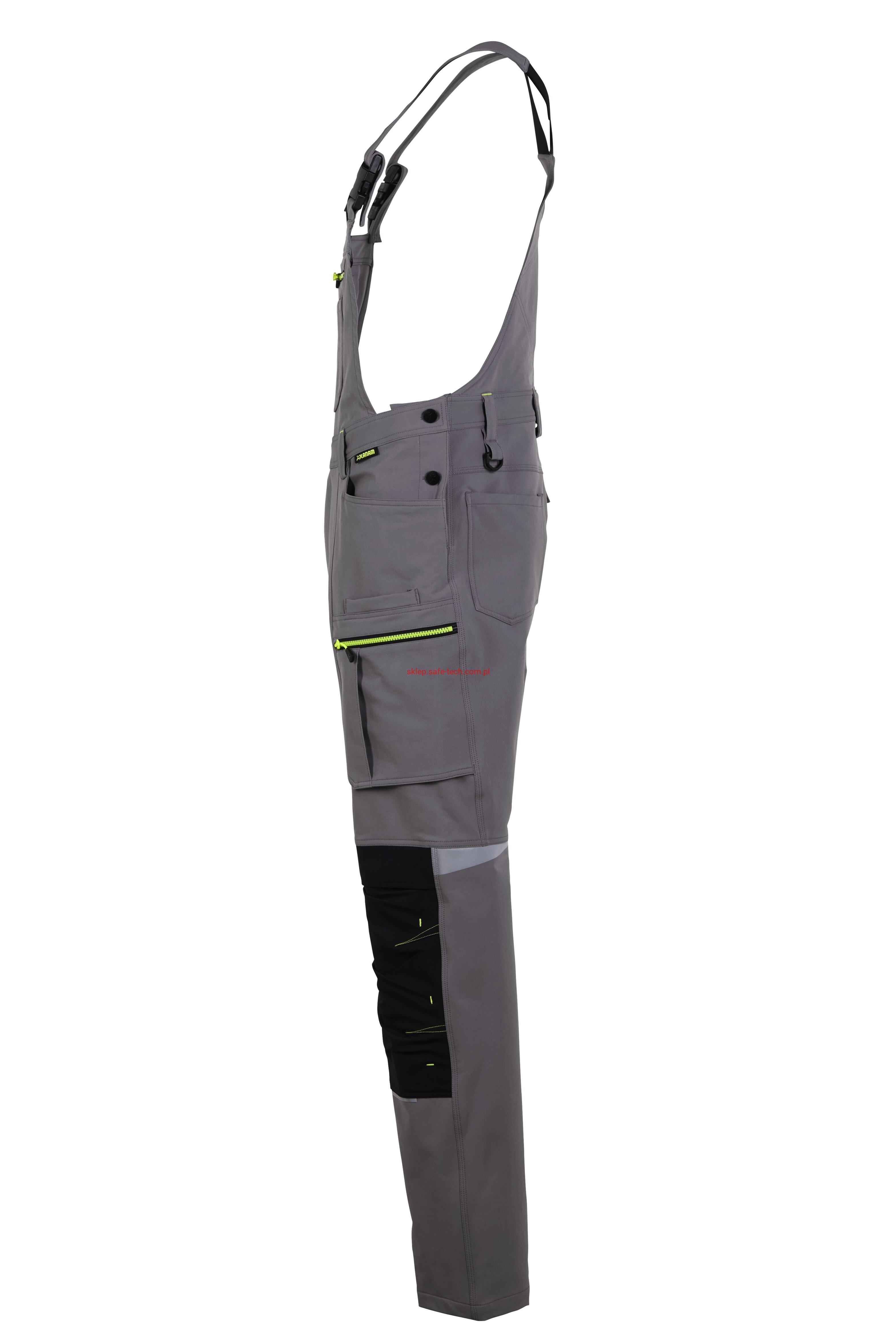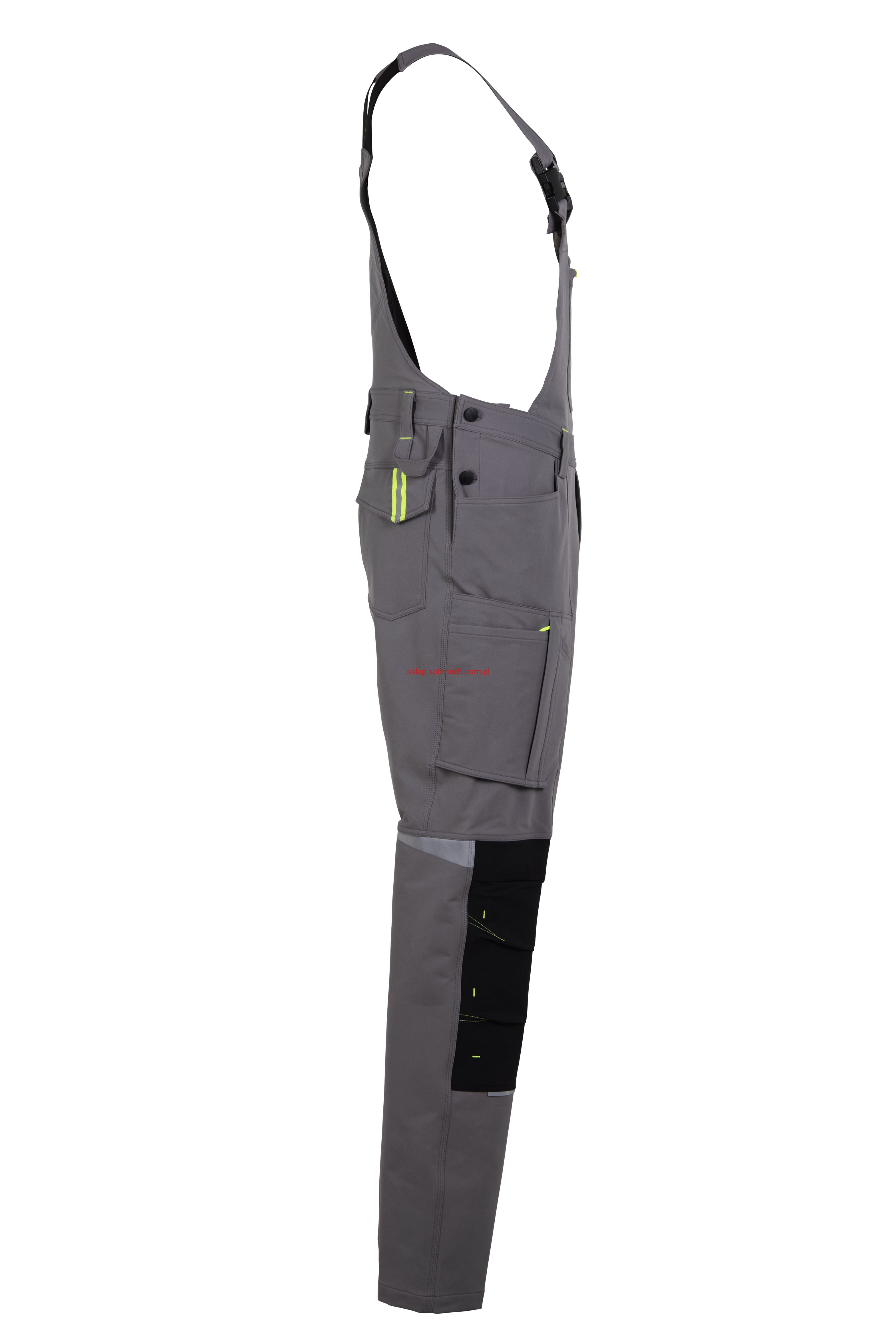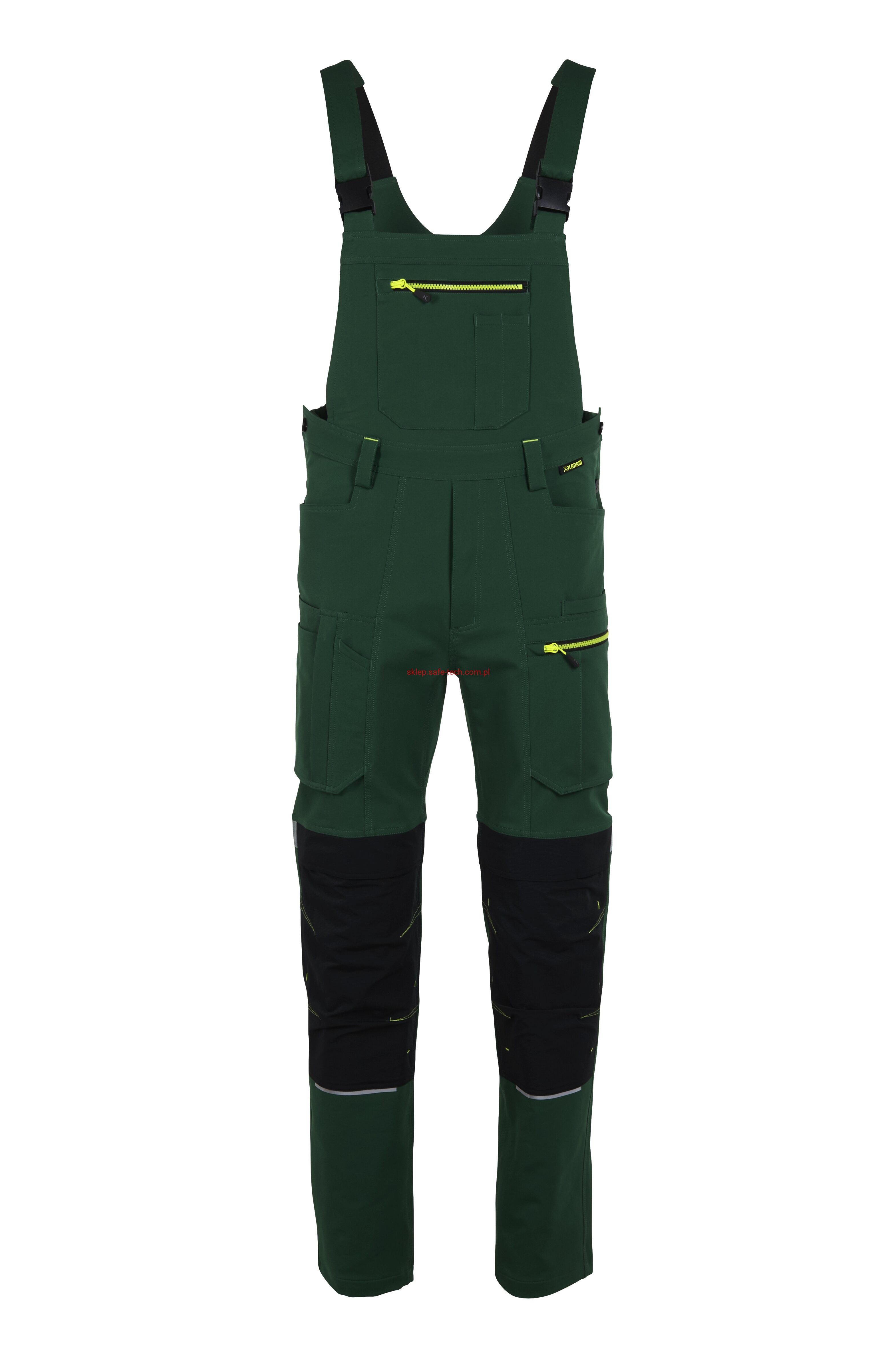 - 2 wstawiane obszerne kieszenie, 2 naszyte kieszenie na kolanach obsługiwane od góry, kieszeń na klapie z zamkiem błyskawicznym, regulacja obwodu w pasie guzikiem dżinsowym, karczek z tyłu spodni ze skrzyżowanymi szelkami, szelki z elastyczną wstawką, 5 szerokich szlufek na pasku, szlufka na młotek, odblaskowe aplikacje, rozporek na zamek błyskawiczny, 2 naszywane kieszenie na kolanach, obsługiwane od góry, kieszeń na pasku z zamkiem błyskawicznym i 2 przegródkami na długopisy.