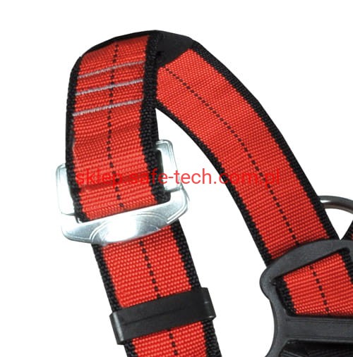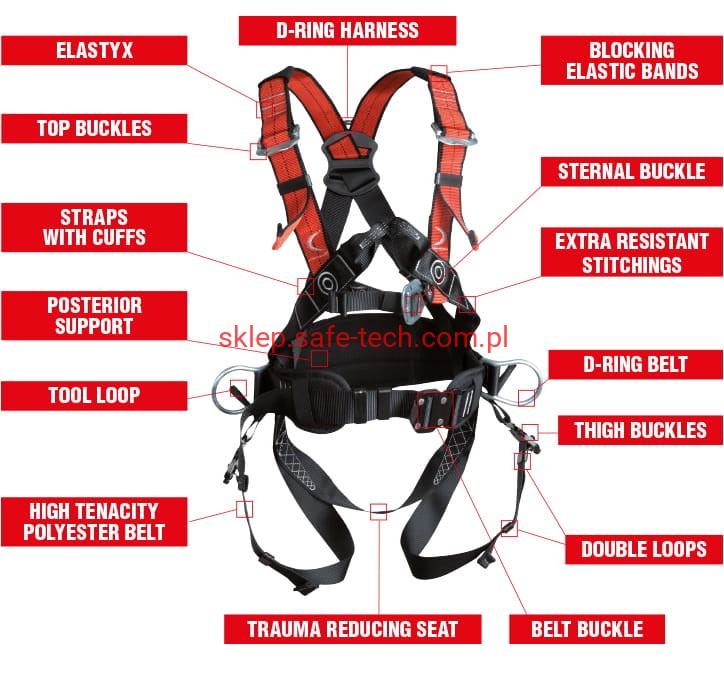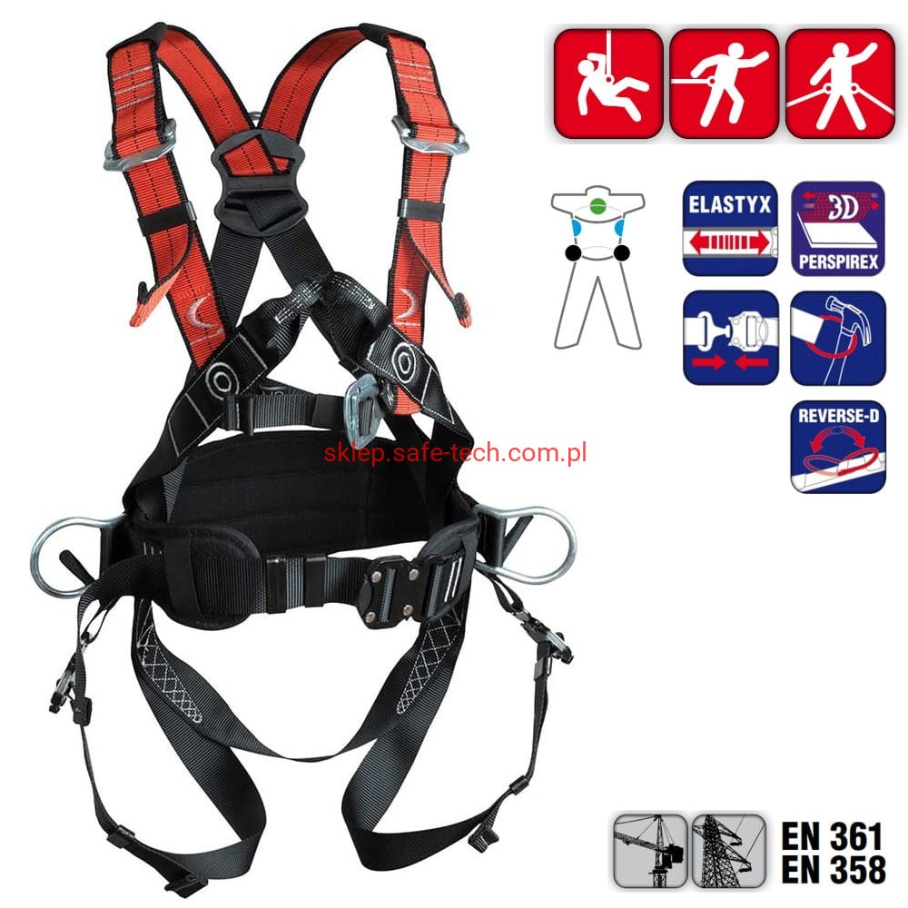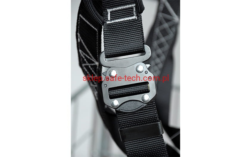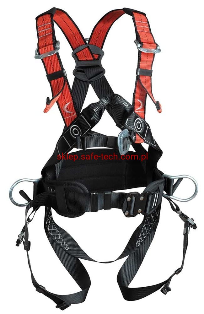 - 4 punkty mocowania: 1 z tyłu i 1 z przodu (otrzymany poprzez połączenie 2 półpunktów mocujących) do ochrony przed upadkiem z wysokości oraz 2 boczne do ograniczenia pole pracy na wysokości oraz stabilizacji pozycji pracy