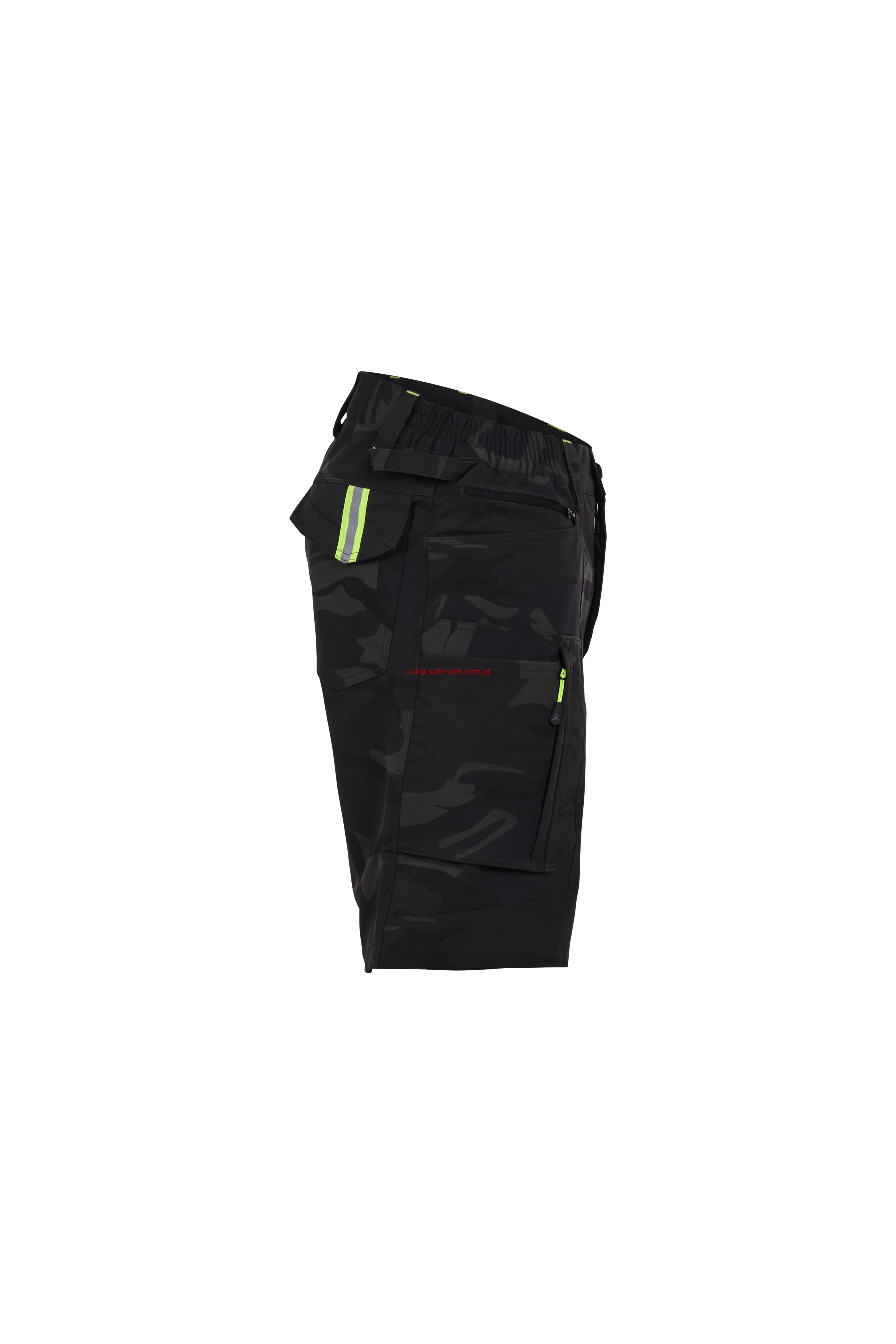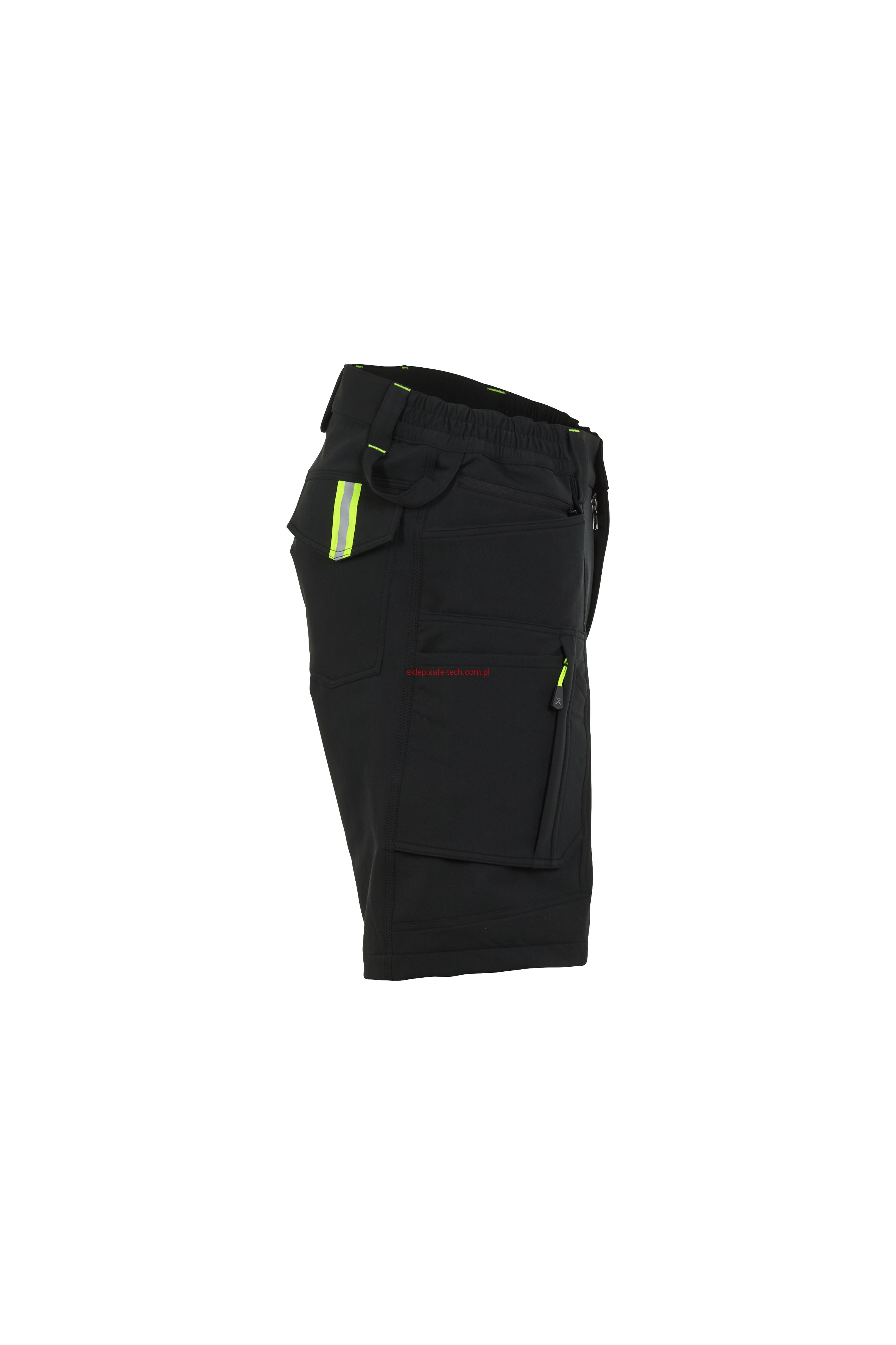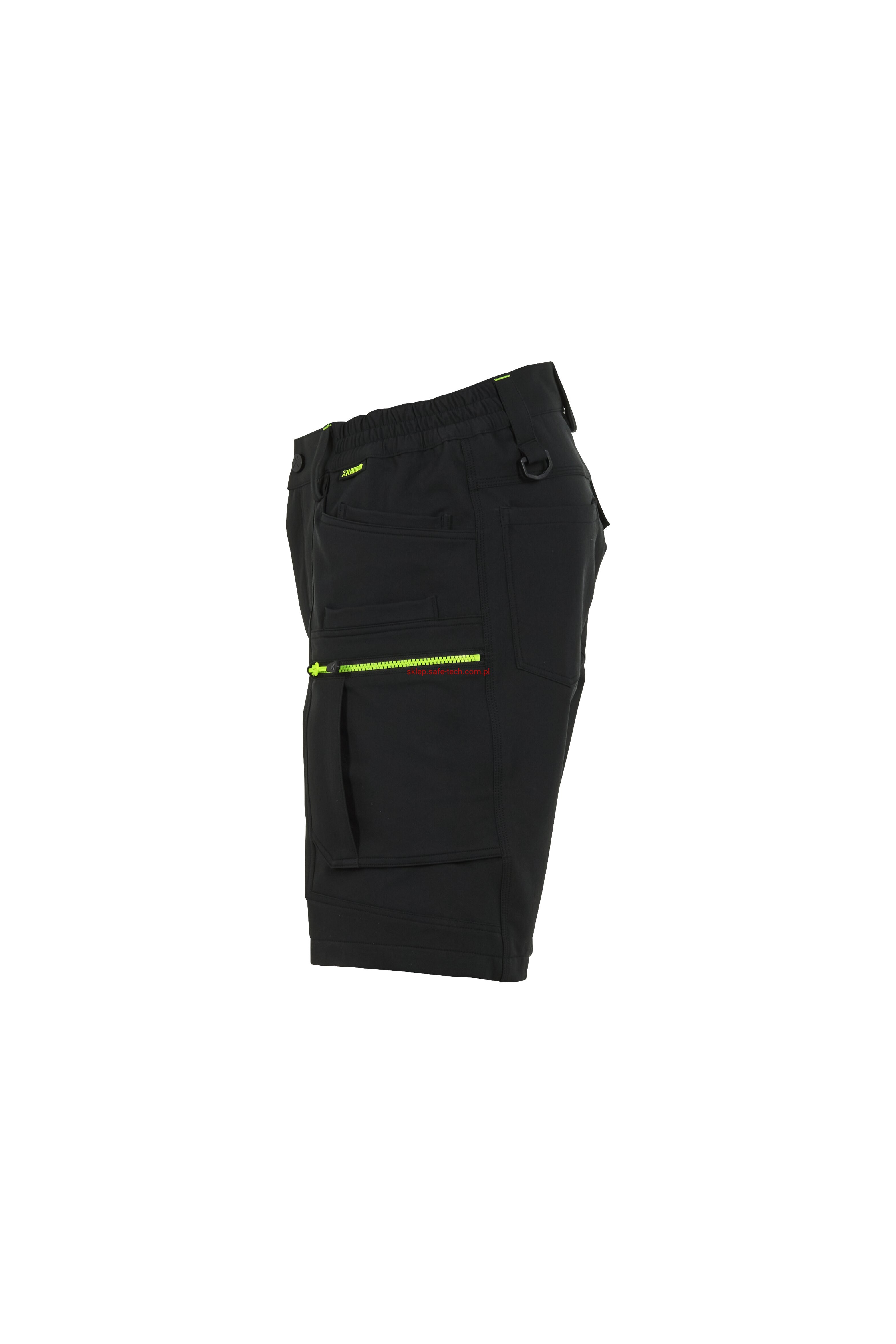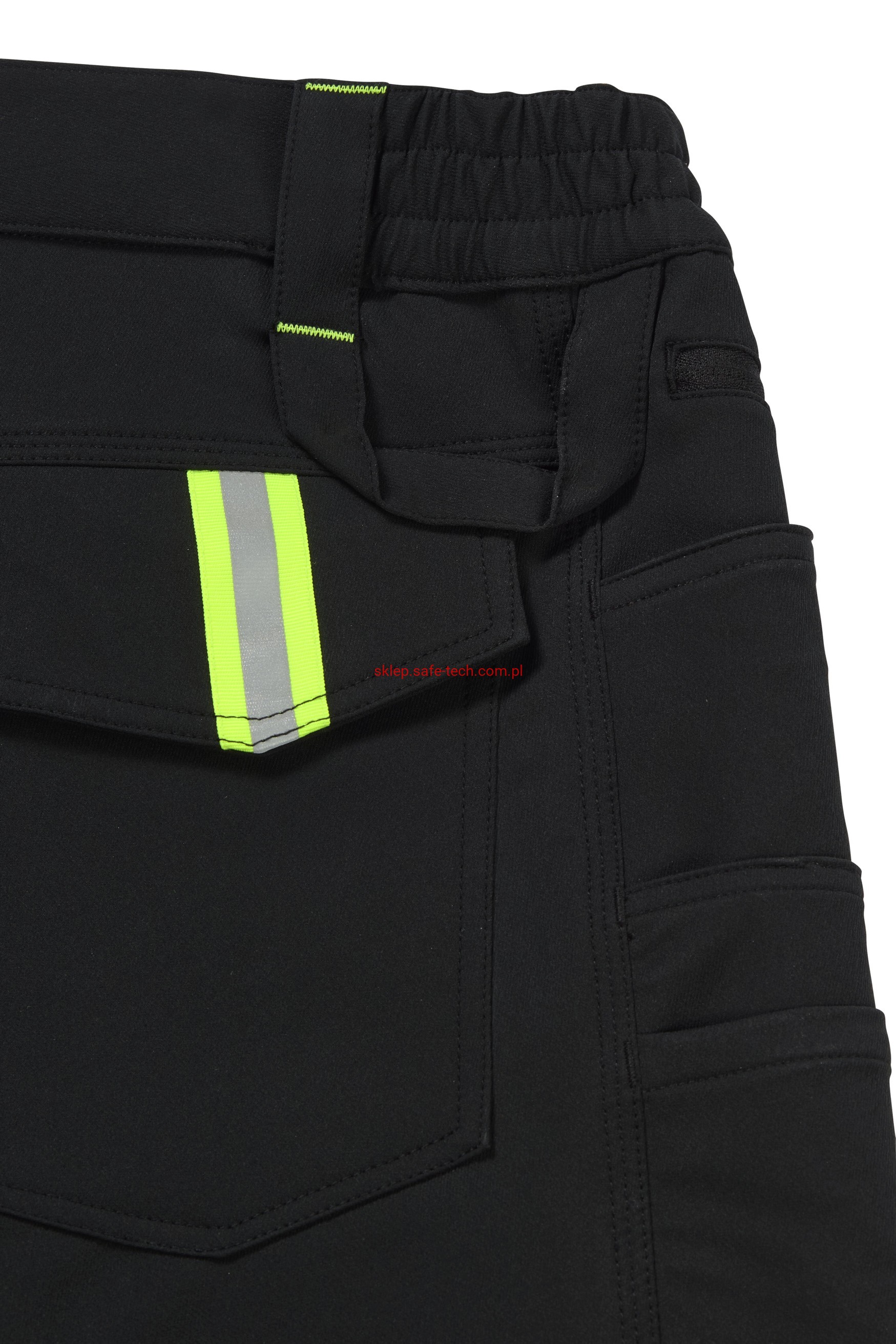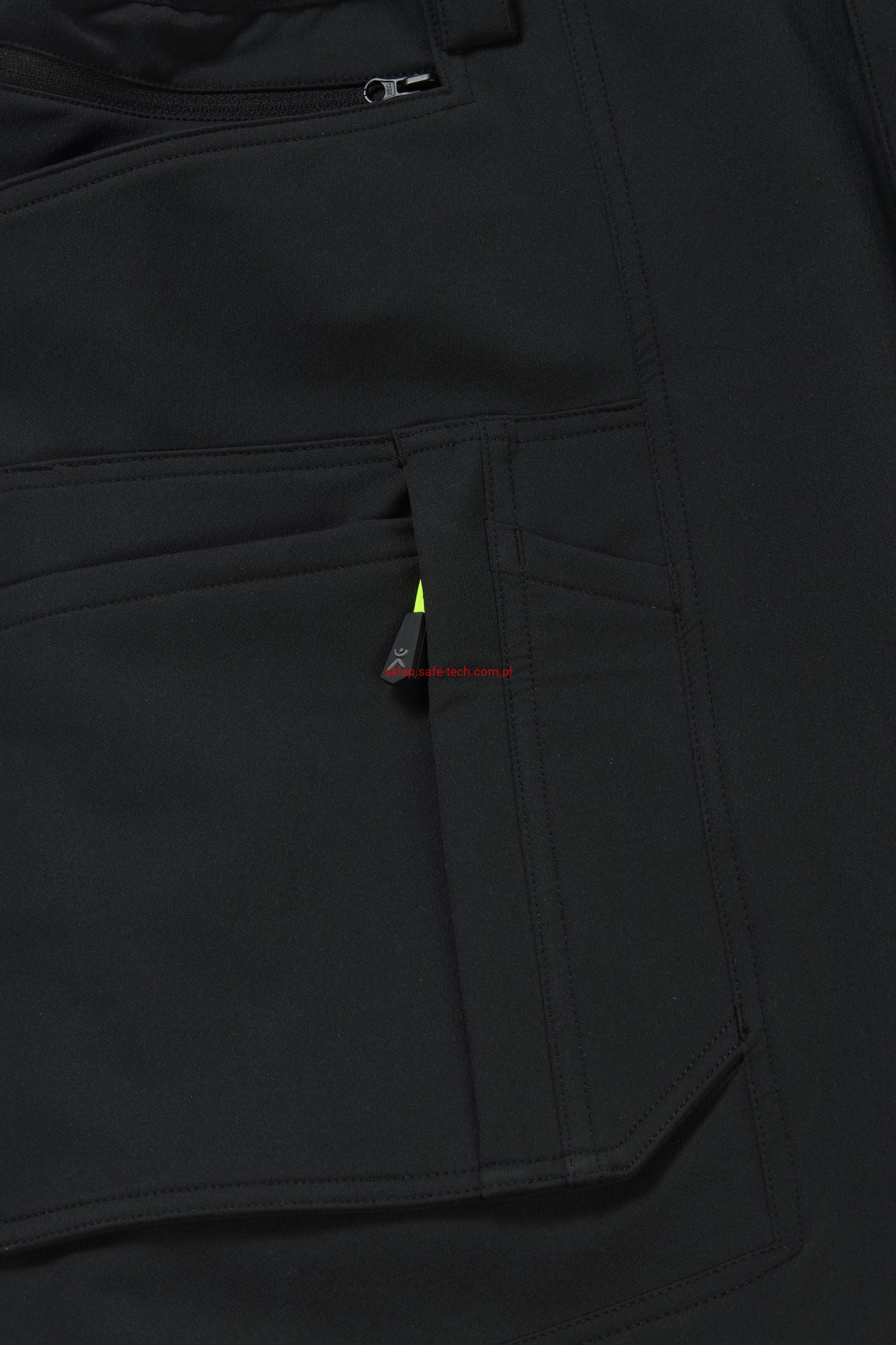 - prawa kieszeń udowa z żółtym zamkiem błyskawicznym, tylna kieszeń z patką, pas ściągnięty gumką, rozporek zamykany na zamek błyskawiczny, 5 szerokich szlufek na pasku, szlufka na młotek, odblaskowe aplikacje.