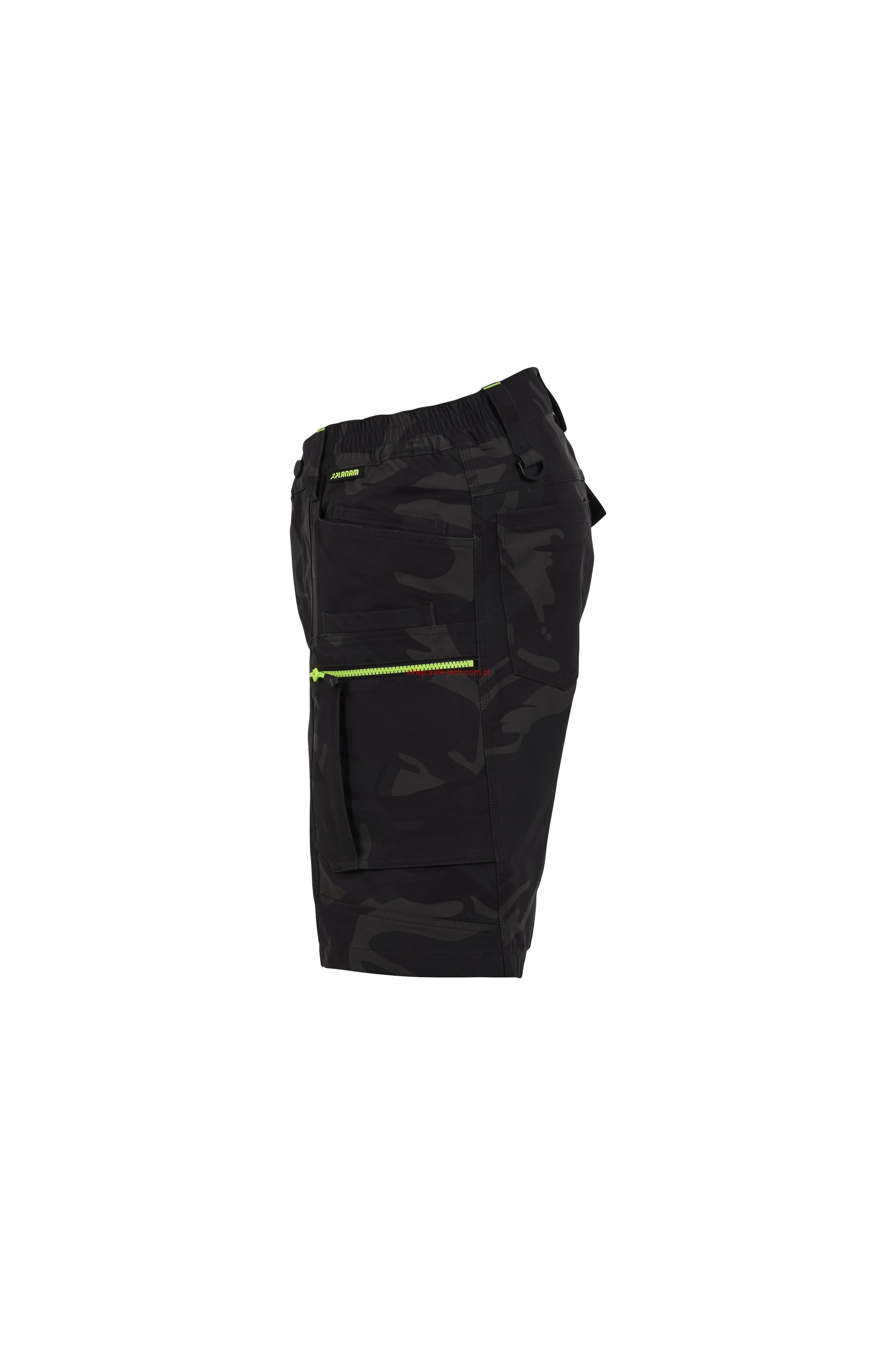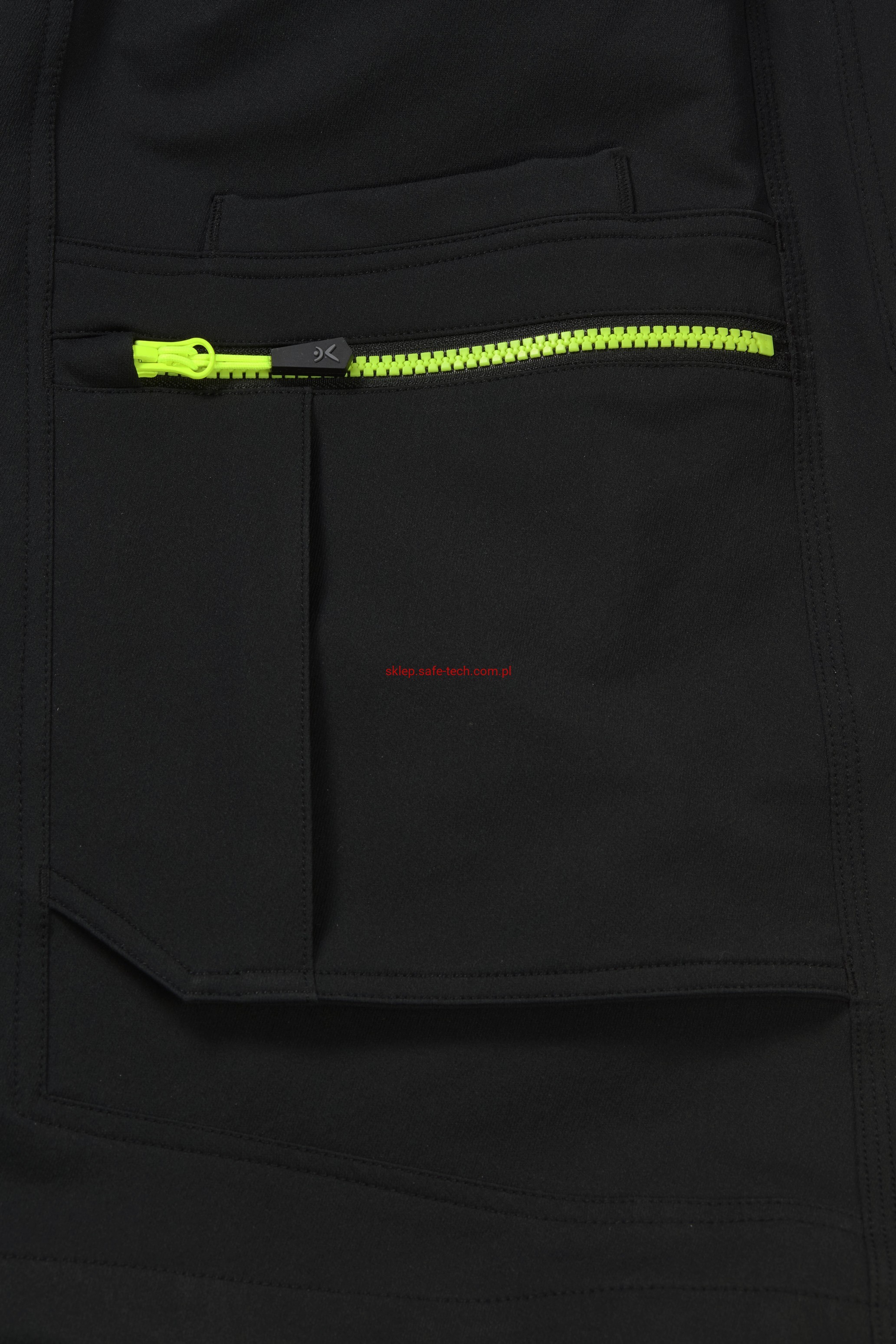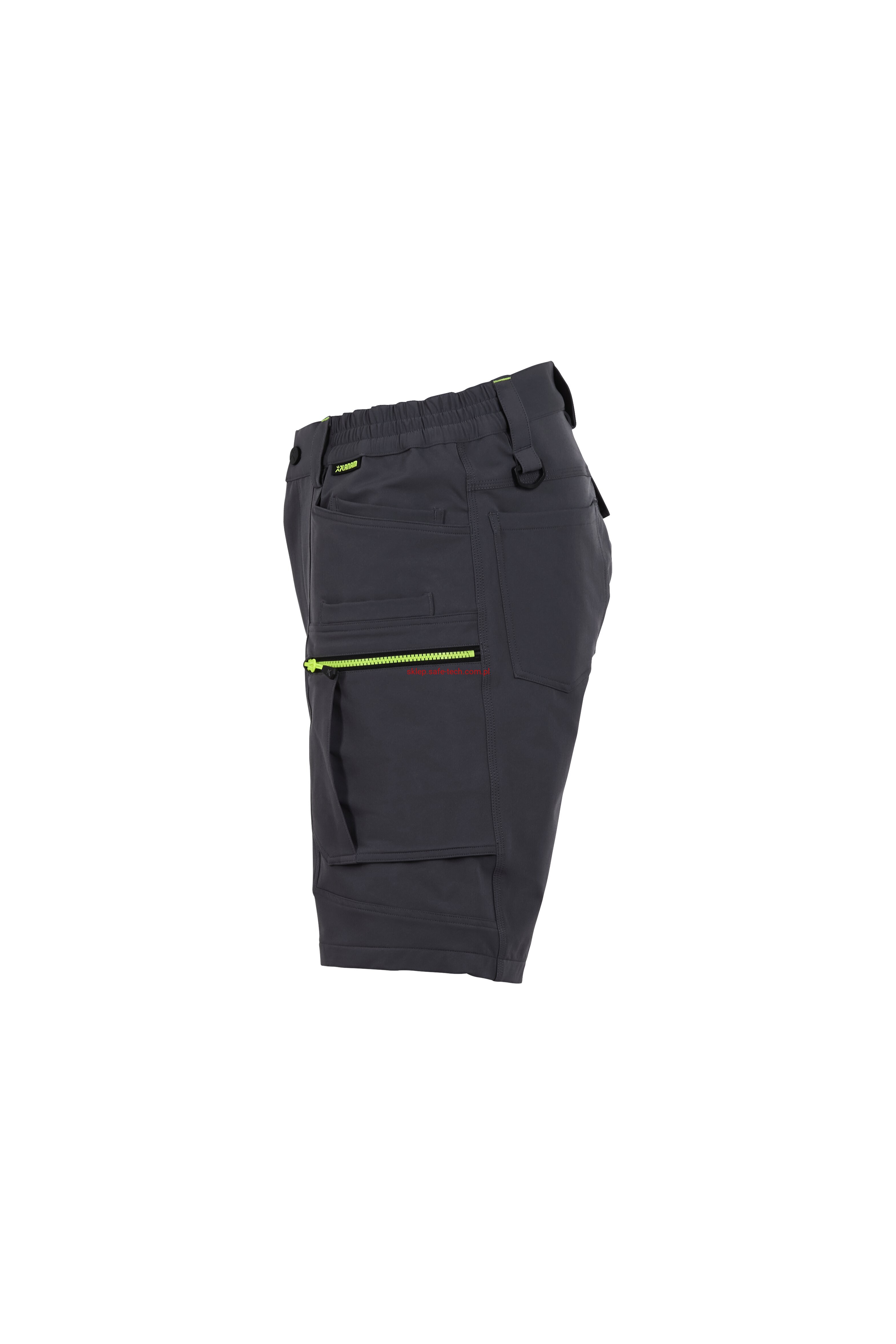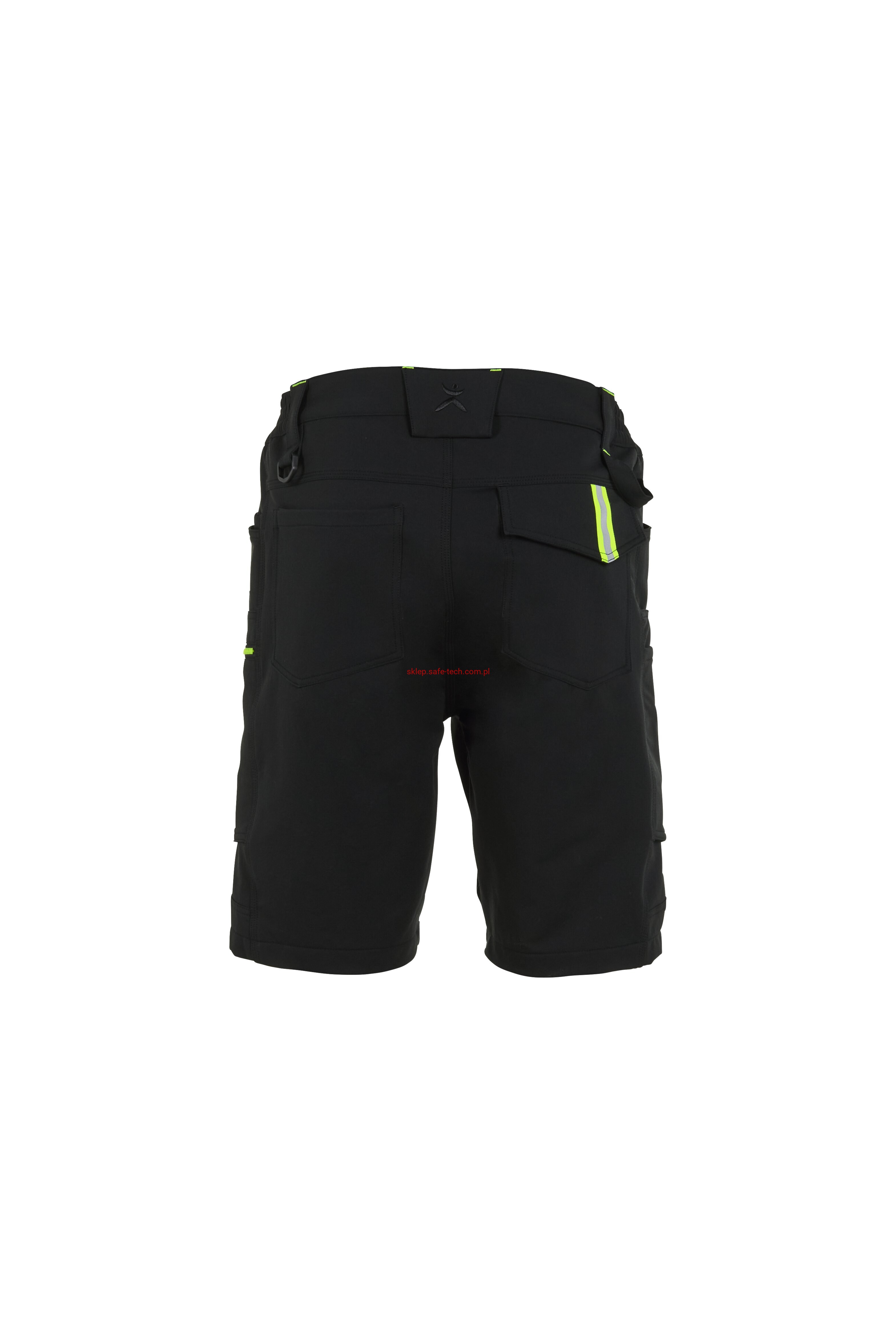 - prawa kieszeń udowa z żółtym zamkiem błyskawicznym, tylna kieszeń z patką, pas ściągnięty gumką, rozporek zamykany na zamek błyskawiczny, 5 szerokich szlufek na pasku, szlufka na młotek, odblaskowe aplikacje.