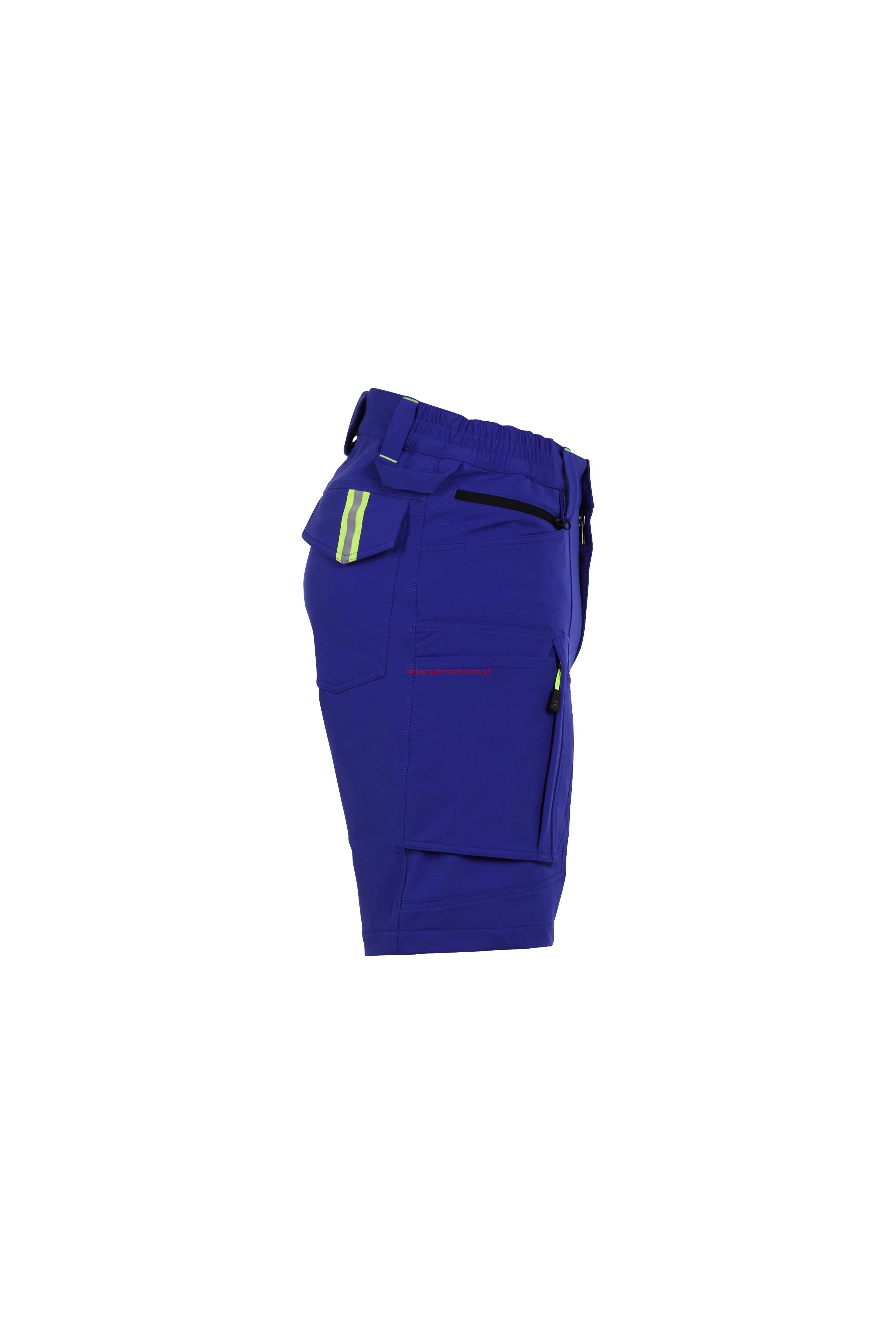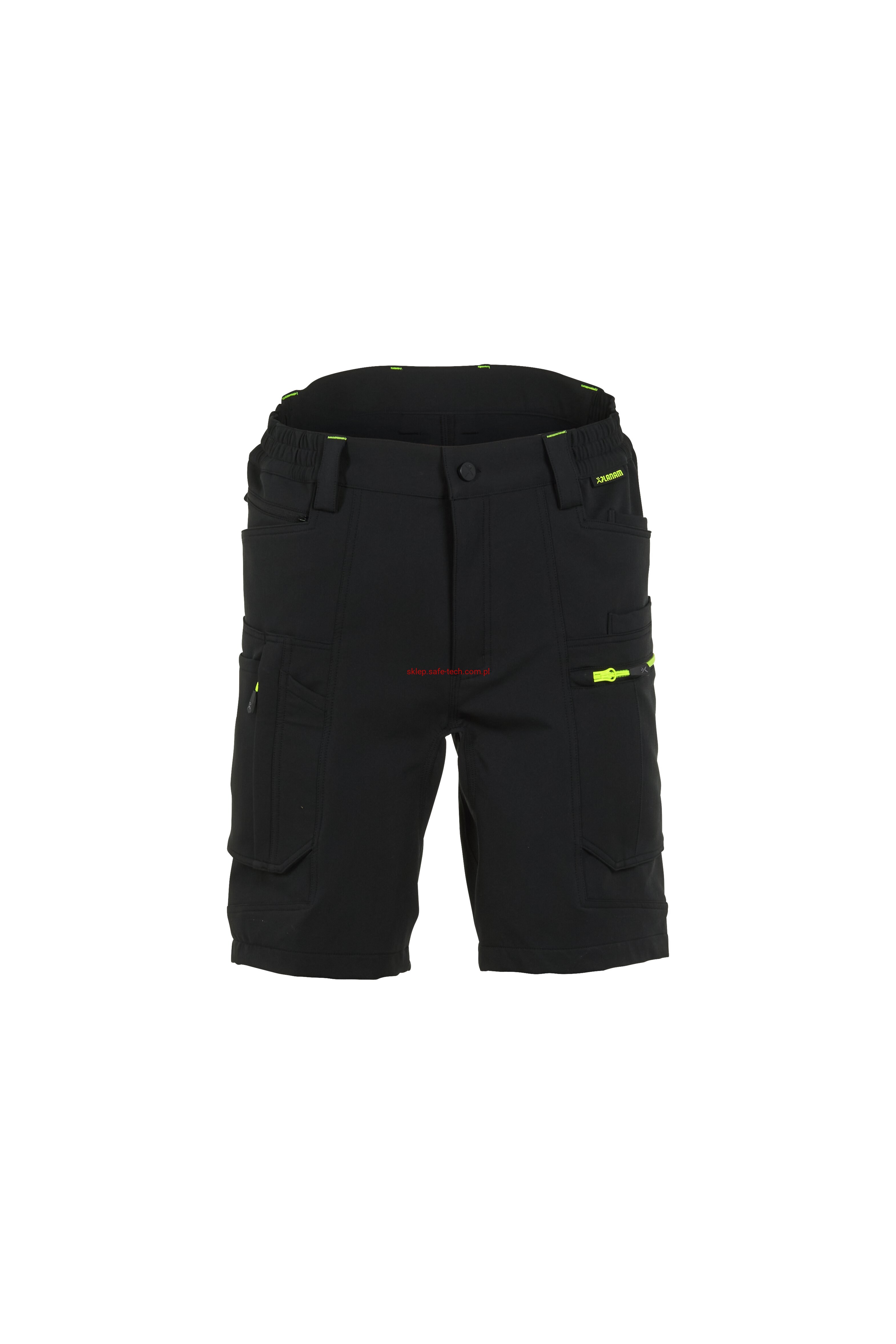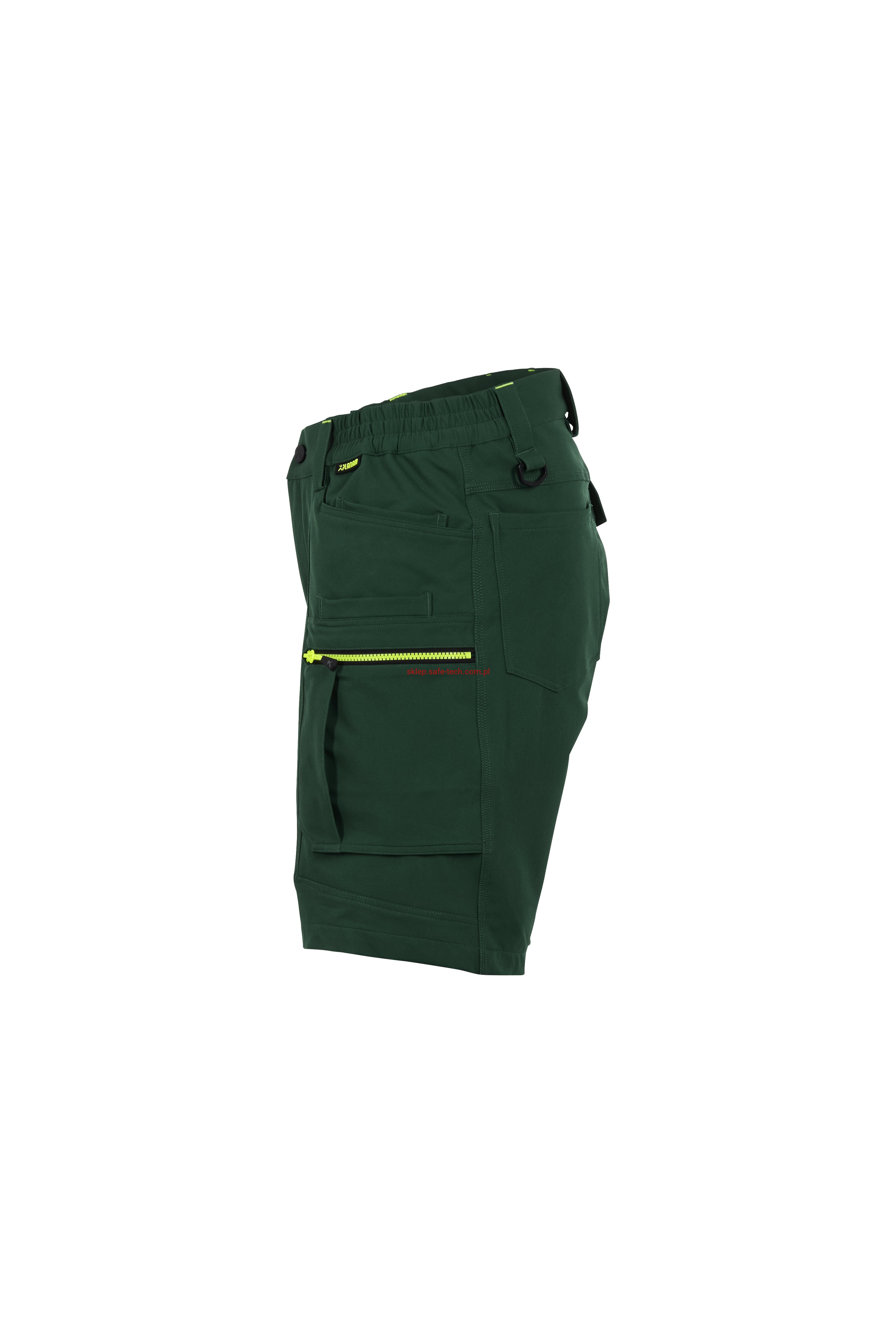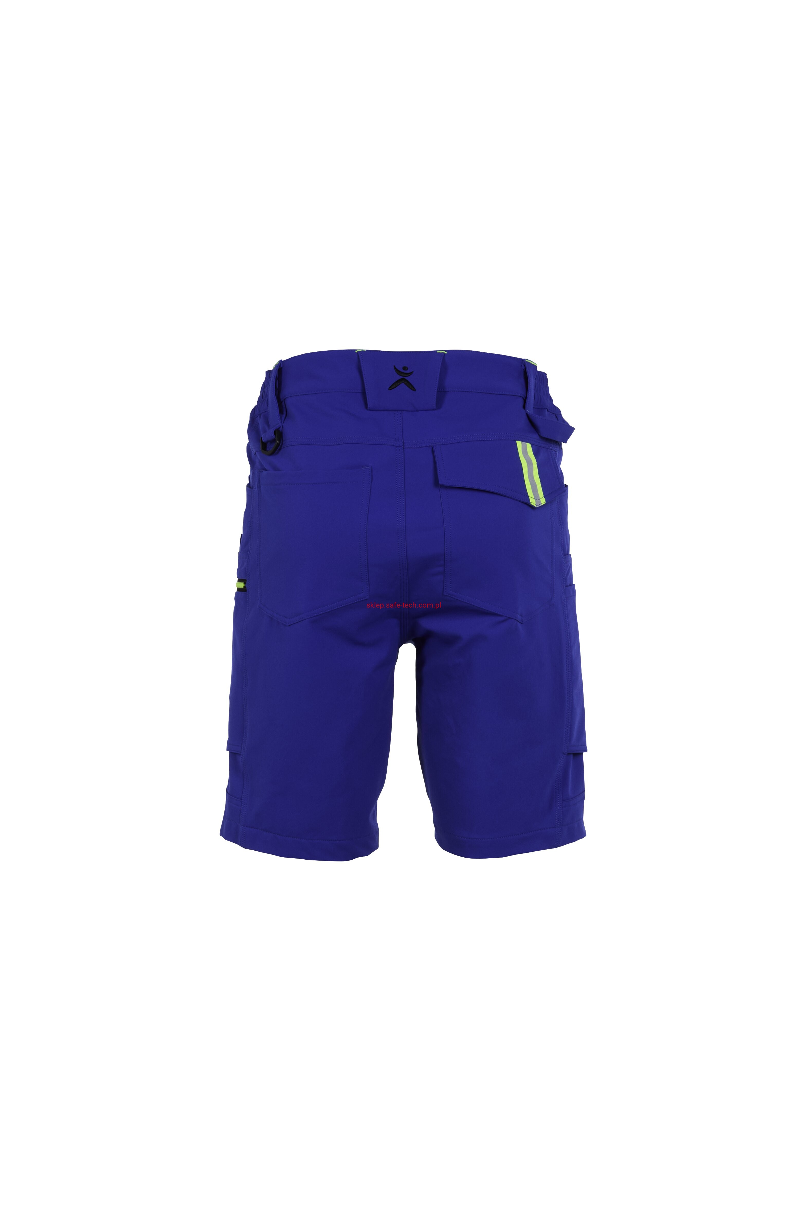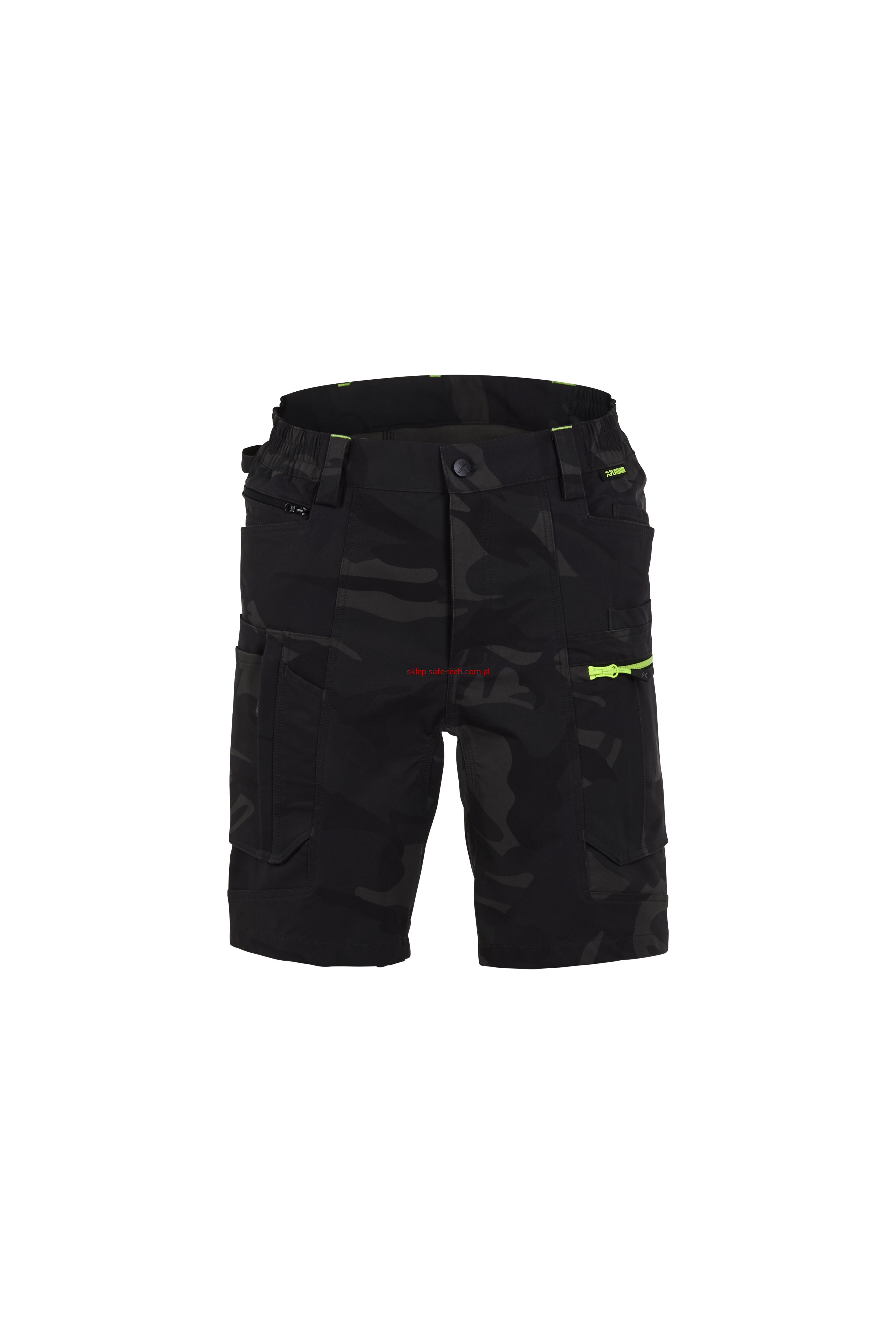 - prawa kieszeń udowa z żółtym zamkiem błyskawicznym, tylna kieszeń z patką, pas ściągnięty gumką, rozporek zamykany na zamek błyskawiczny, 5 szerokich szlufek na pasku, szlufka na młotek, odblaskowe aplikacje.