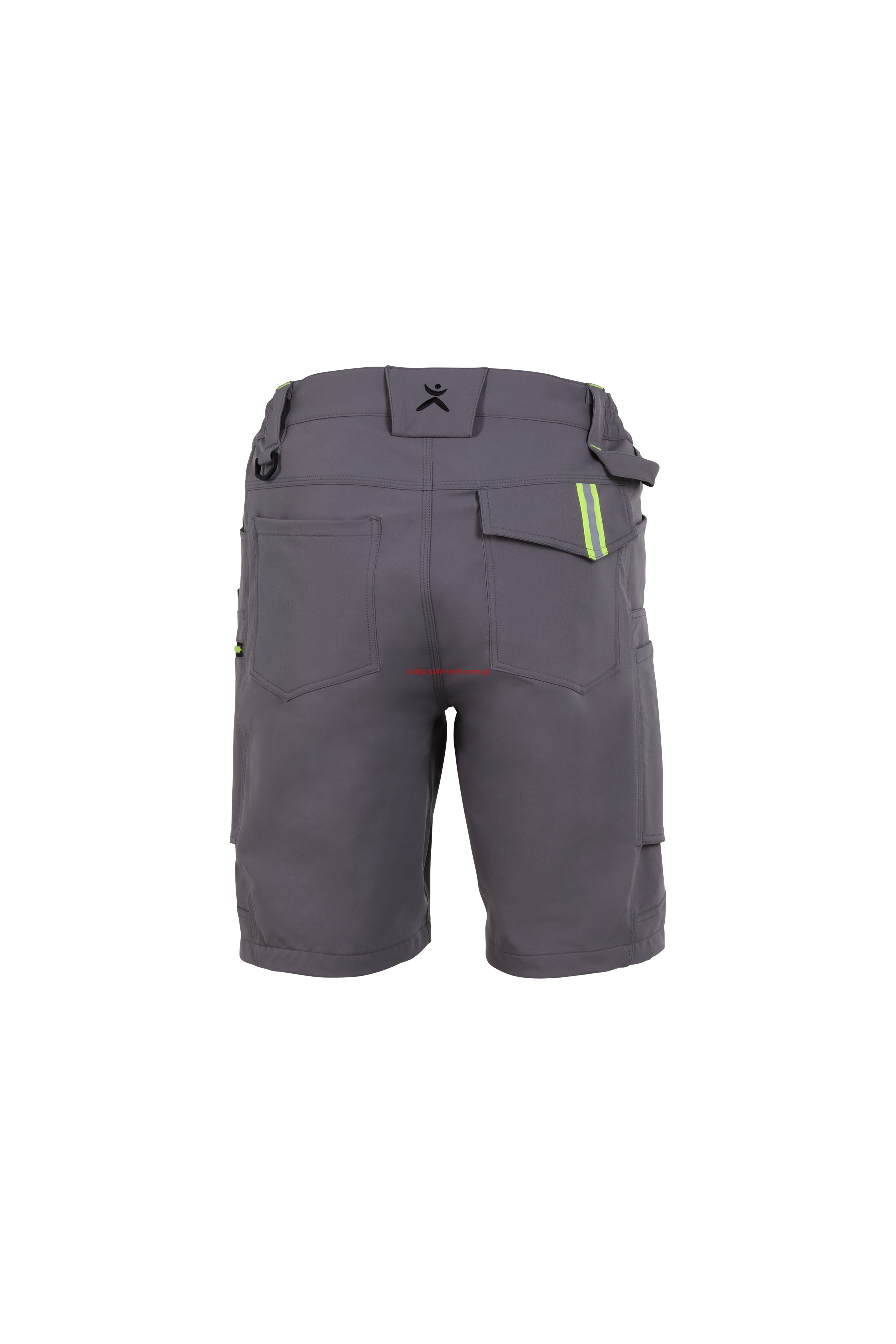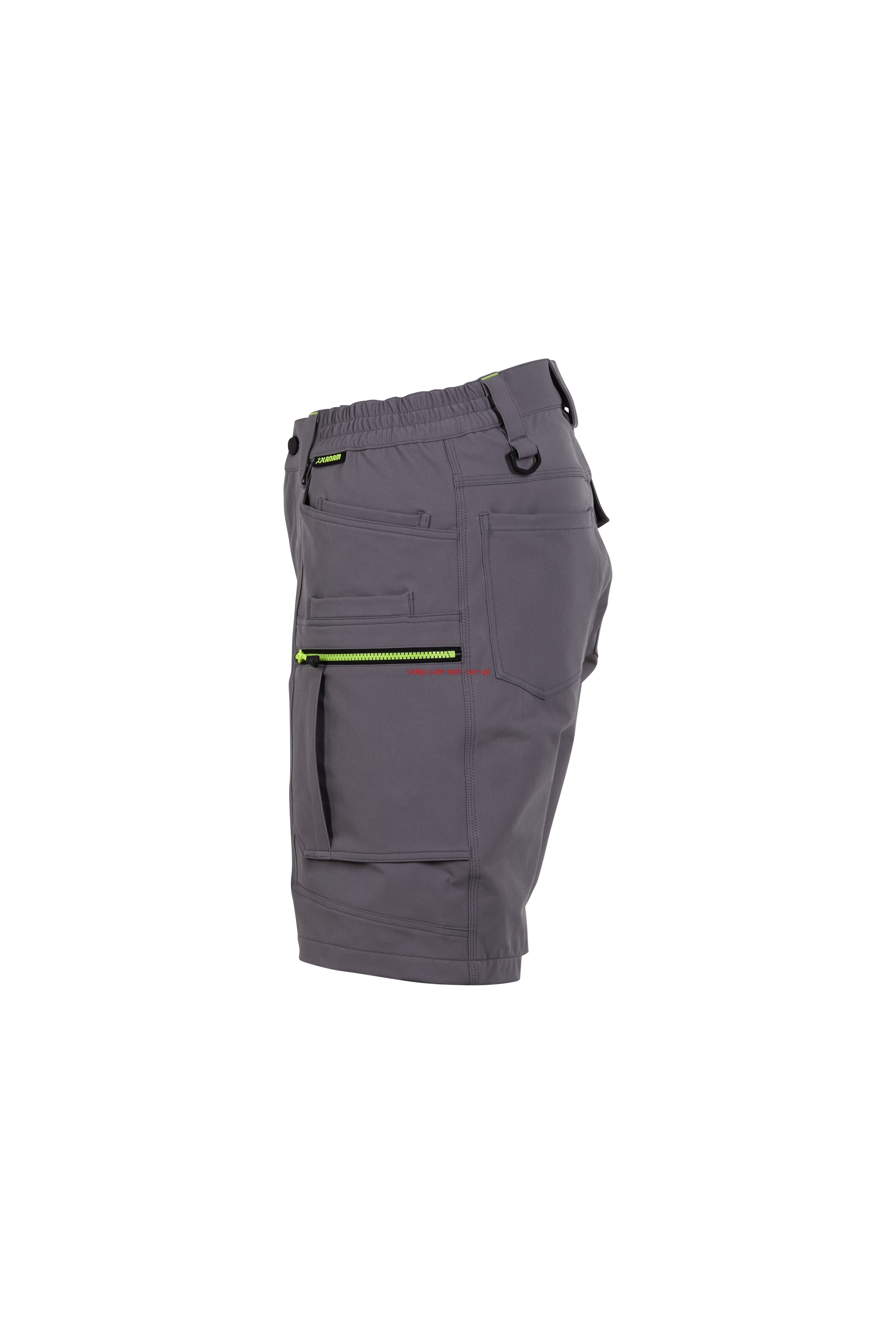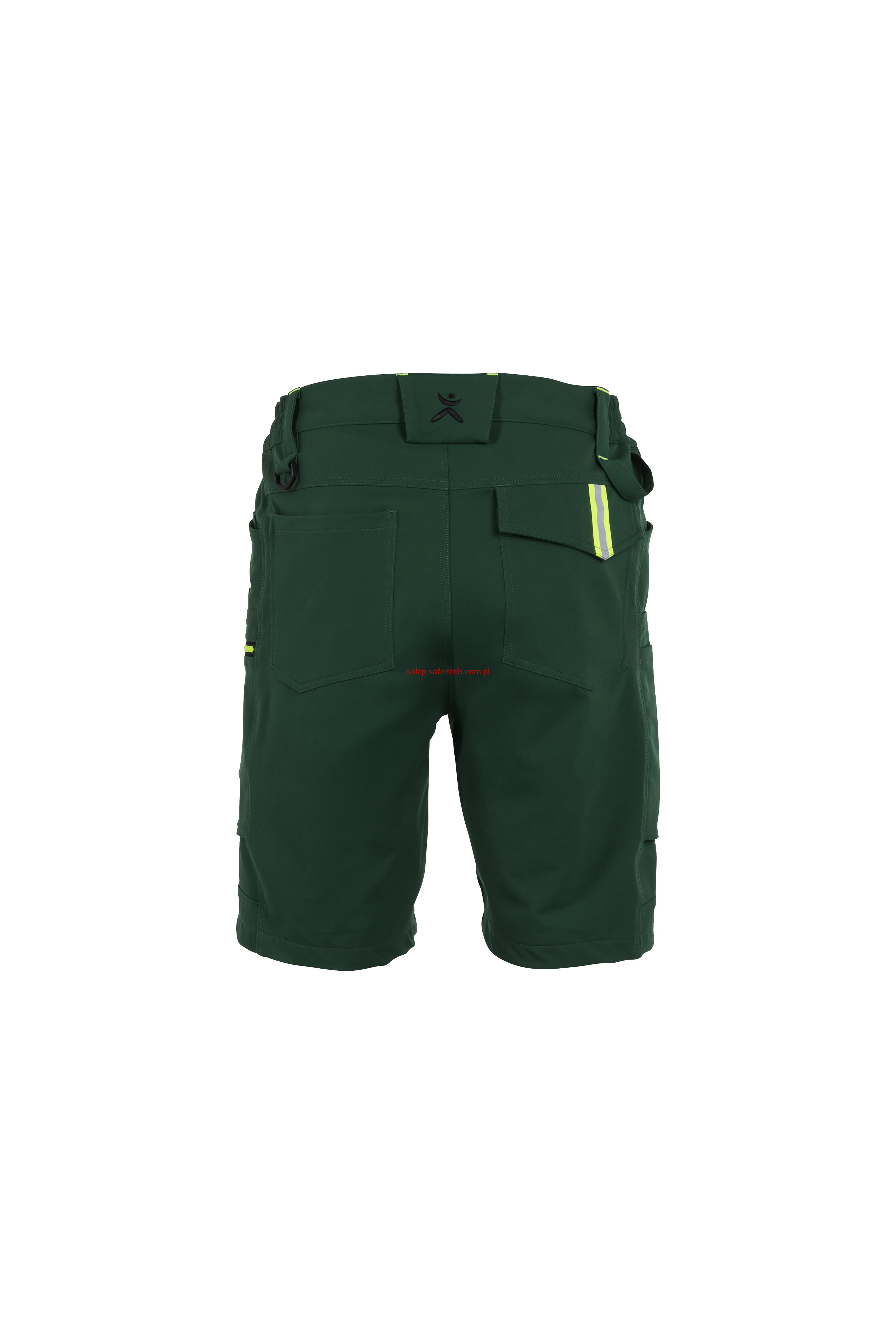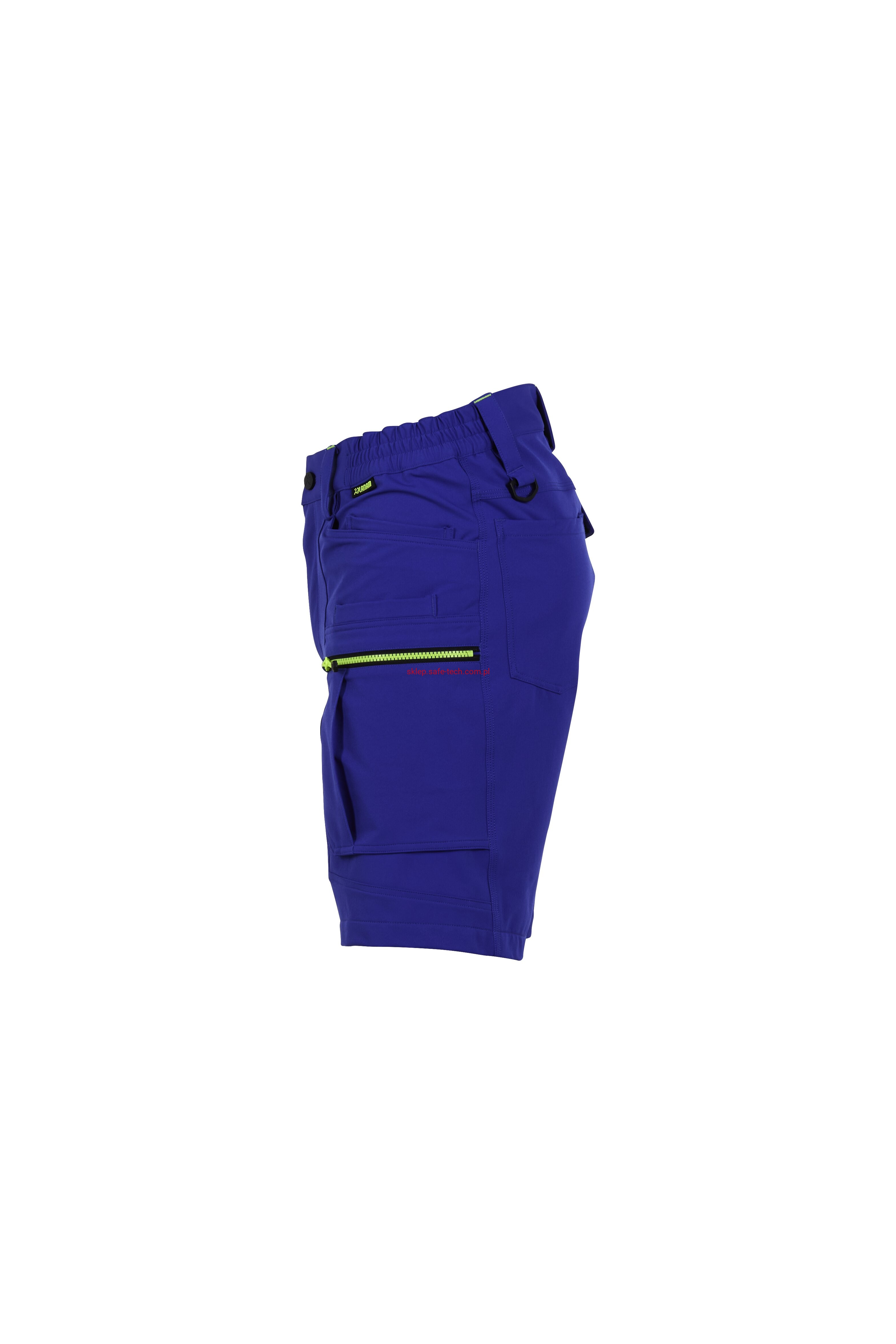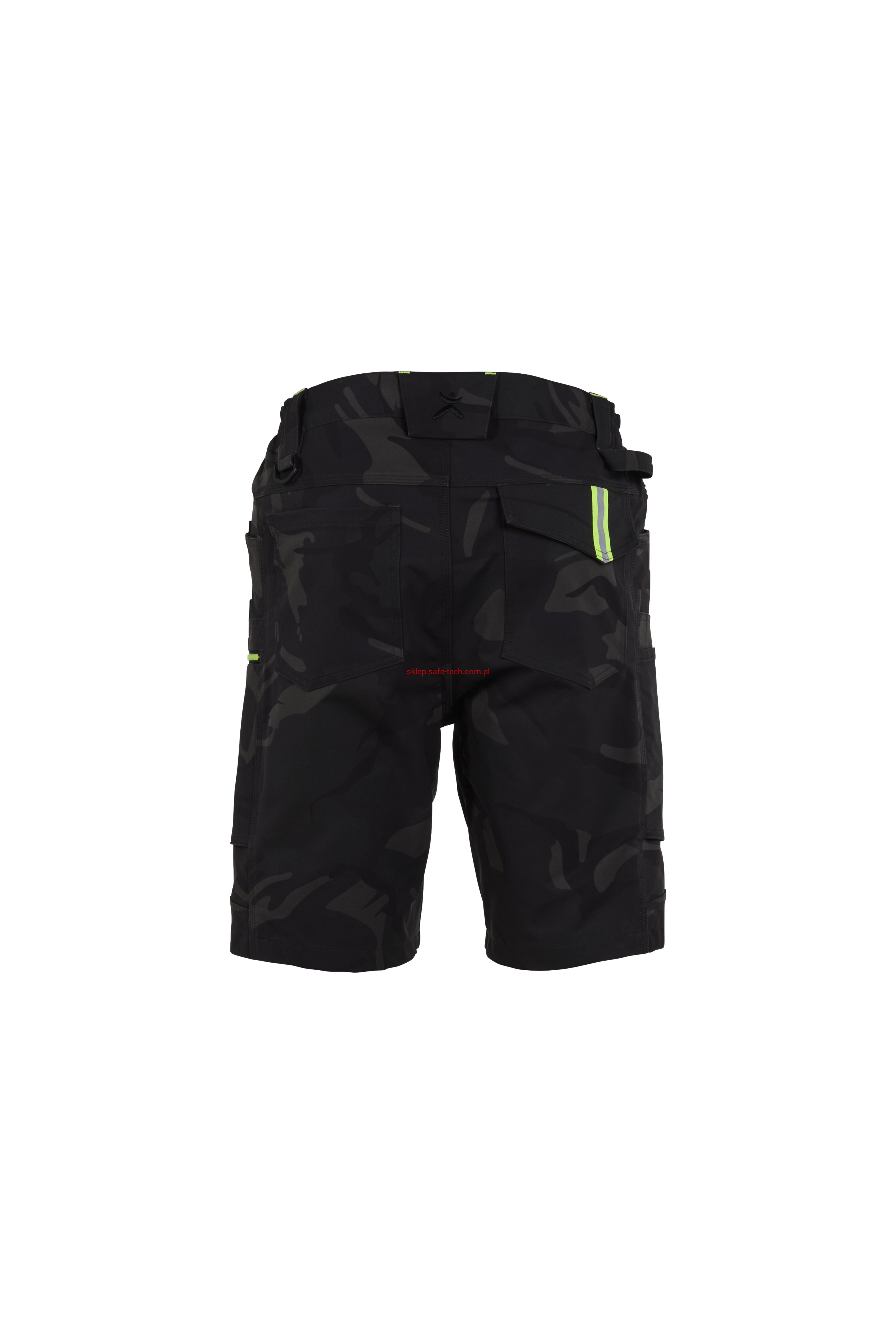 - prawa kieszeń udowa z żółtym zamkiem błyskawicznym, tylna kieszeń z patką, pas ściągnięty gumką, rozporek zamykany na zamek błyskawiczny, 5 szerokich szlufek na pasku, szlufka na młotek, odblaskowe aplikacje.