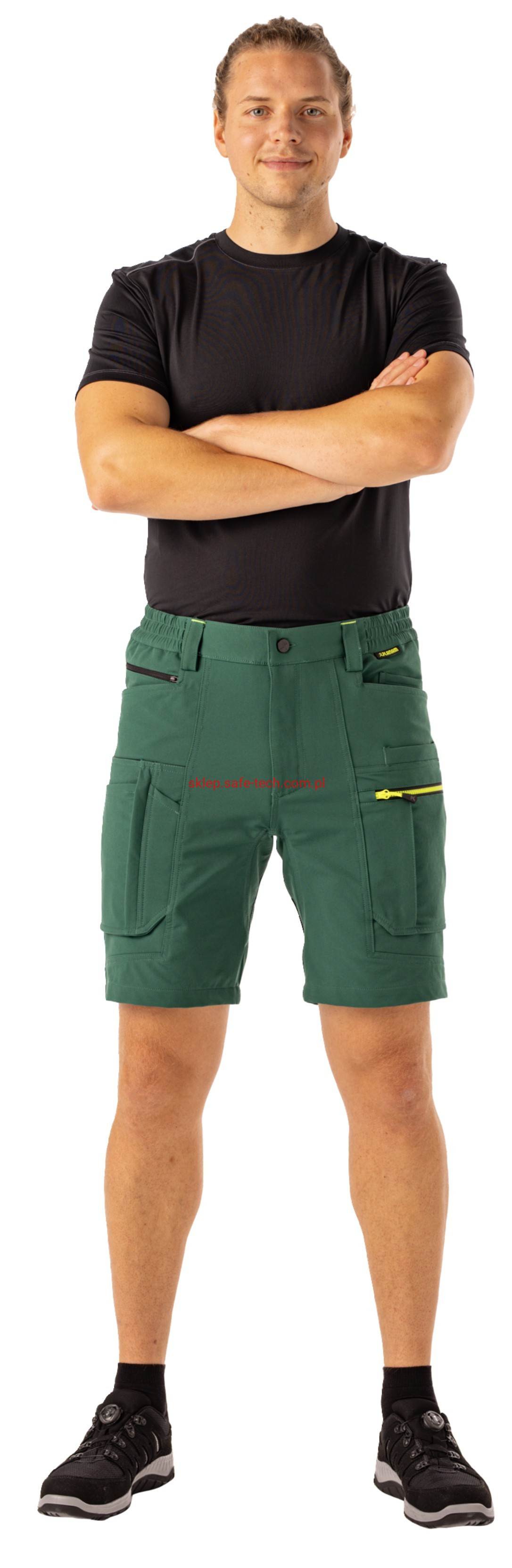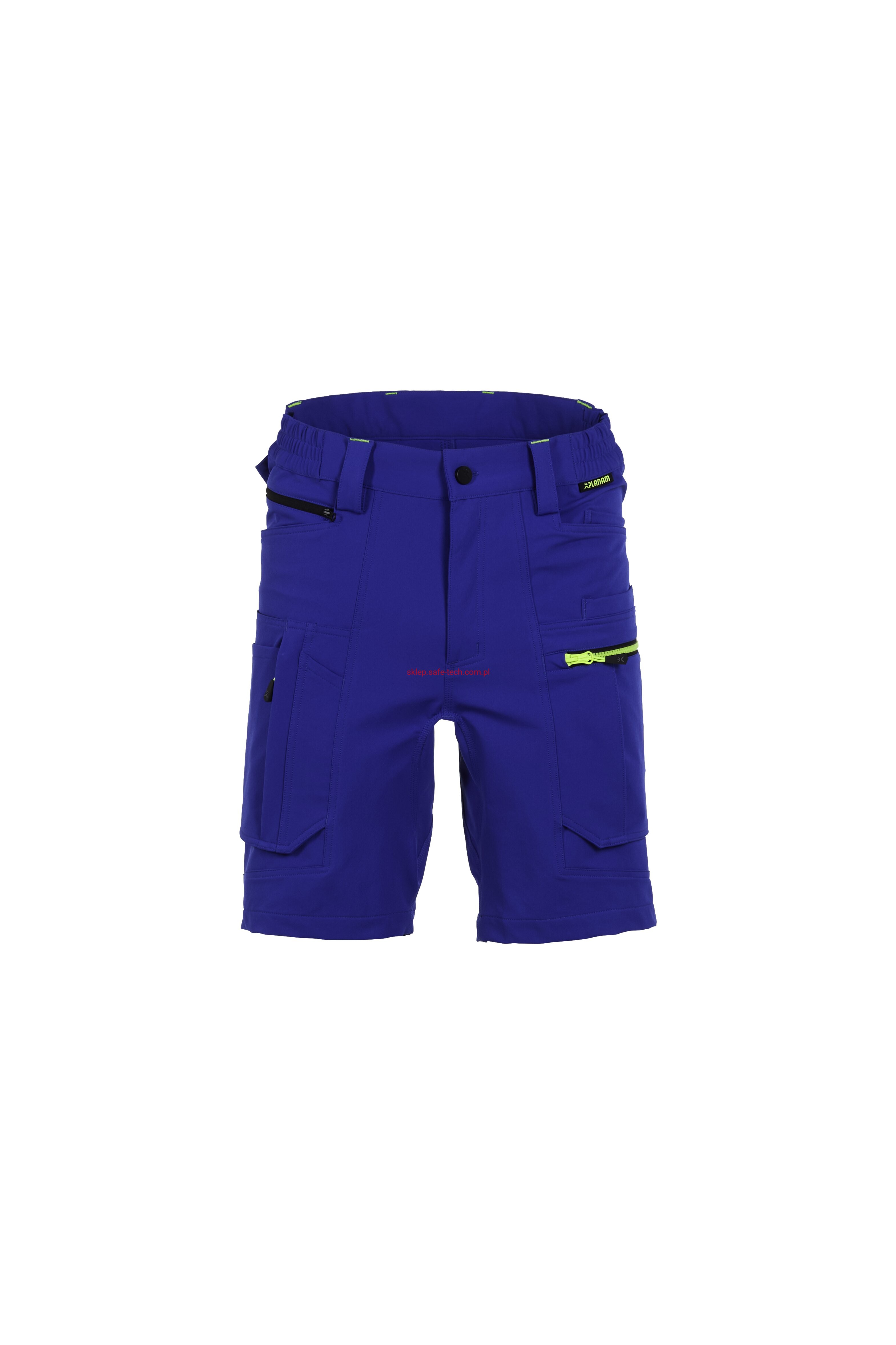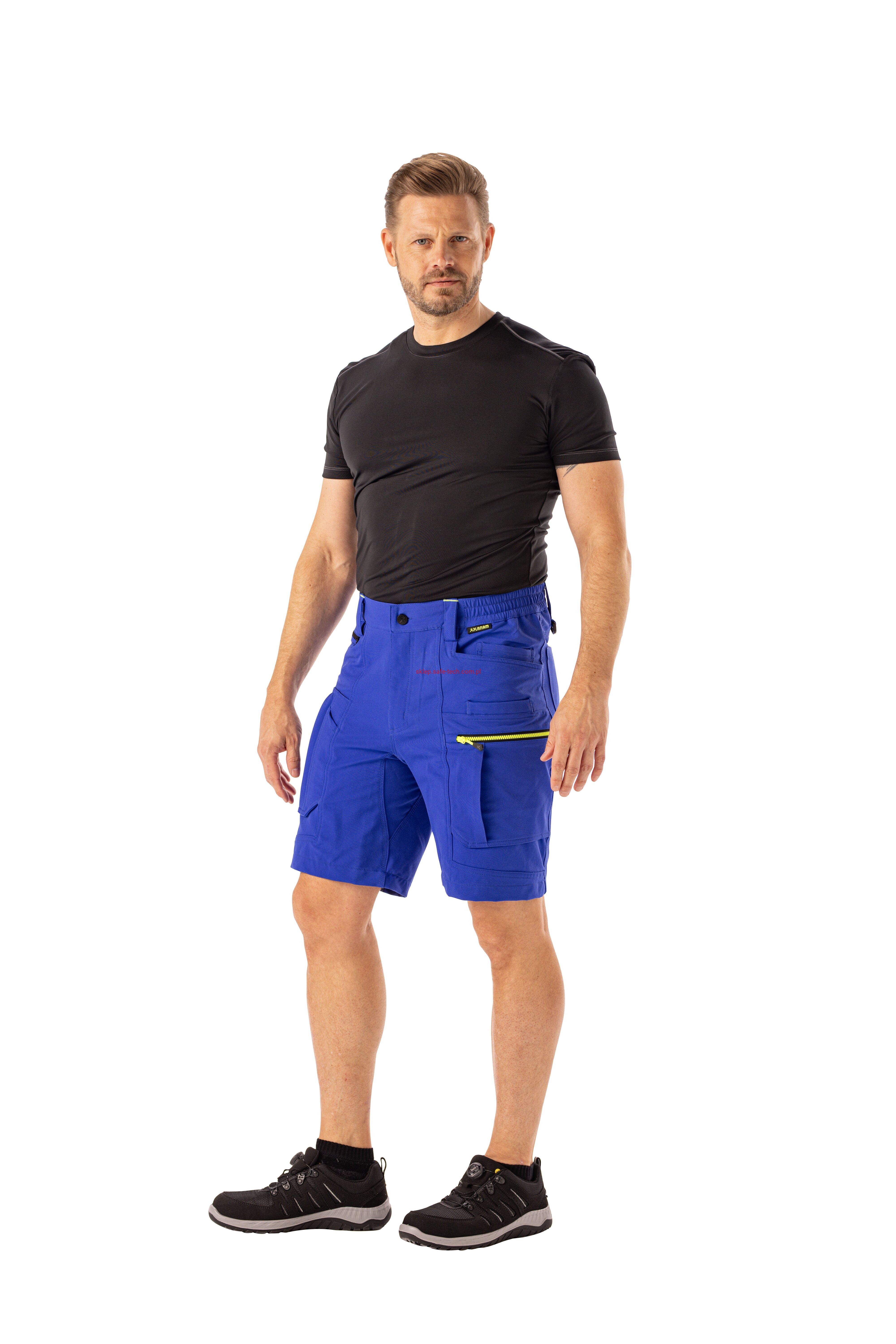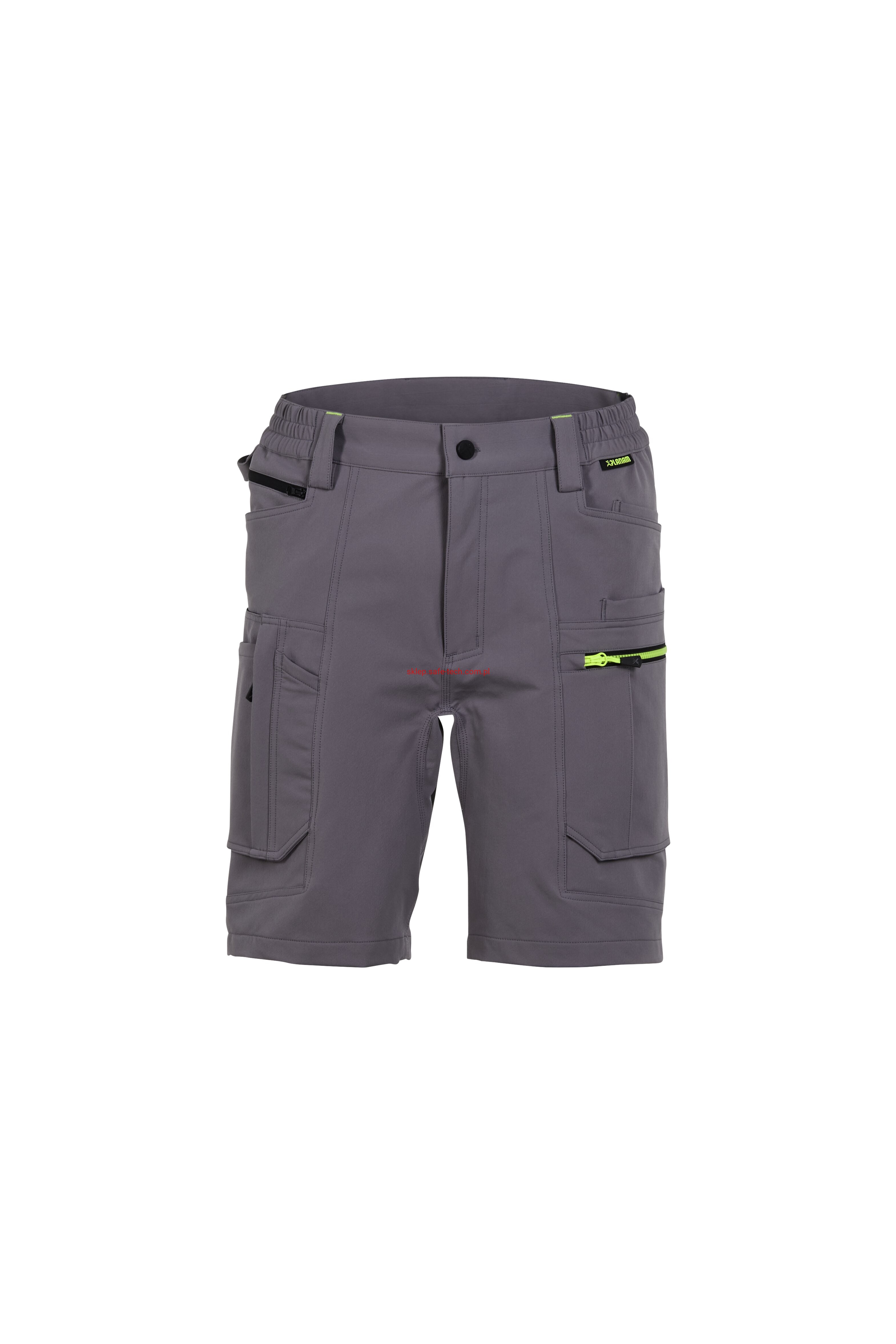 - prawa kieszeń udowa z żółtym zamkiem błyskawicznym, tylna kieszeń z patką, pas ściągnięty gumką, rozporek zamykany na zamek błyskawiczny, 5 szerokich szlufek na pasku, szlufka na młotek, odblaskowe aplikacje.
