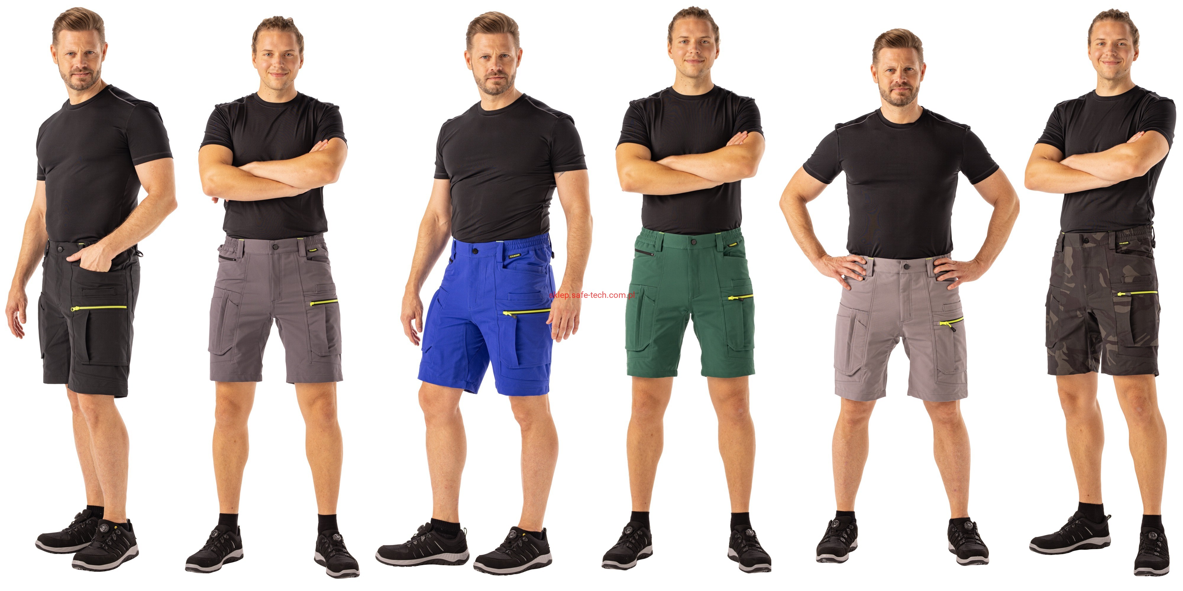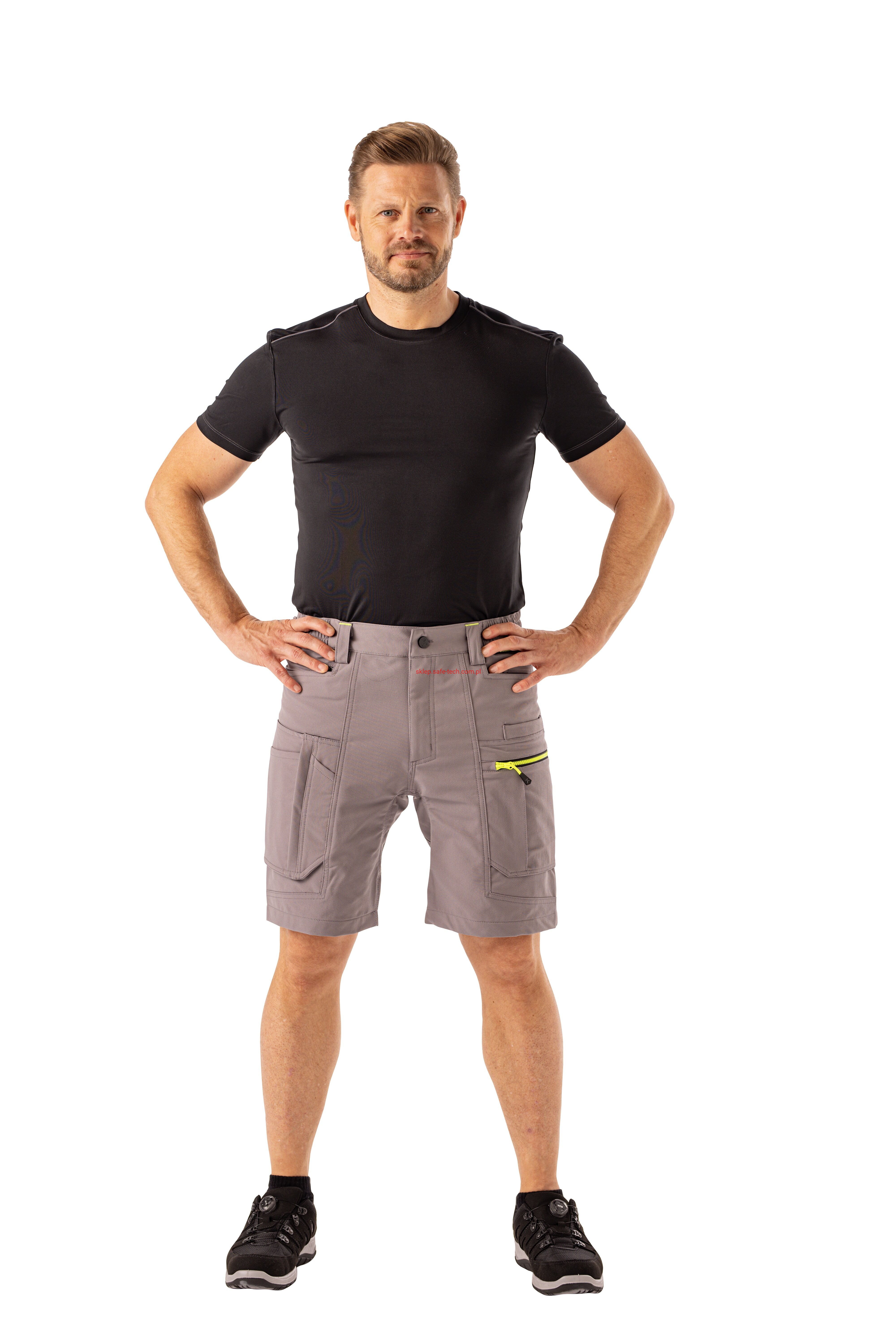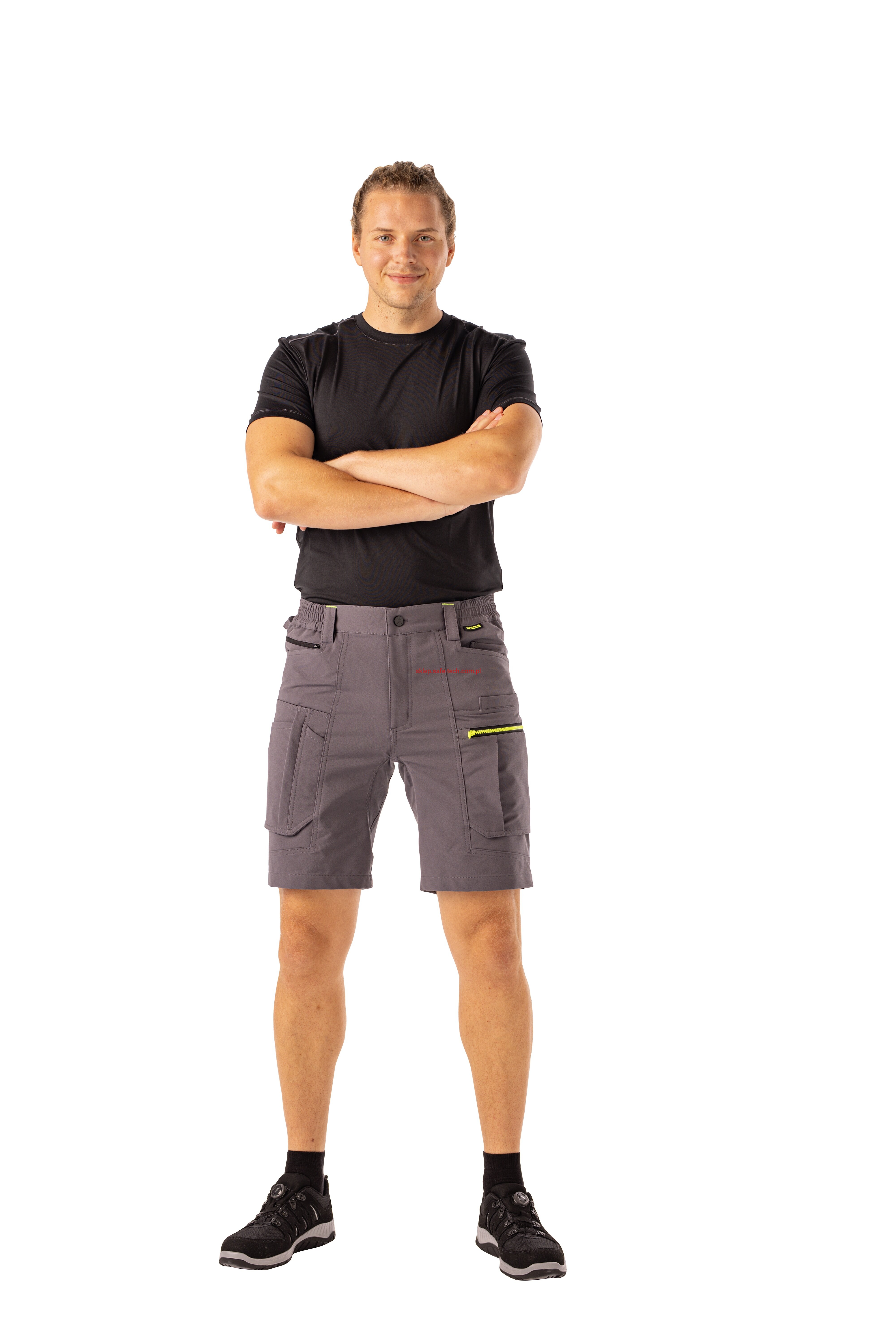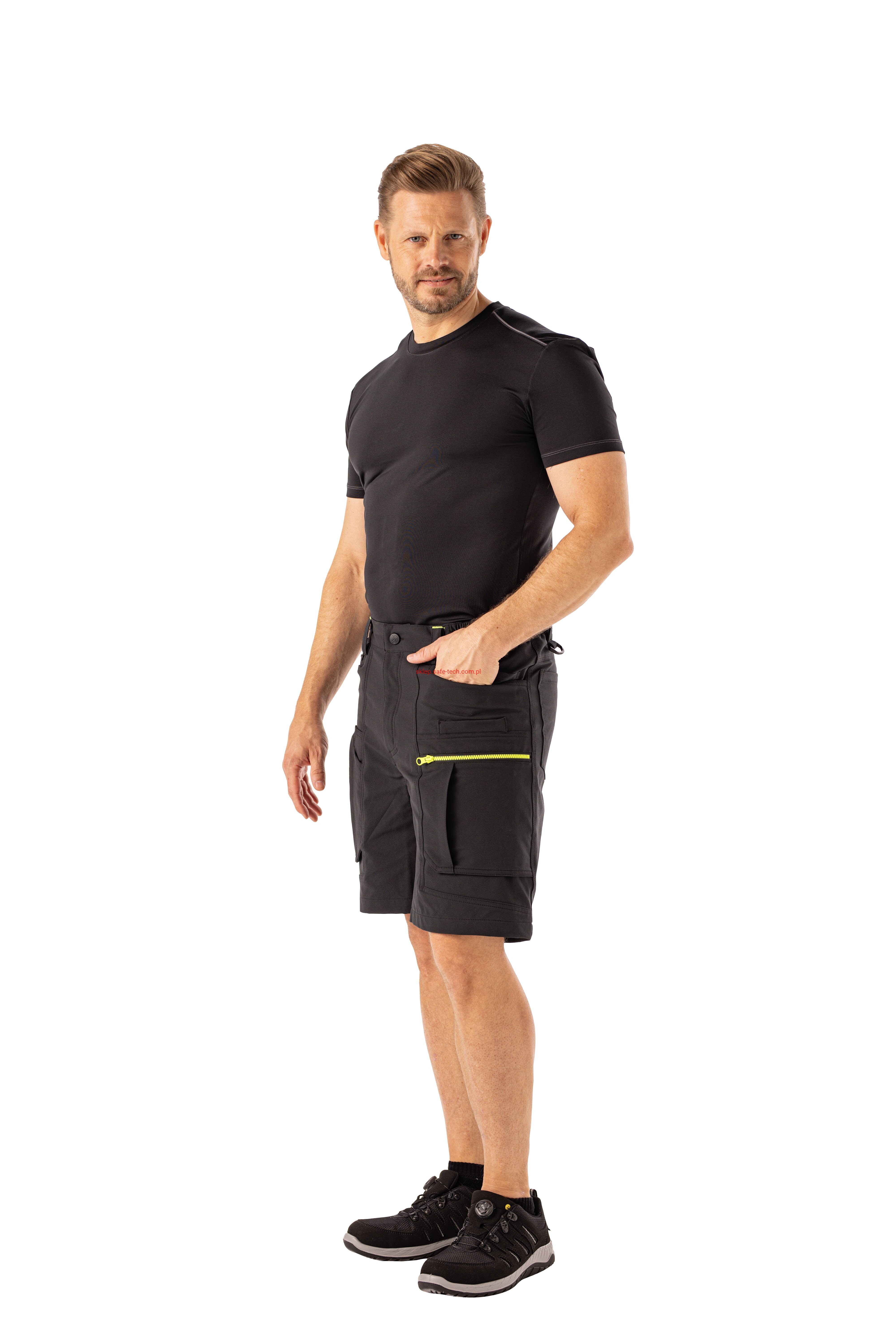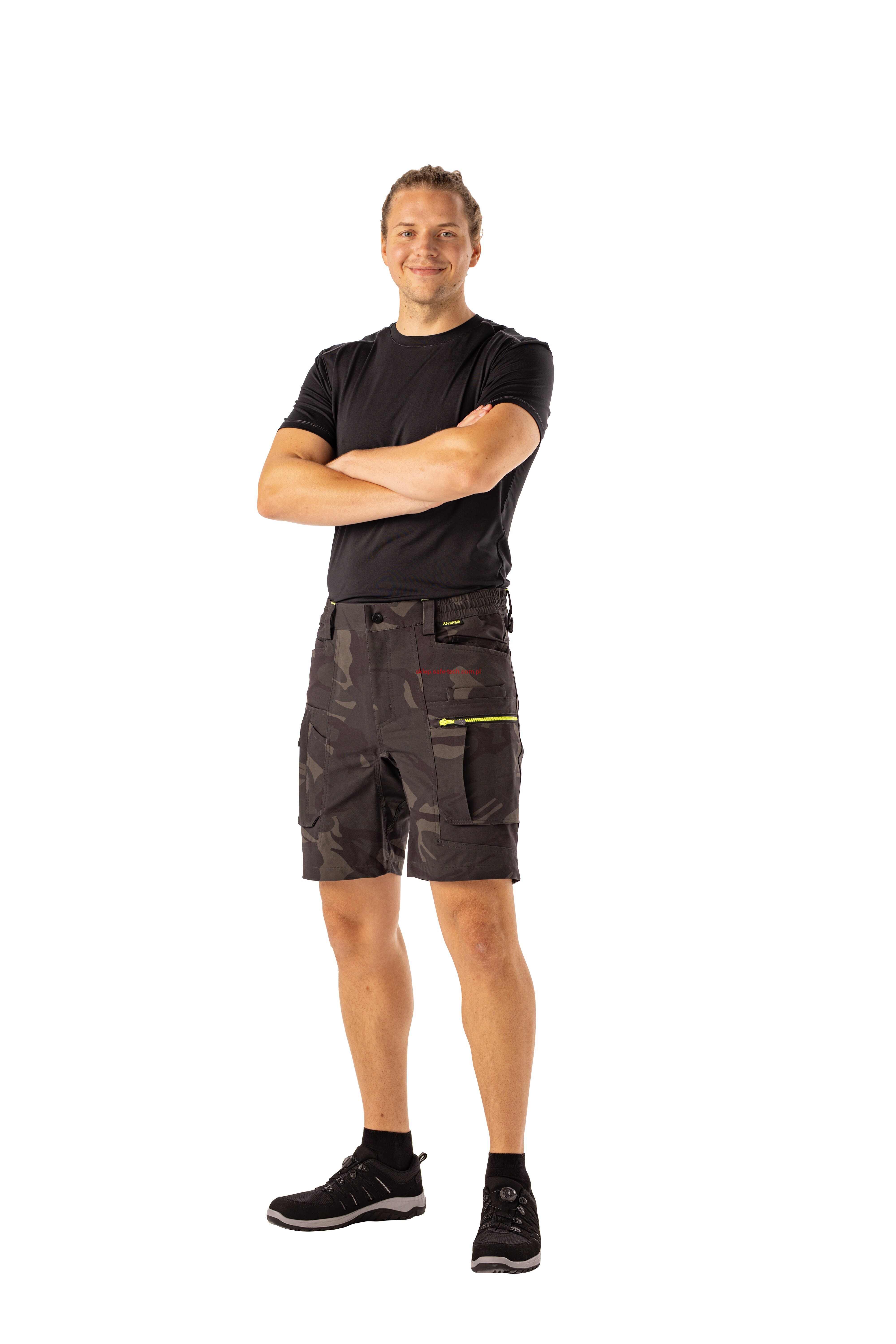 - prawa kieszeń udowa z żółtym zamkiem błyskawicznym, tylna kieszeń z patką, pas ściągnięty gumką, rozporek zamykany na zamek błyskawiczny, 5 szerokich szlufek na pasku, szlufka na młotek, odblaskowe aplikacje.