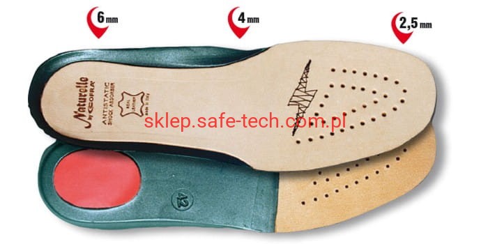 Wyściółki do butów NATURELLE włoskiej firmy COFRA, antyelektrostatyczne (dzięki przeszyciom z włókien przewodzących), dziurkowane. Wykonane ze skóry oraz anatomicznie ukształtowanego EVA, w pięcie miękka wstawka zapewniająca dobrą absorbcję uderzeń. Anatomiczne o zróżnicowanej grubości (6 mm przy pięcie, 4 mm w części środkowej i 2,5 mm przy palcach).